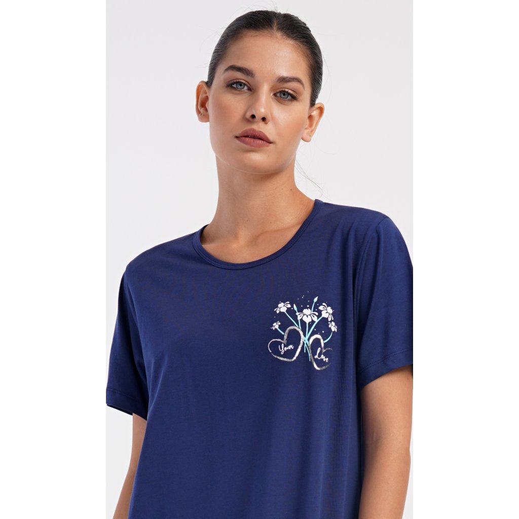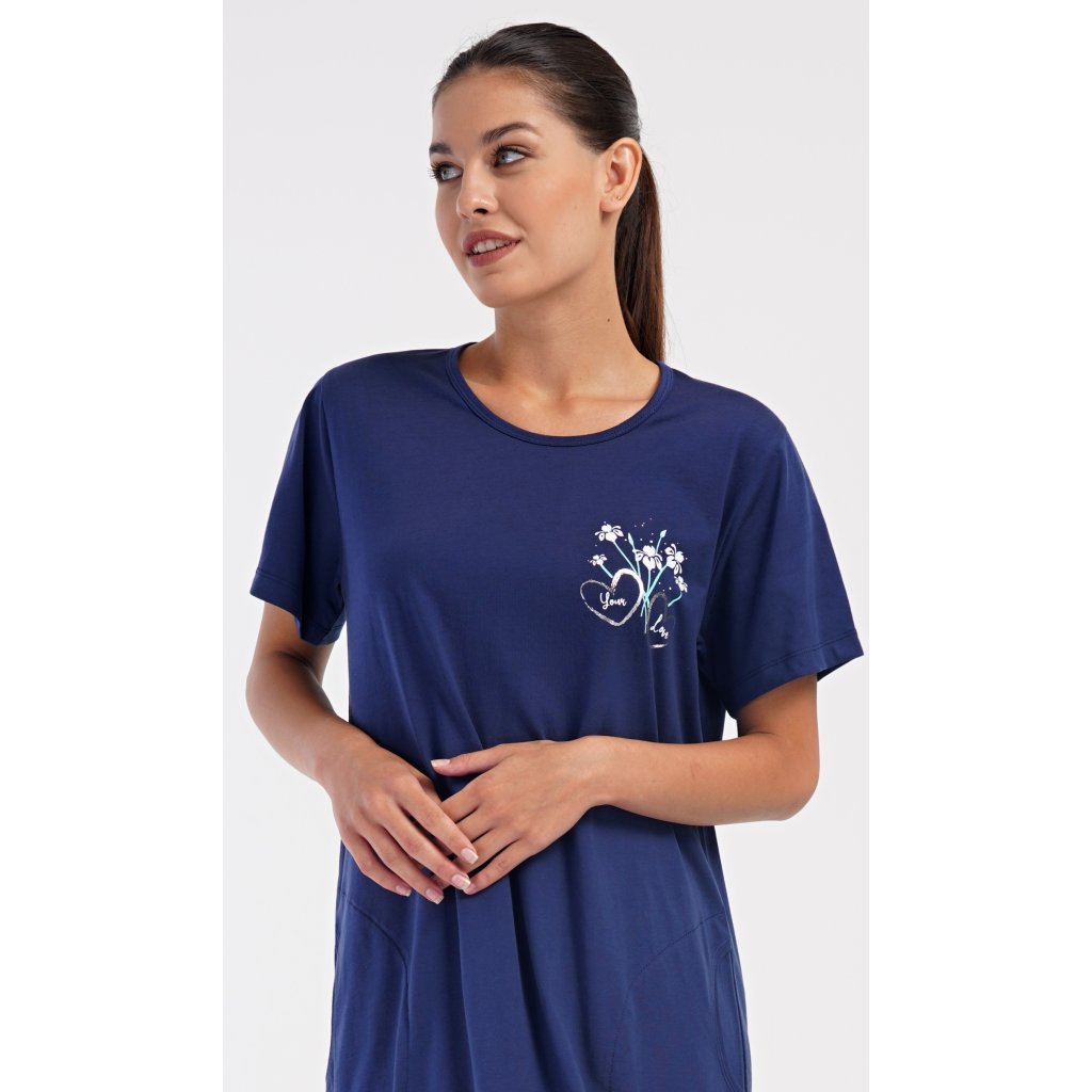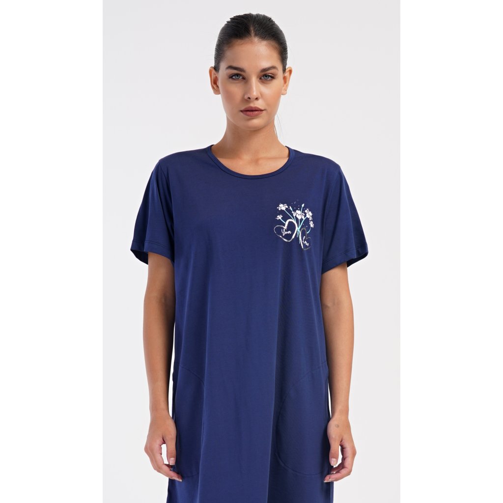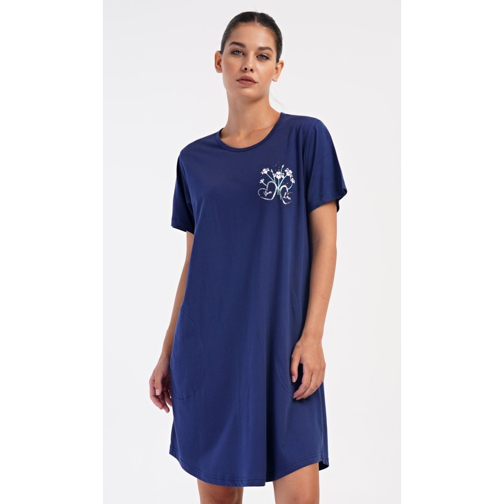 Dámské bavlněné domácí šaty s krátkým rukávem Janette. Domácí jednobarevné šaty s kulatým výstřihem a kapsami zdobí na hrudi obrázek s květinovým motivem. Použitý bavlněný materiál je příjemný a poddajný na dotek. Šaty jsou pohodlné, vhodné na spaní i na denní nošení.
