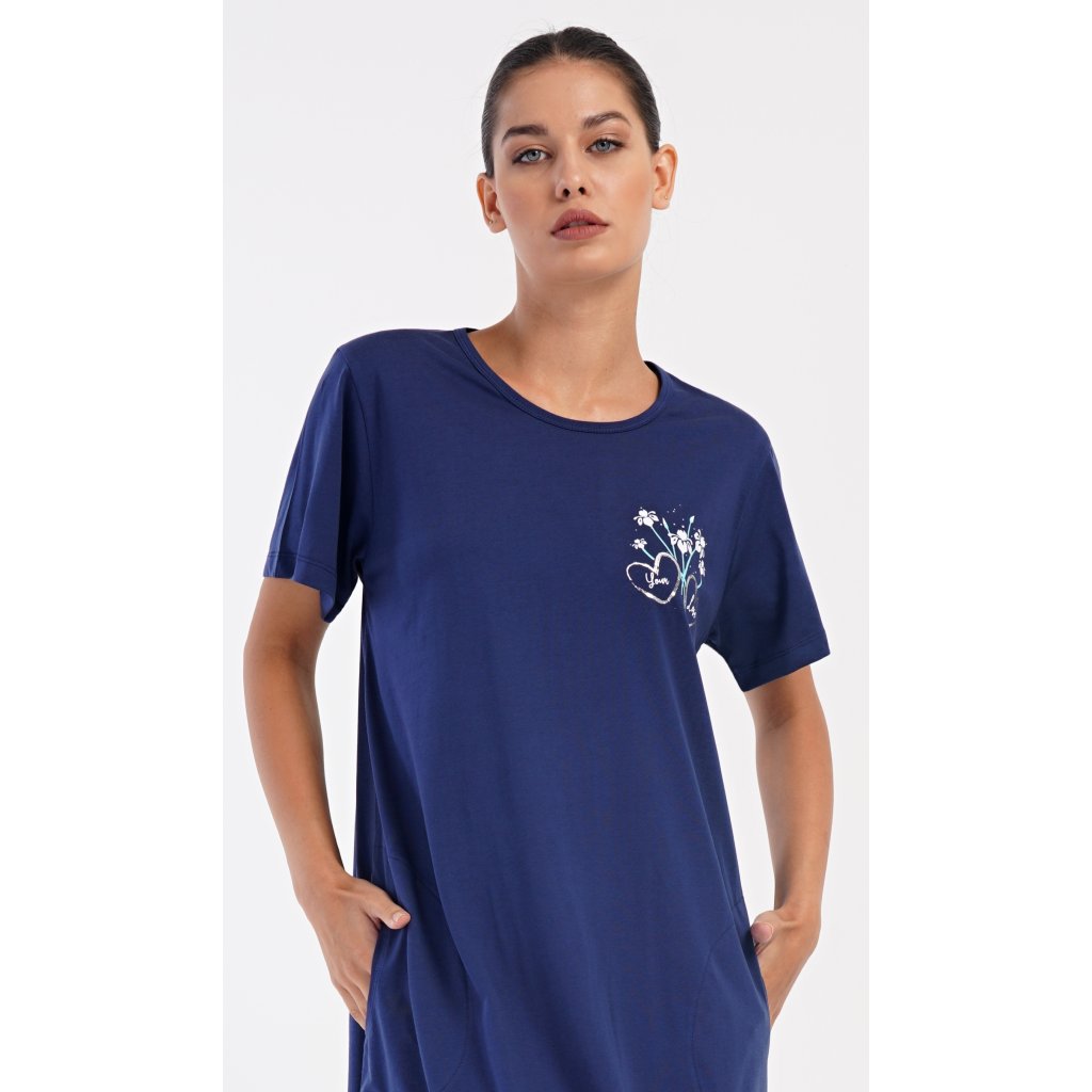 Dámské bavlněné domácí šaty s krátkým rukávem Janette. Domácí jednobarevné šaty s kulatým výstřihem a kapsami zdobí na hrudi obrázek s květinovým motivem. Použitý bavlněný materiál je příjemný a poddajný na dotek. Šaty jsou pohodlné, vhodné na spaní i na denní nošení.