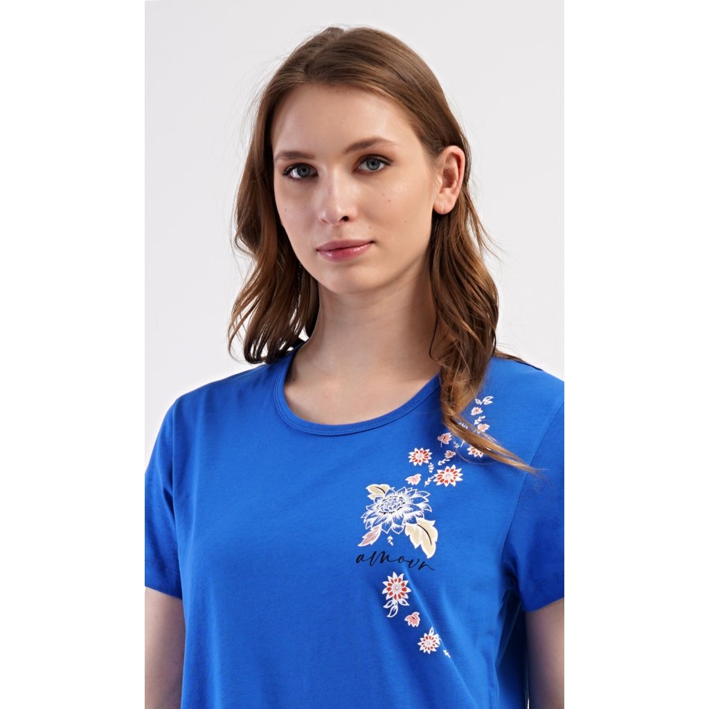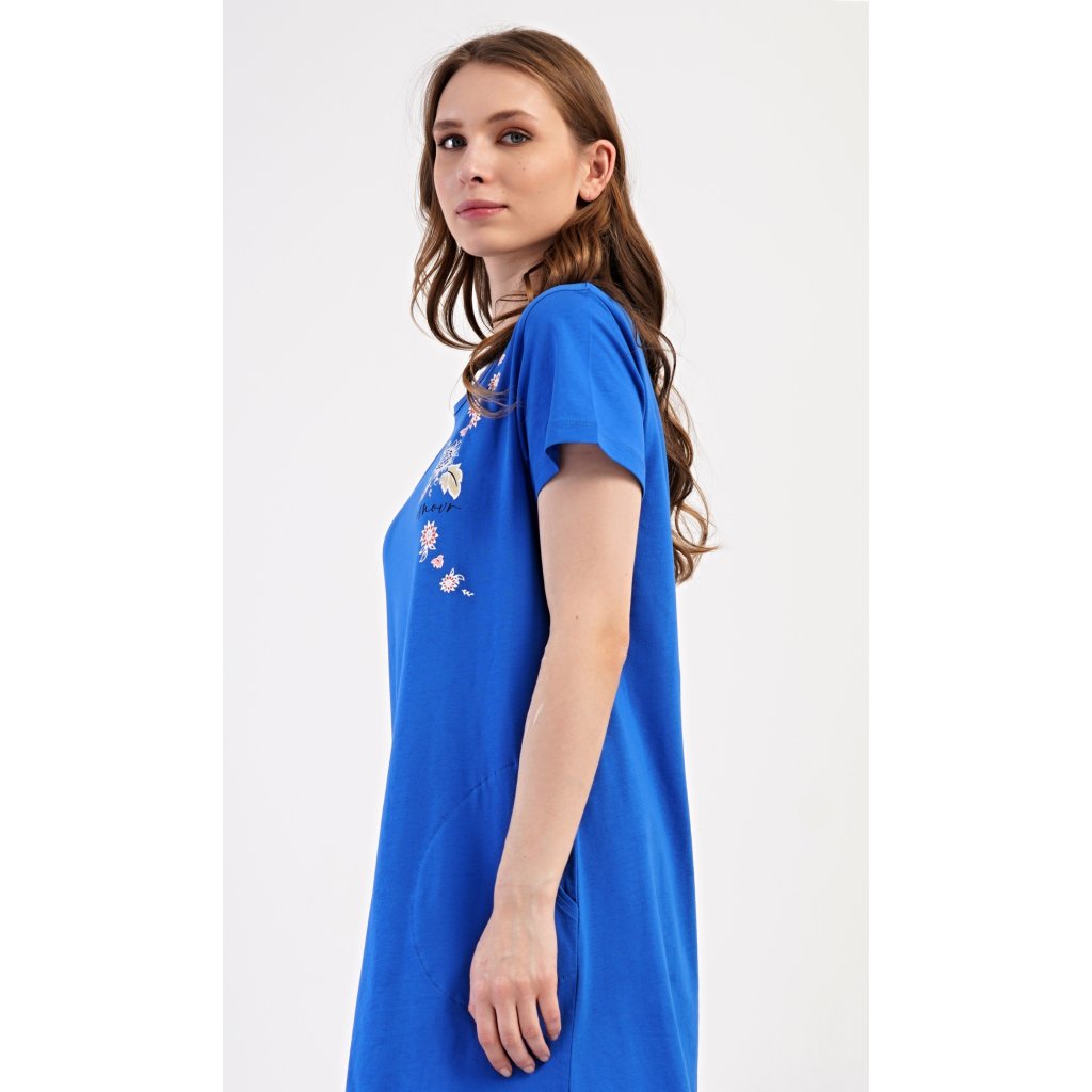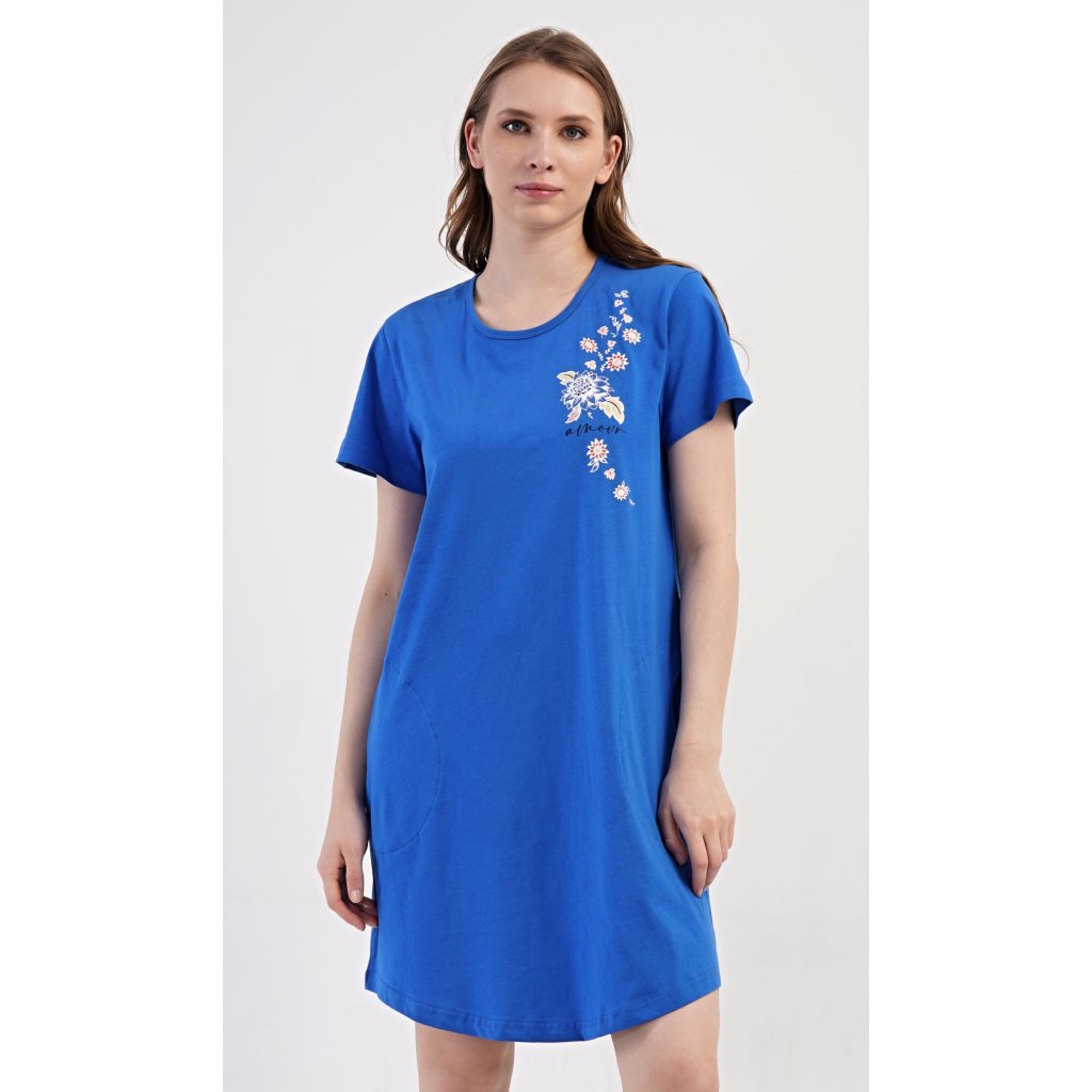 Dámské bavlněné domácí šaty s krátkým rukávem Květy. Domácí jednobarevné šaty s kulatým výstřihem a kapsami zdobí na hrudi květinový motiv a nápys 'Amour'. Použitý bavlněný materiál je příjemný a poddajný na dotek. Šaty jsou pohodlné, vhodné na spaní i na denní nošení.