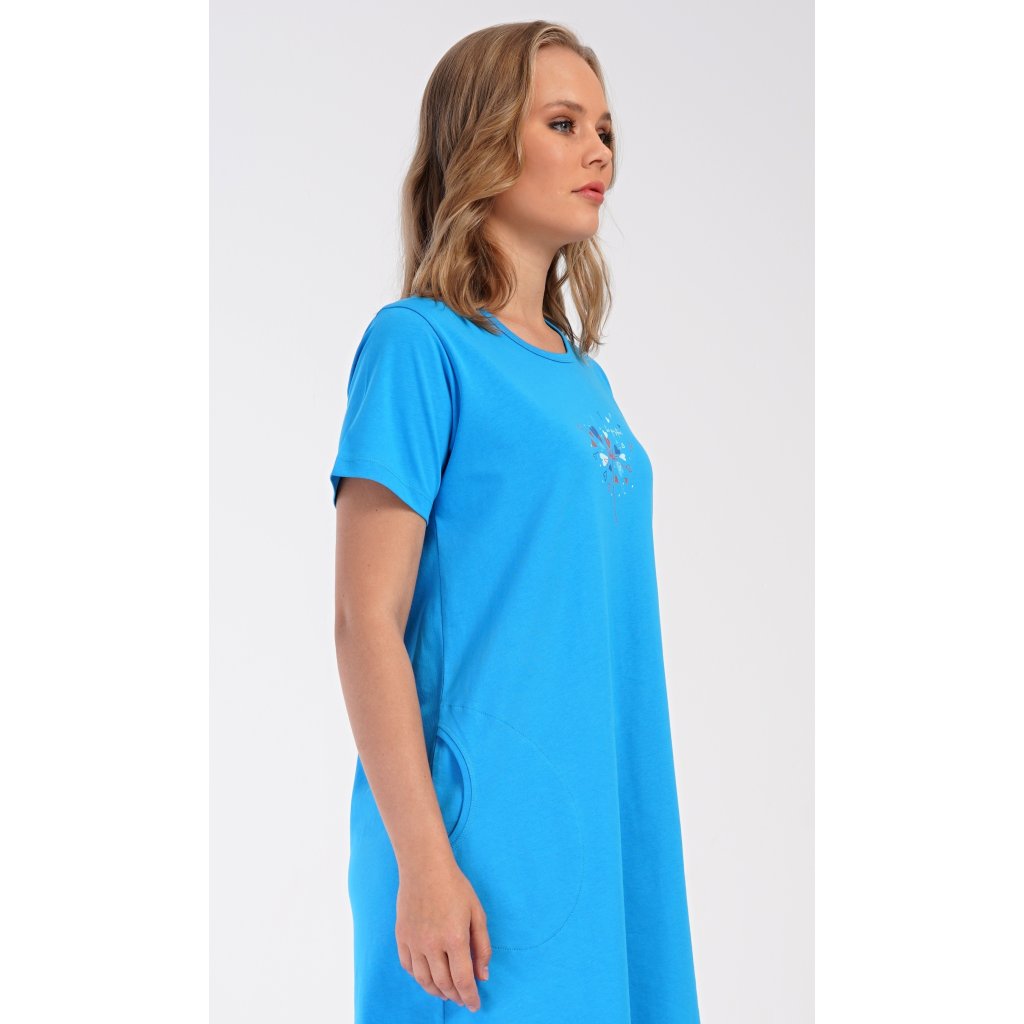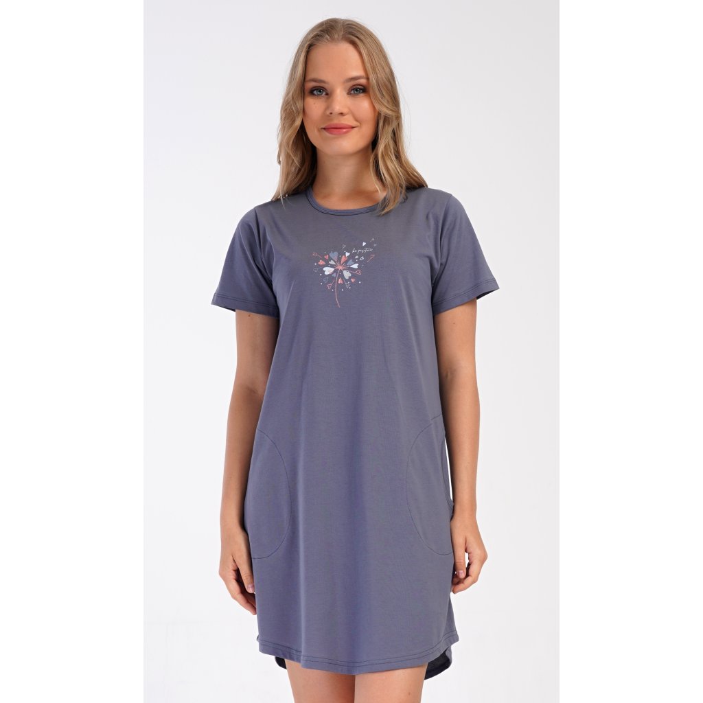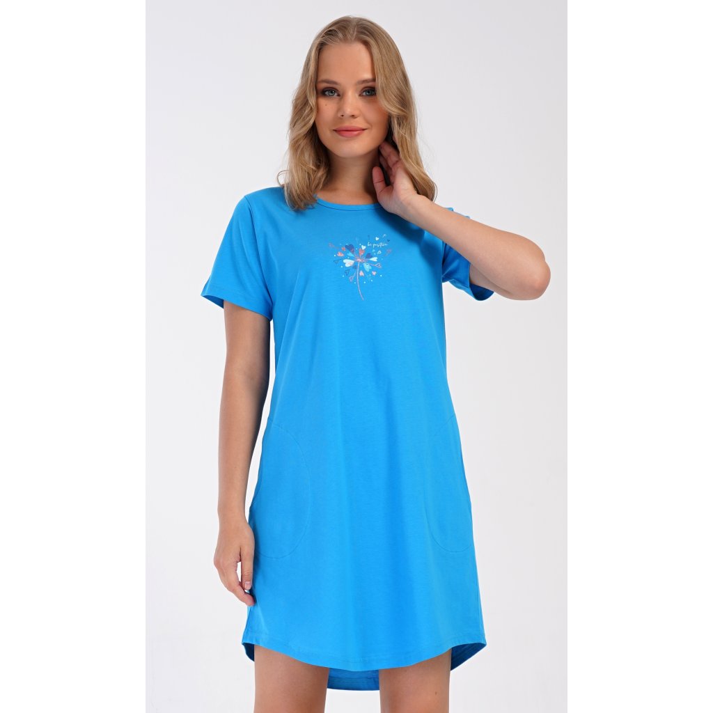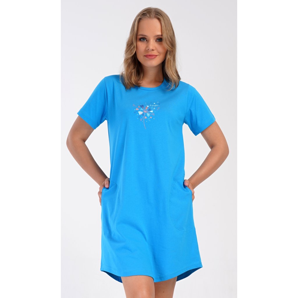 Dámské bavlněné domácí šaty s krátkým rukávem Pampeliška. Domácí jednobarevné šaty s kulatým výstřihem a kapsami zdobí na hrudi obrázek rozfoukané pampelišky. Použitý bavlněný materiál je příjemný a poddajný na dotek. Šaty jsou pohodlné, využijete je téměř při všech volnočasových aktivitách. Jsou vhodné na spaní i na denní nošení.