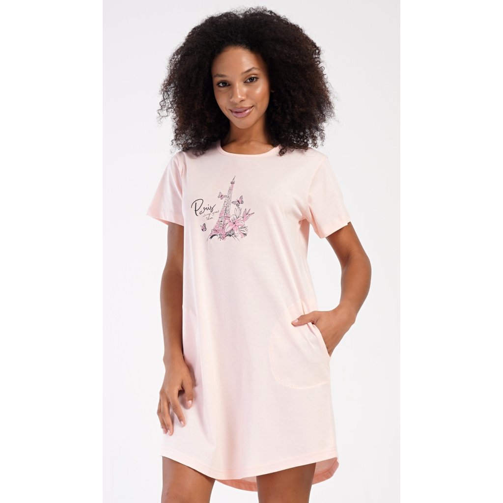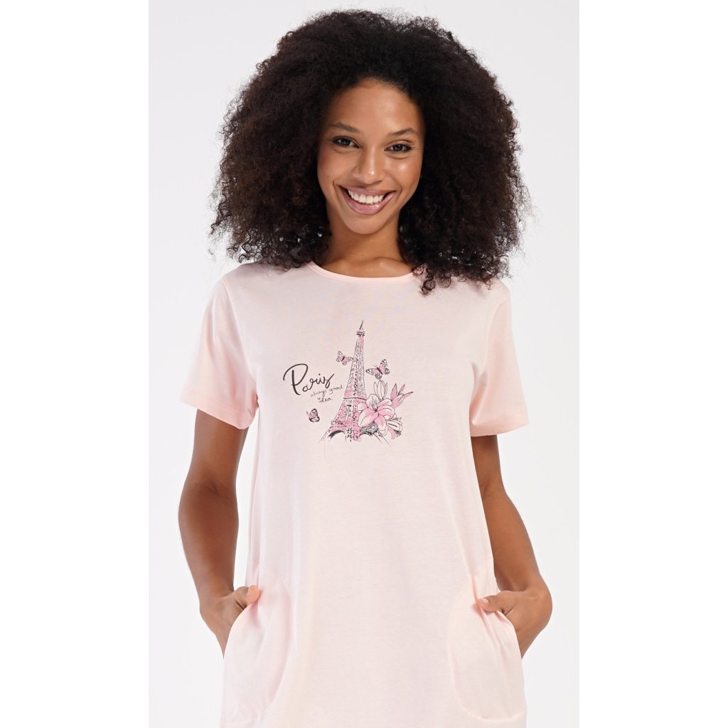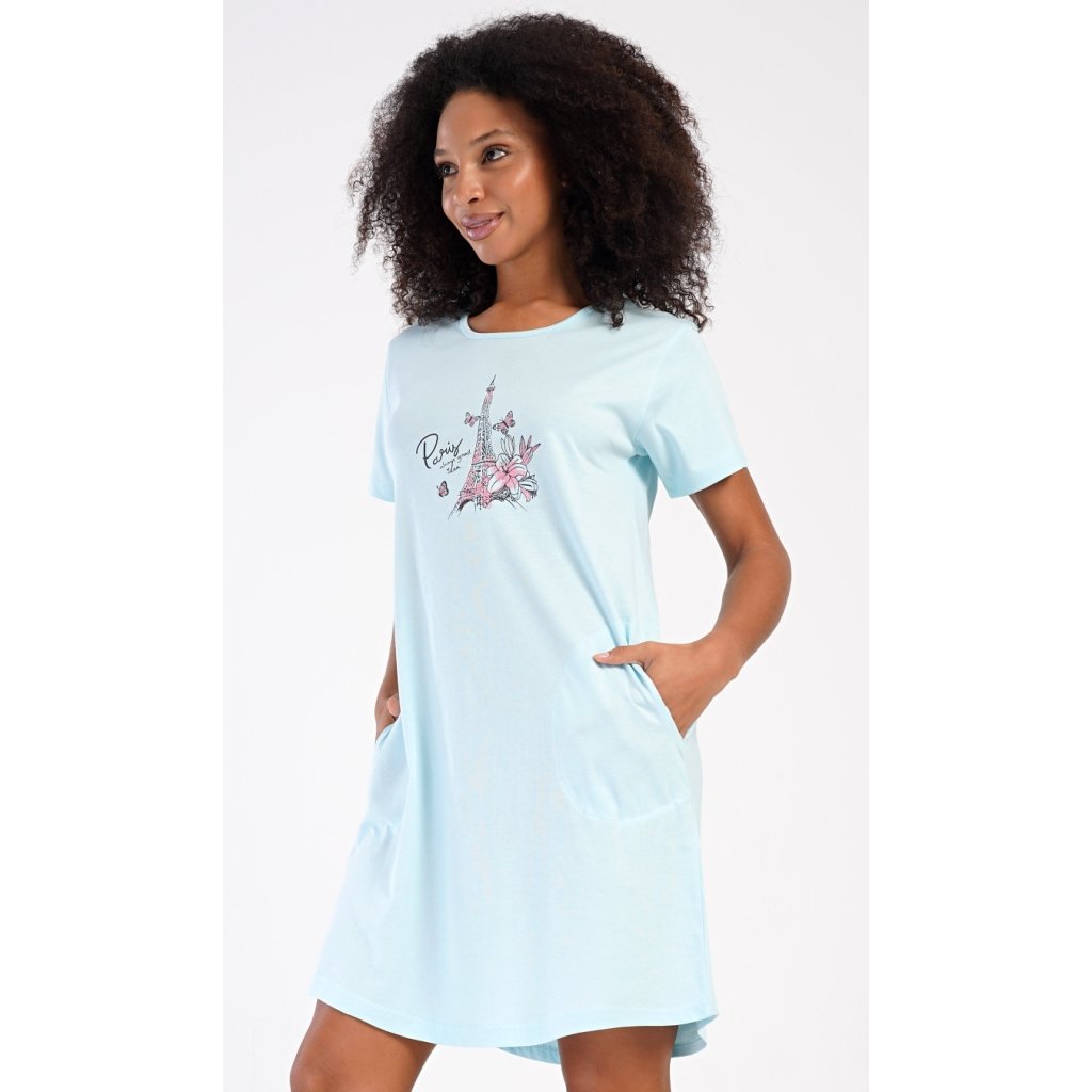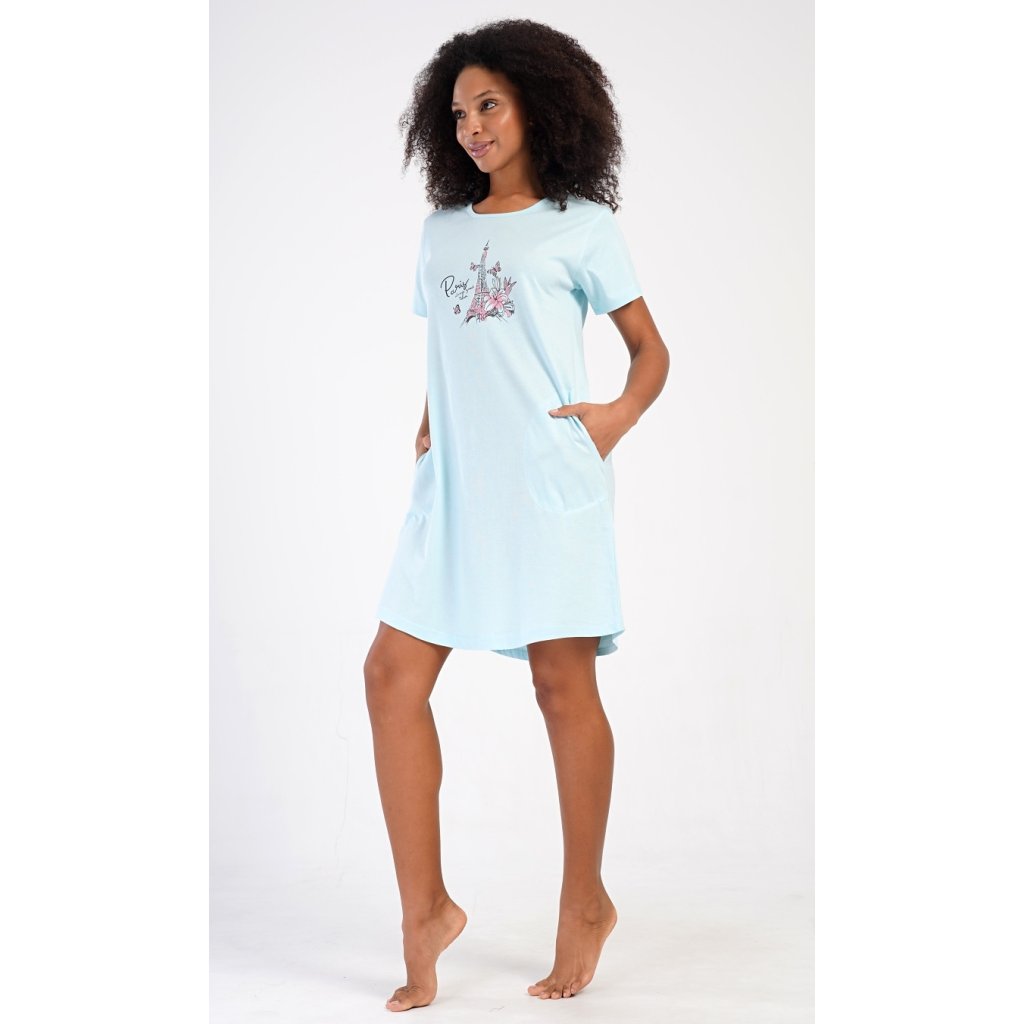 Dámské bavlněné domácí šaty s krátkým rukávem Paris. Domácí jednobarevné šaty s kulatým výstřihem a kapsami zdobí na hrudi obrázek Eiffelovy věže a nápis Paris. Použitý bavlněný materiál je příjemný a poddajný na dotek. Šaty jsou pohodlné, využijete je téměř při všech volnočasových aktivitách. Jsou vhodné na spaní i na denní nošení .