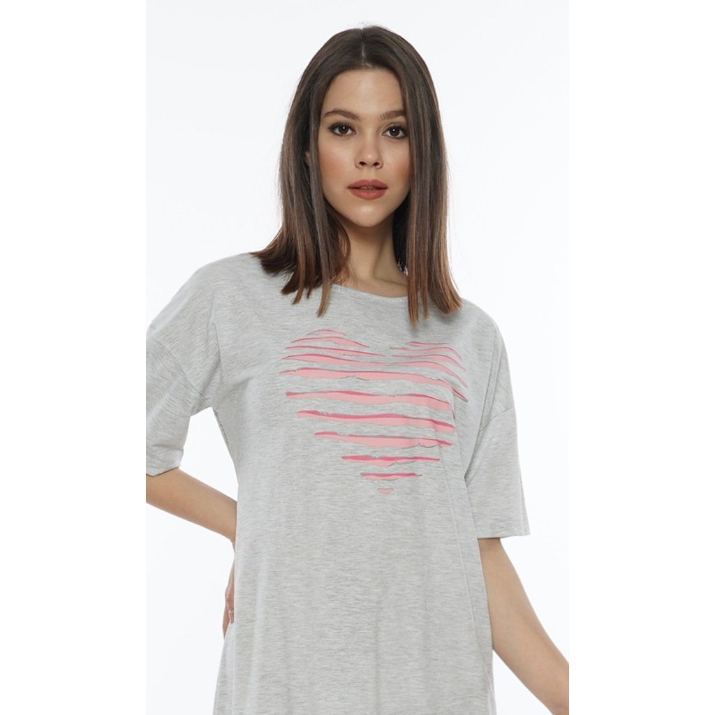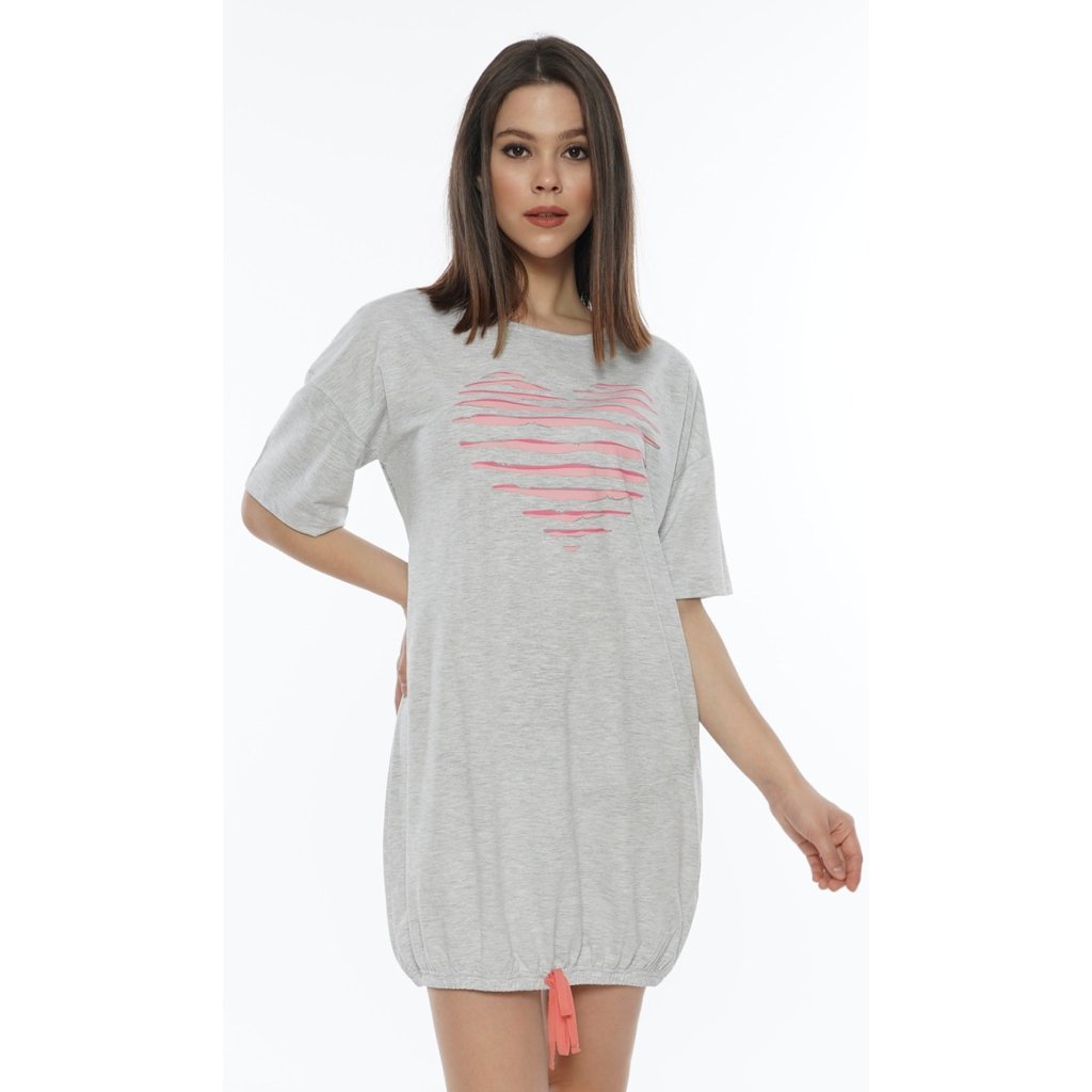 Dámské domácí šaty s krátkým rukávem Srdce. Pohodlné dámské šaty mikinového typu mají ve spodní části šňůrku ke stažení. Na přední části je obrázek srdce s efektem připomínajícím průstřihy. Šaty jsou díky svém střihu pohodlné, a jistě je využijete téměř při všech volnočasových aktivitách. Použitý materiál je příjemný a poddajný na dotek.