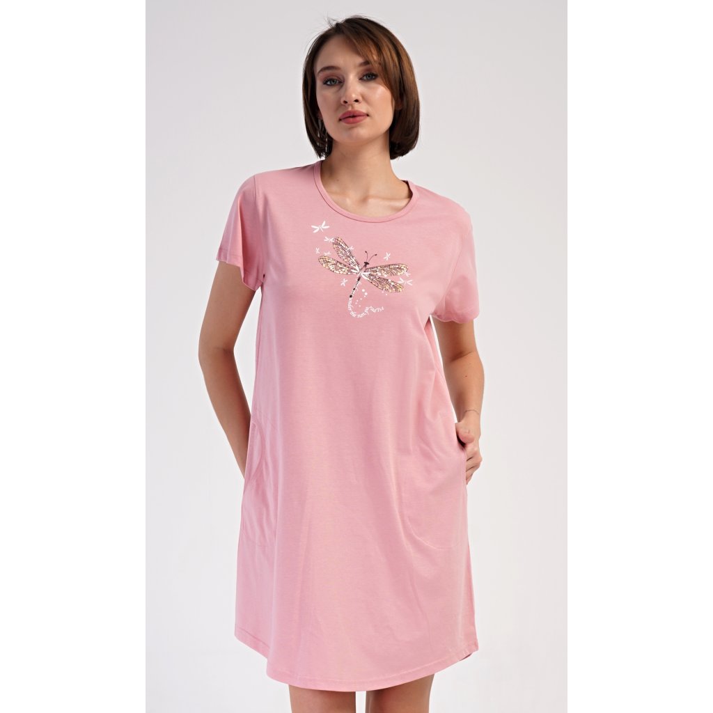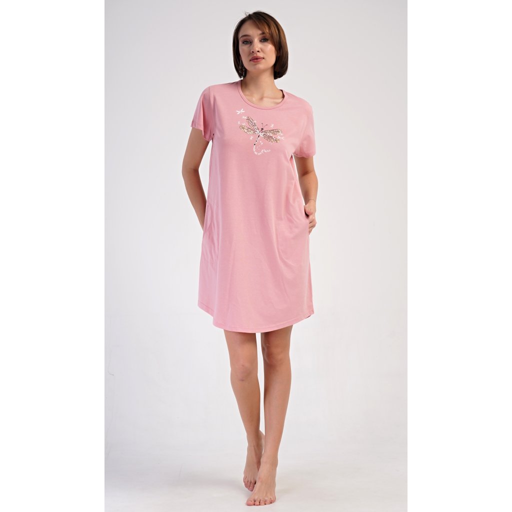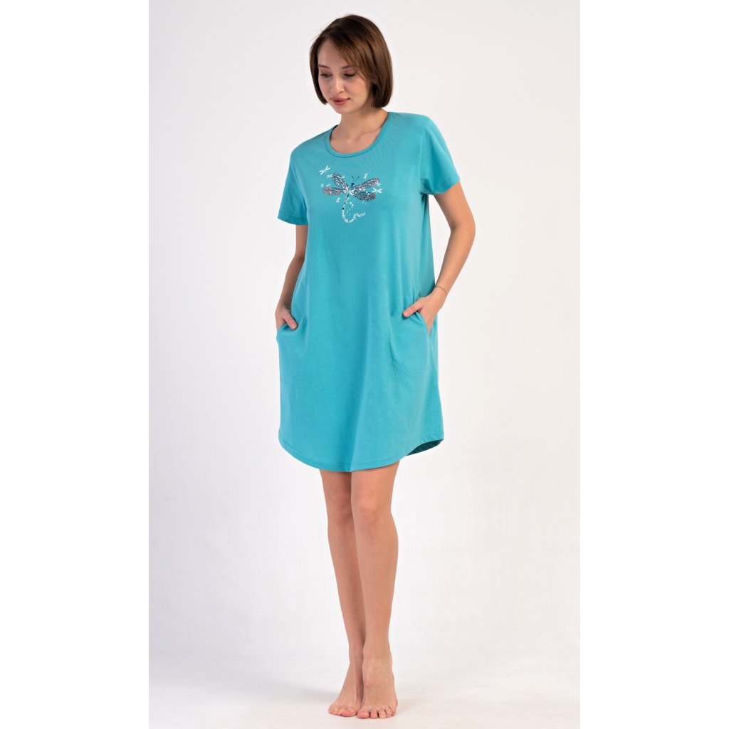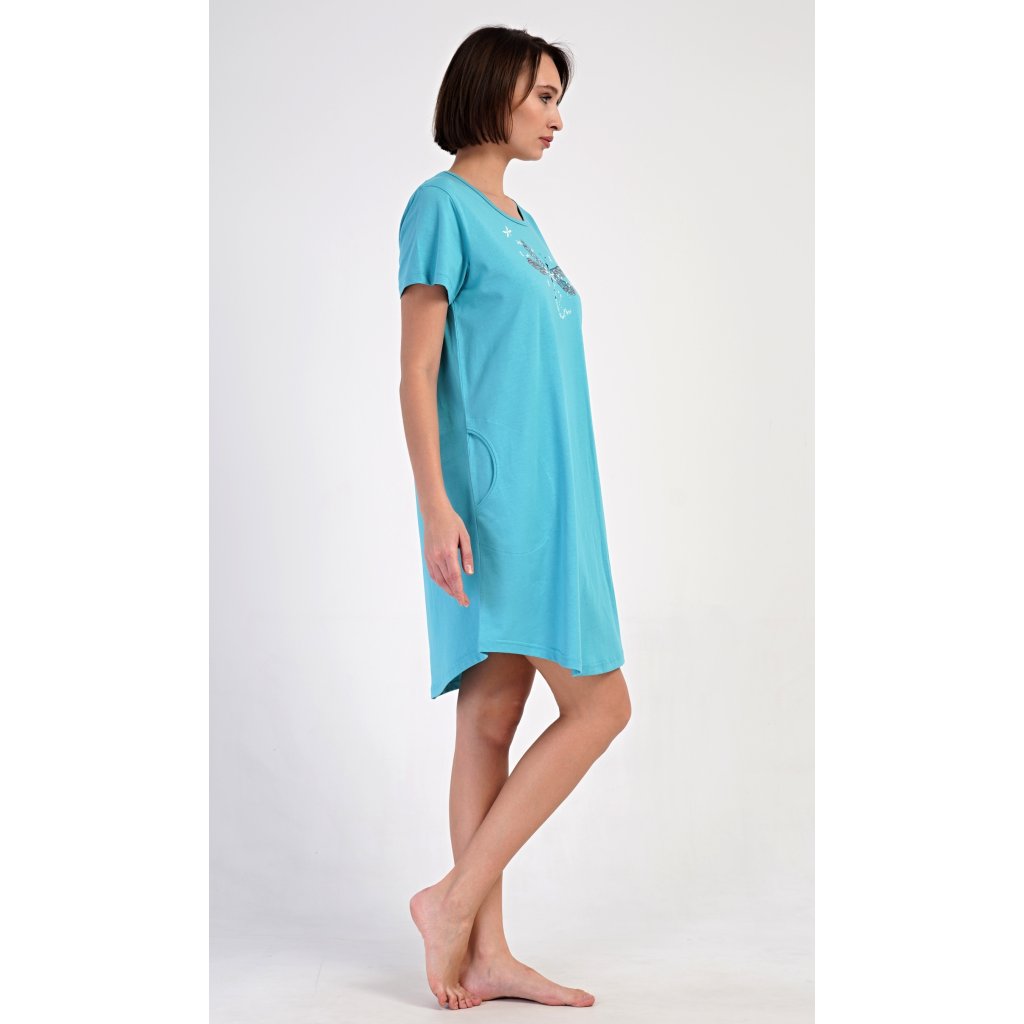 Dámské bavlněné domácí šaty s krátkým rukávem Vanda. Domácí jednobarevné šaty s kulatým výstřihem a kapsami zdobí na hrudi obrázek vážky. Použitý bavlněný materiál je příjemný a poddajný na dotek. Šaty jsou pohodlné, vhodné na spaní i na denní nošení.