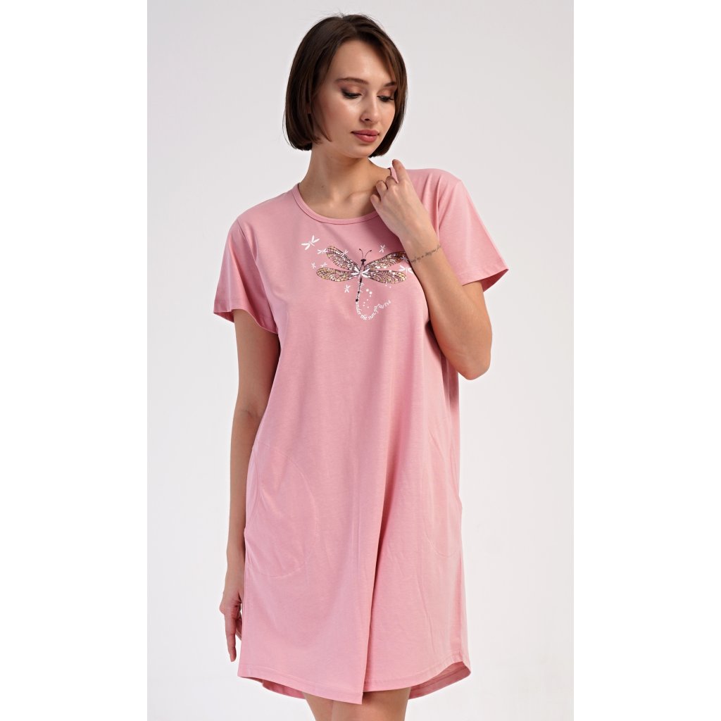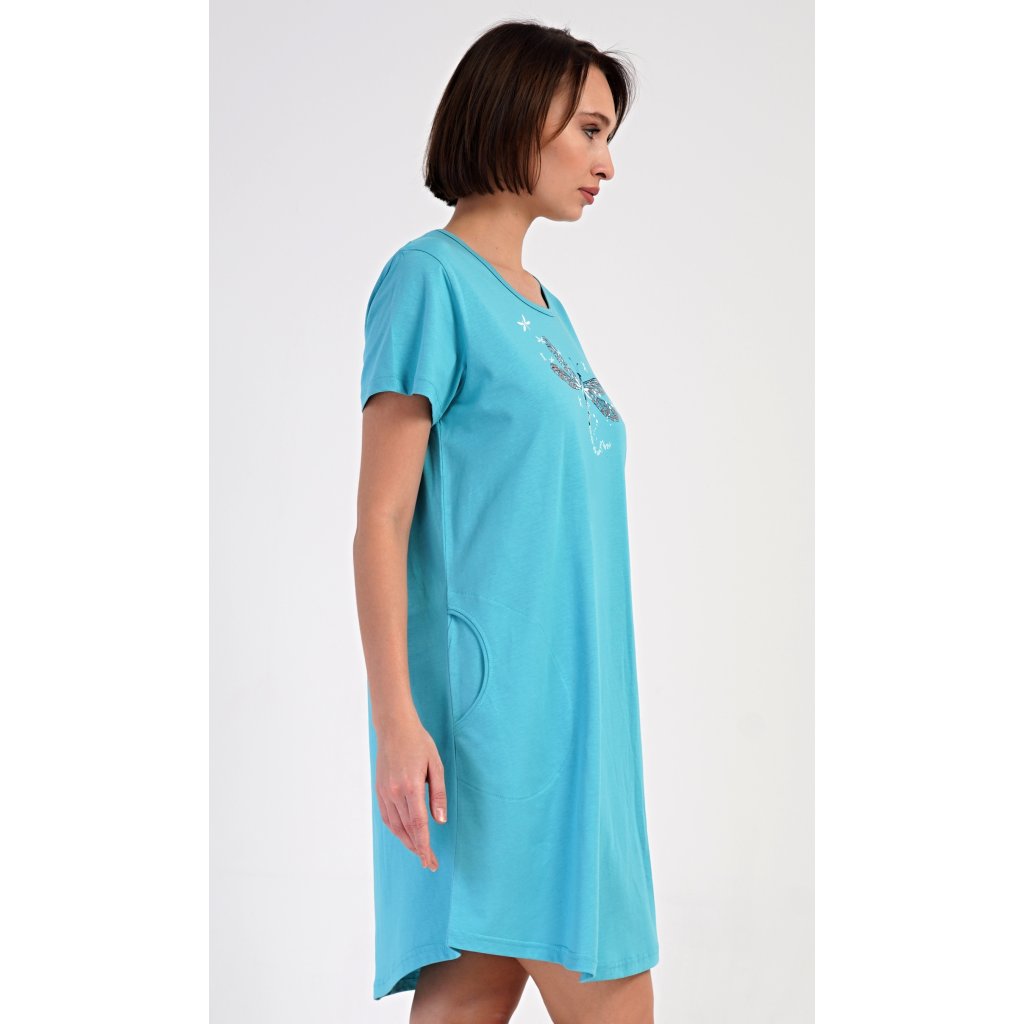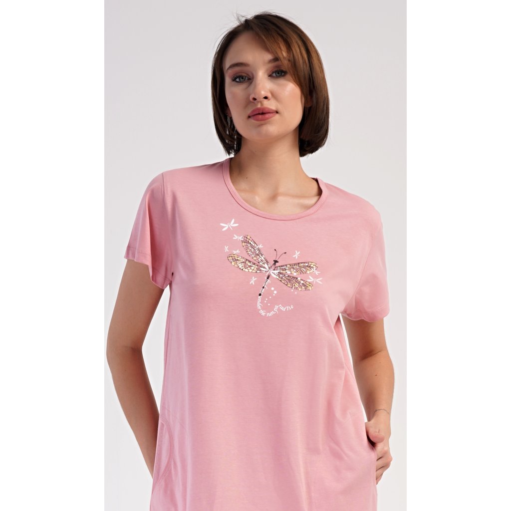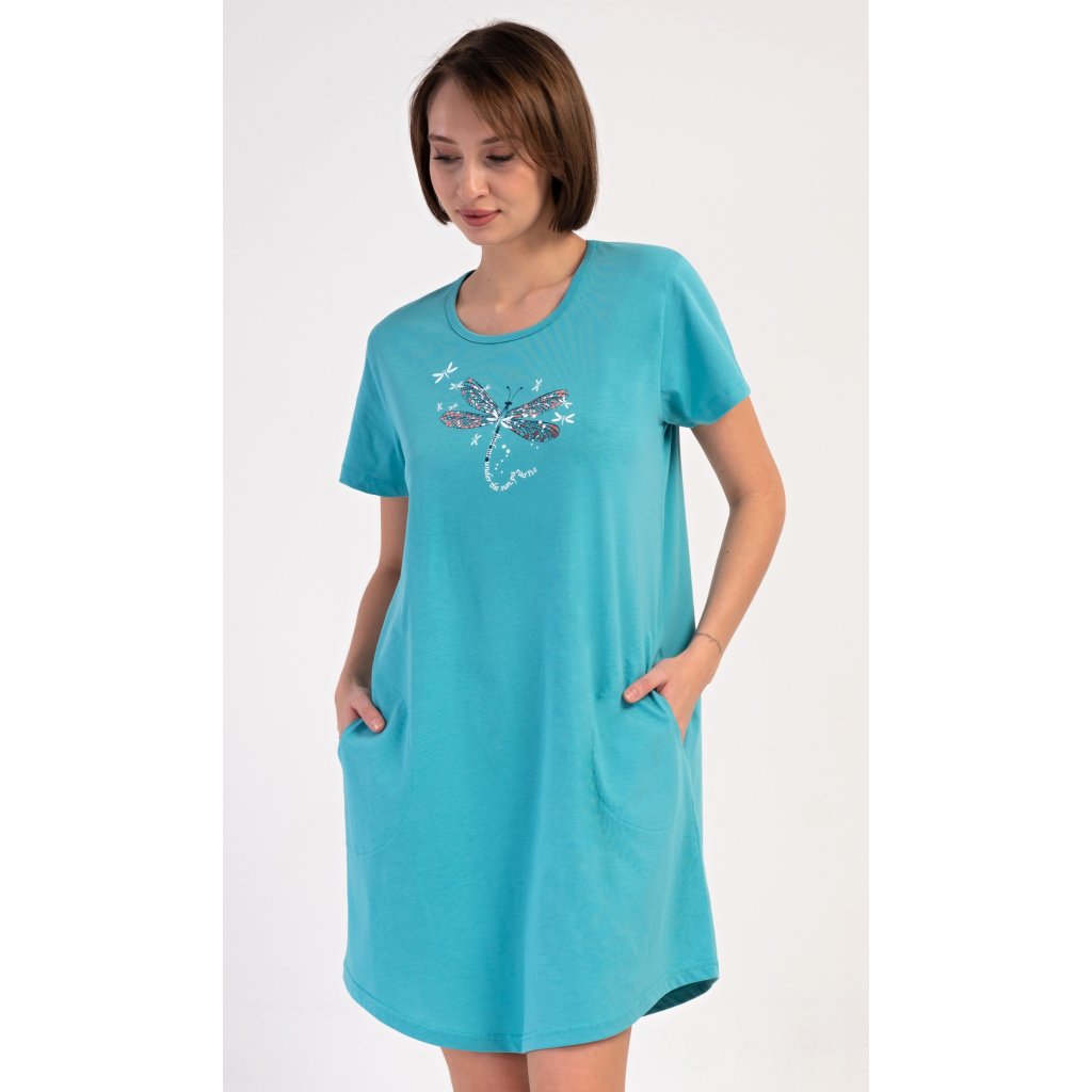 Dámské bavlněné domácí šaty s krátkým rukávem Vanda. Domácí jednobarevné šaty s kulatým výstřihem a kapsami zdobí na hrudi obrázek vážky. Použitý bavlněný materiál je příjemný a poddajný na dotek. Šaty jsou pohodlné, vhodné na spaní i na denní nošení.