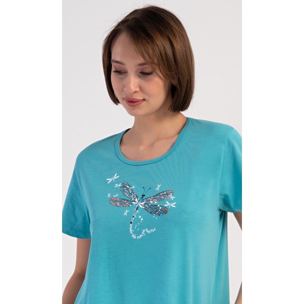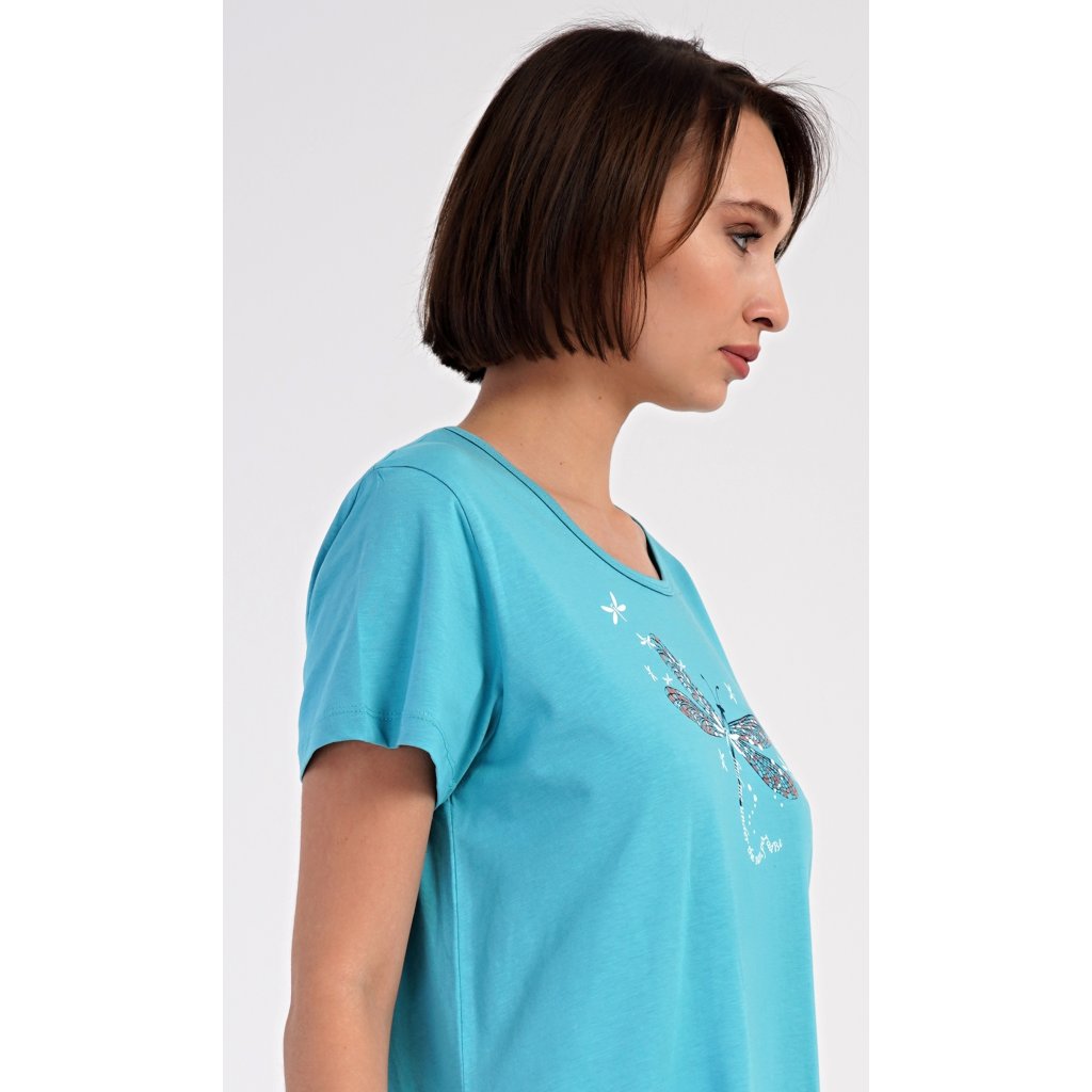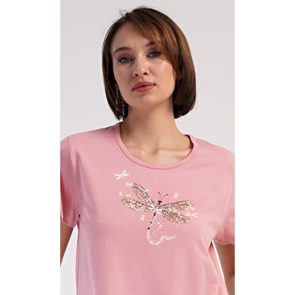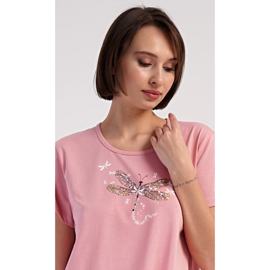 Dámské bavlněné domácí šaty s krátkým rukávem Vanda. Domácí jednobarevné šaty s kulatým výstřihem a kapsami zdobí na hrudi obrázek vážky. Použitý bavlněný materiál je příjemný a poddajný na dotek. Šaty jsou pohodlné, vhodné na spaní i na denní nošení.