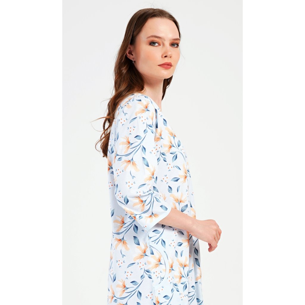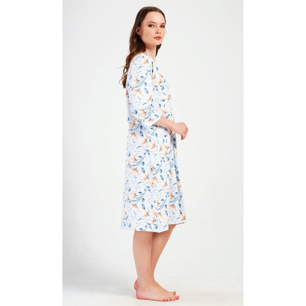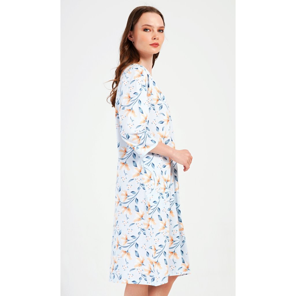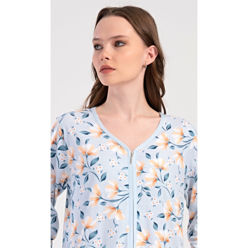 Dámské bavlněné domácí šaty s tříčtvrtečním rukávem Karolína. Pohodlné rozepínací šaty v příjemné délce pod kolena využijete téměř při všech volnočasových aktivitách. Mají praktické kapsy a zapínání na zip. Šaty jsou potištěny jemným květinovým vzorem. Použitý bavlněný materiál je příjemný a poddajný na dotek.