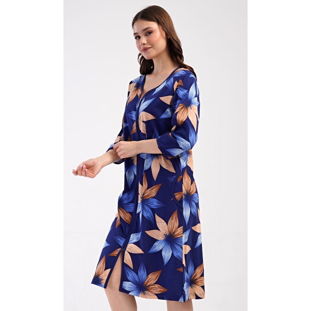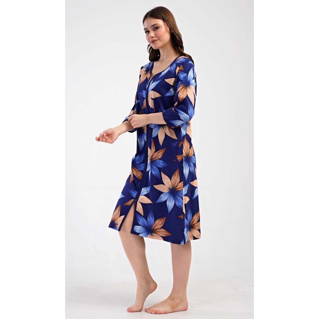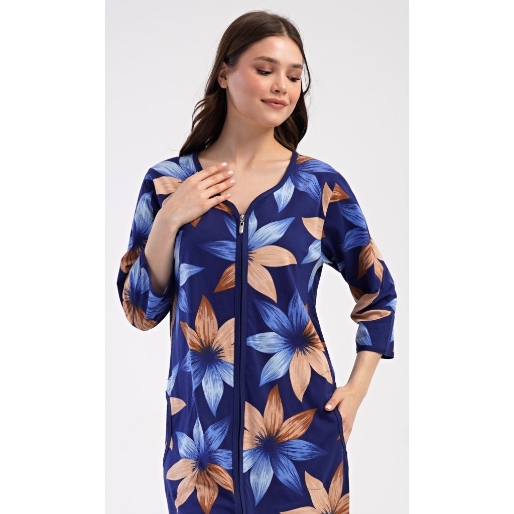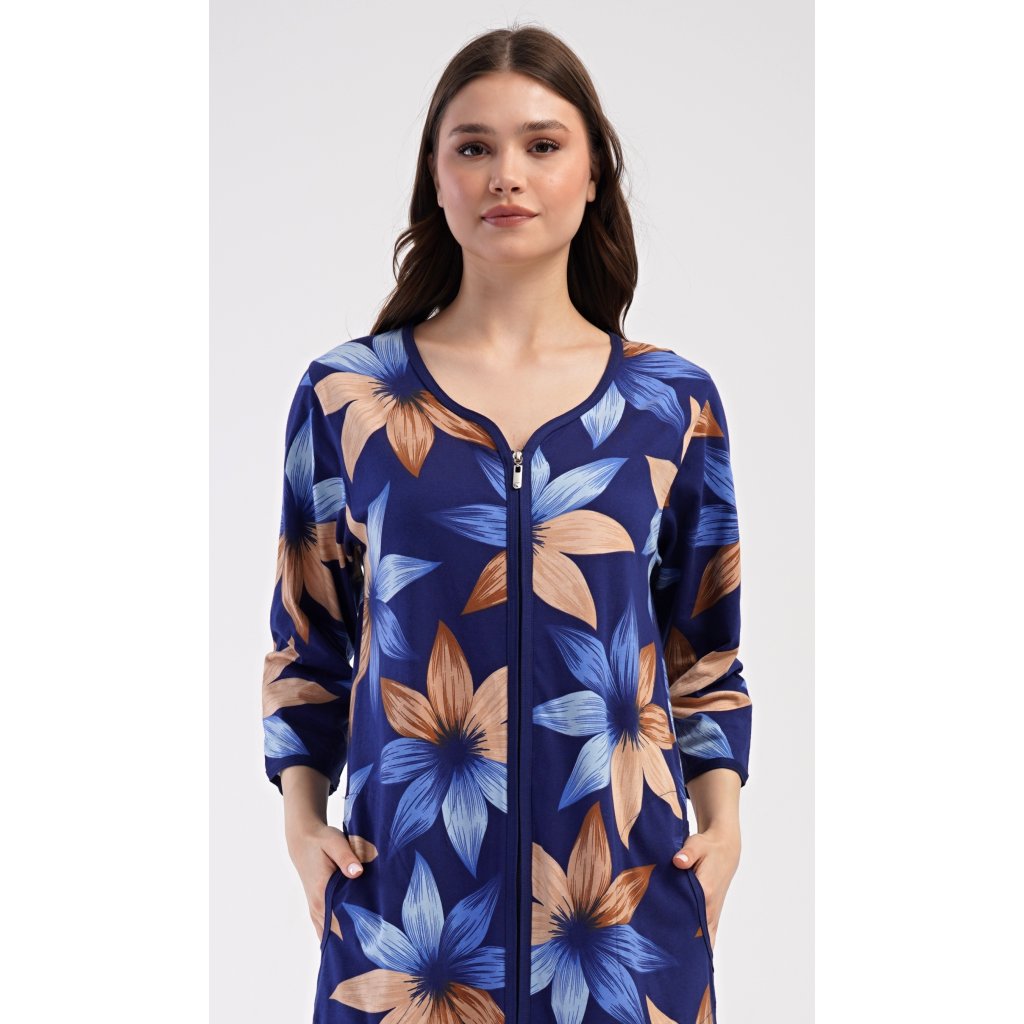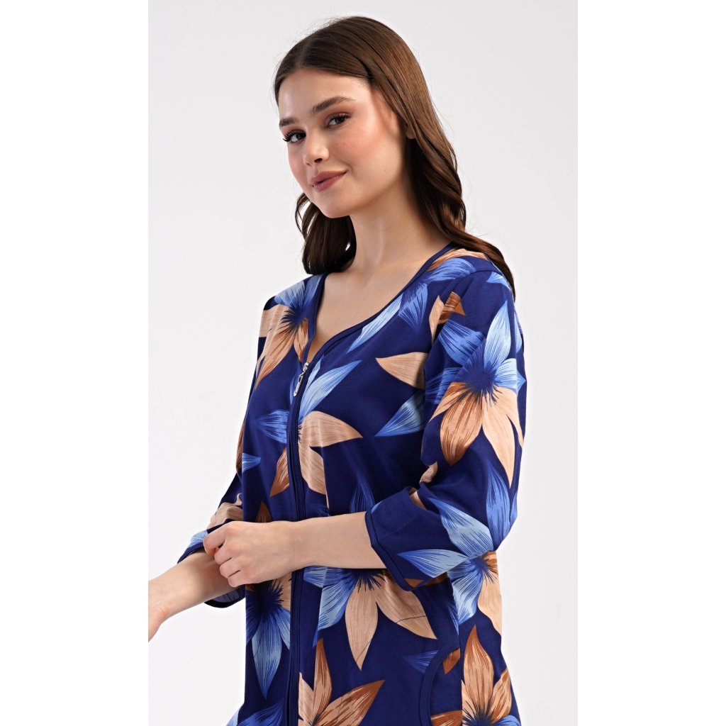 Dámské bavlněné domácí šaty s tříčtvrtečním rukávem Sára. Pohodlné rozepínací šaty v příjemné délce pod kolena využijete téměř při všech volnočasových aktivitách. Mají praktické kapsy a zapínání na zip. Šaty jsou potištěny květy. Použitý bavlněný materiál je příjemný a poddajný na dotek.