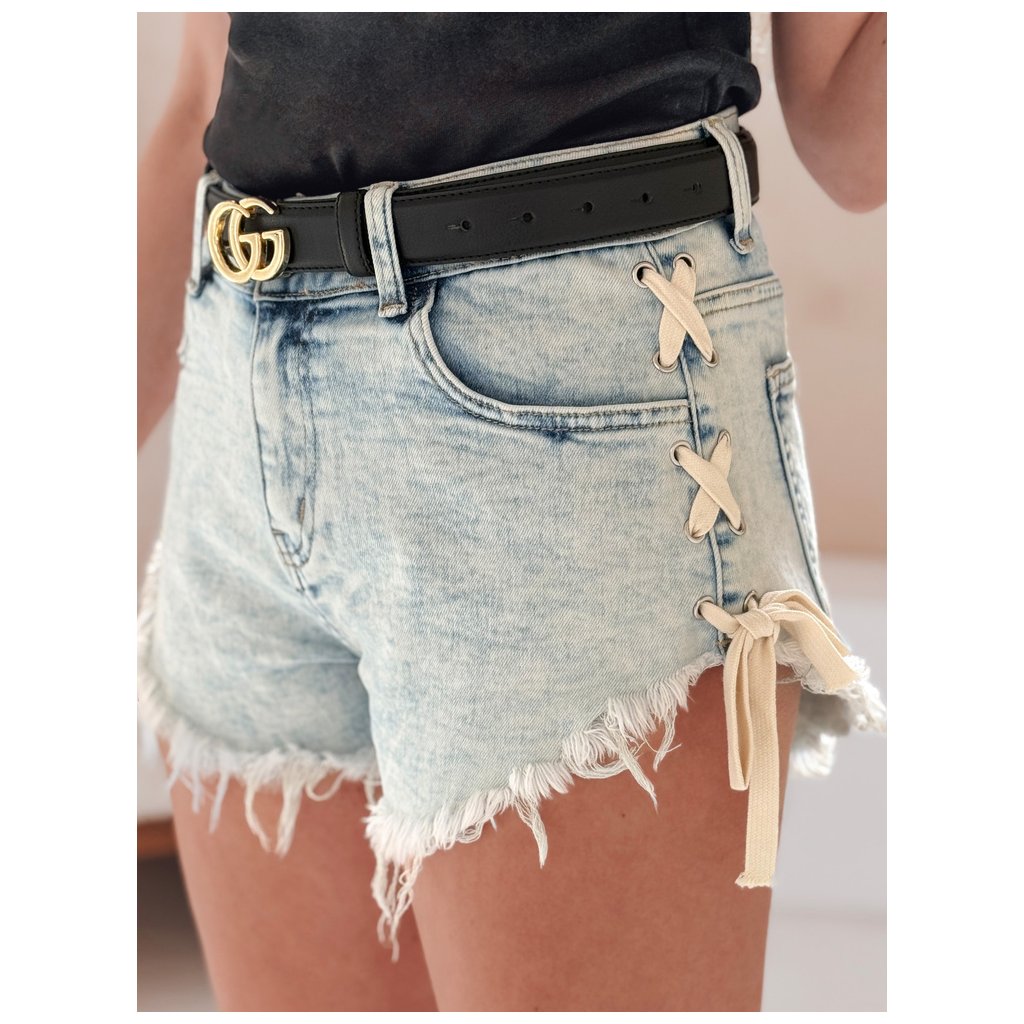 Tyto dámské džínové kraťasy s bočními zavazováními jsou perfektní letní volbou pro ženy, které oceňují módu s nádechem šmrncu. Jejich výrazné roztřepené nohavice jim dodávají uvolněný a ležérní vzhled, zatímco šněrovací detaily poutají pozornost a dodávají vzhledu jedinečný nádech. Středně vysoký pas zajišťuje každodenní pohodlí. Tento styl se perfektně hodí k crop topům nebo teniskám ve stylu streetwear.
