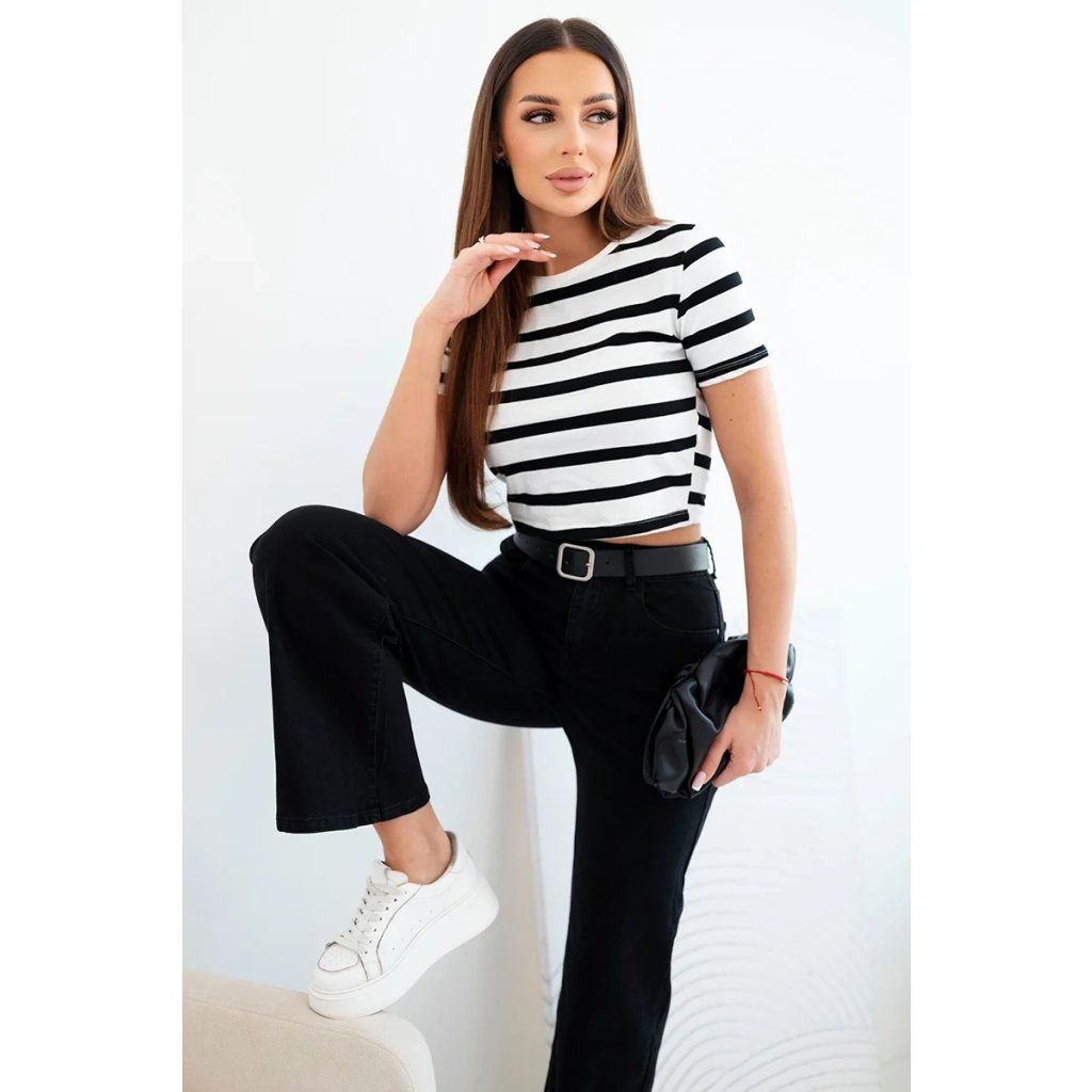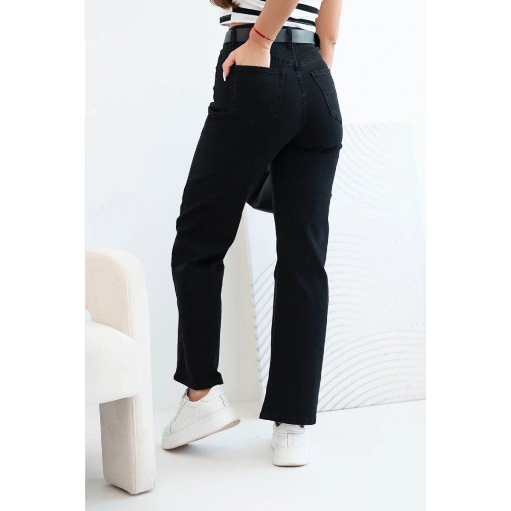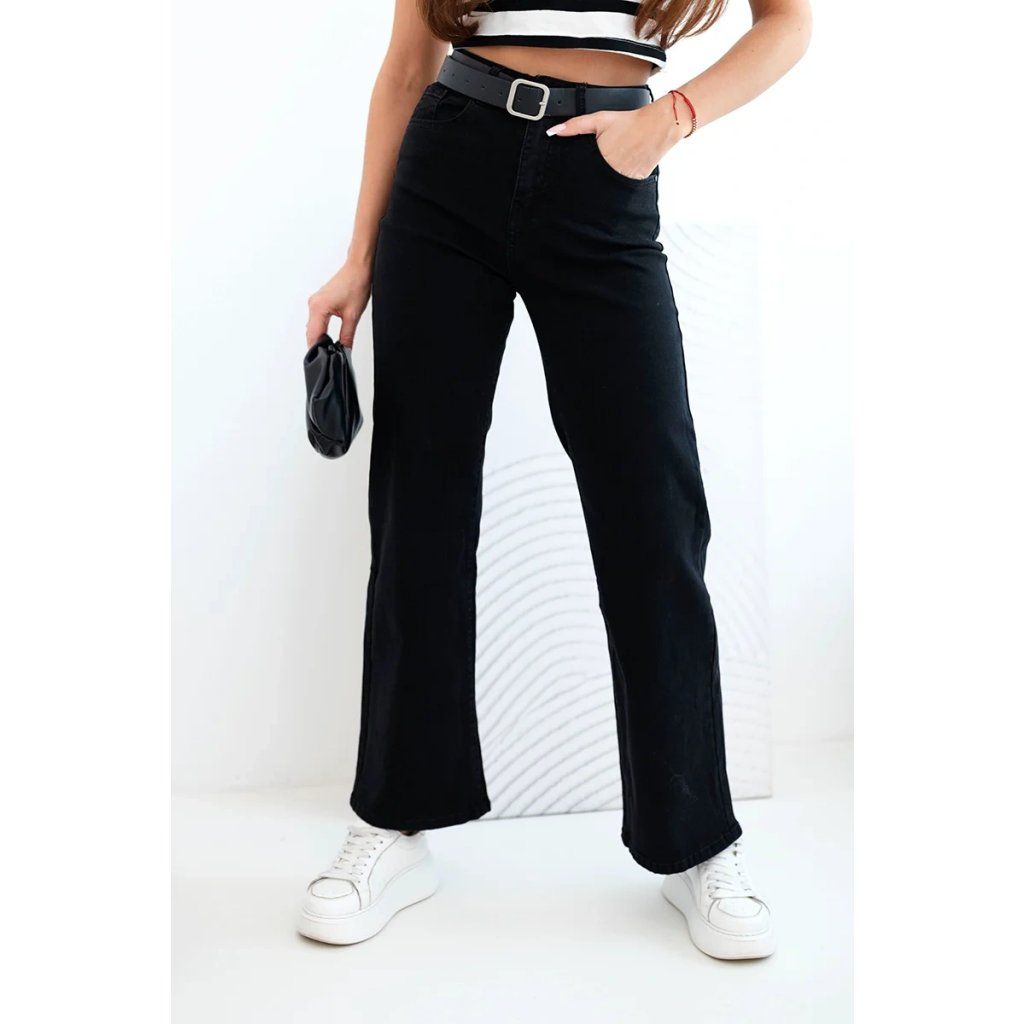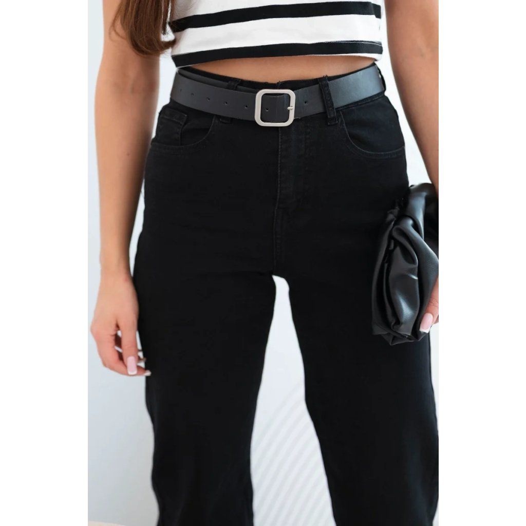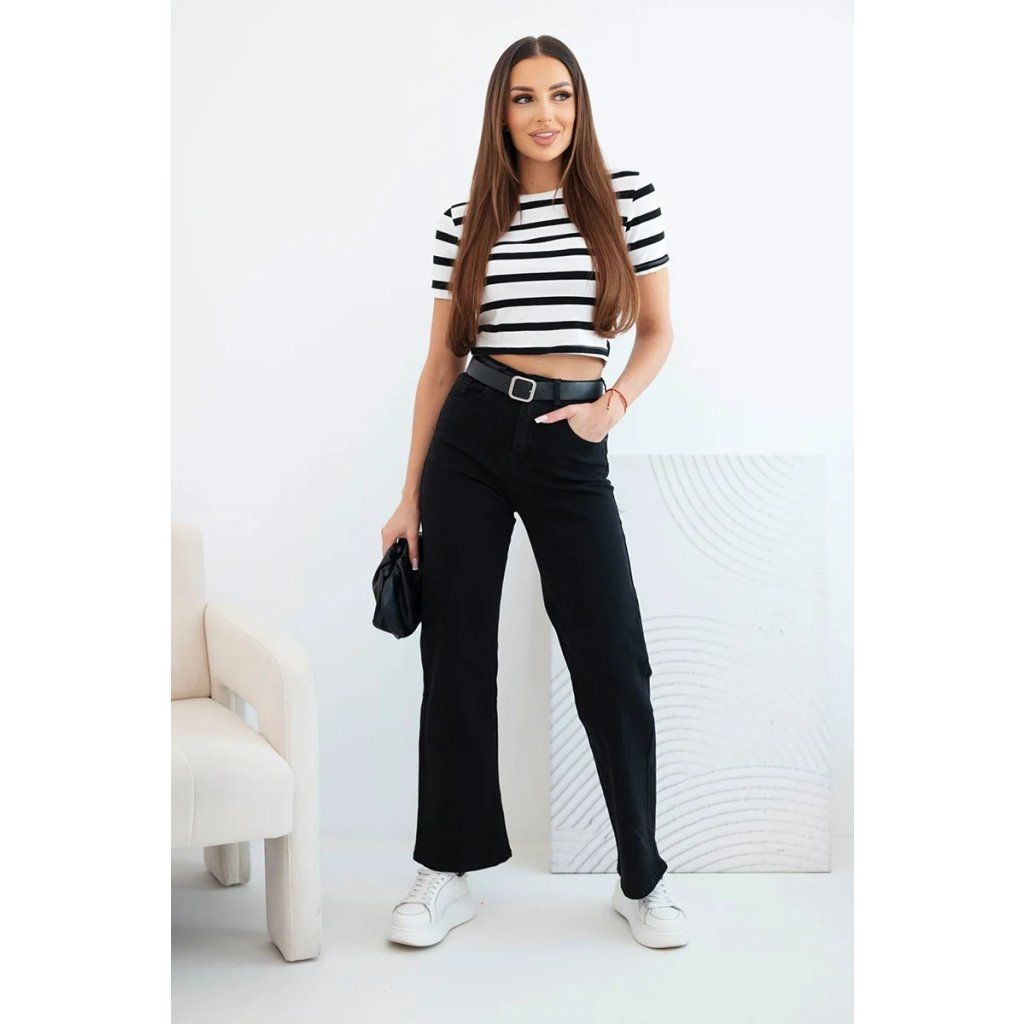 Klasické dámské kalhoty s rovnými nohavicemi jsou must-have v šatníku každé ženy, která si cení elegance a pohodlí. Vysoký pas krásně modeluje postavu a přiložený pásek s velkou sponou zdůrazňuje pas a dodává celkovému vzhledu módní charakter. Tento model se skvěle hodí jak pro casual stylizace, tak pro elegantnější příležitosti – v kombinaci s košilí nebo sakem.