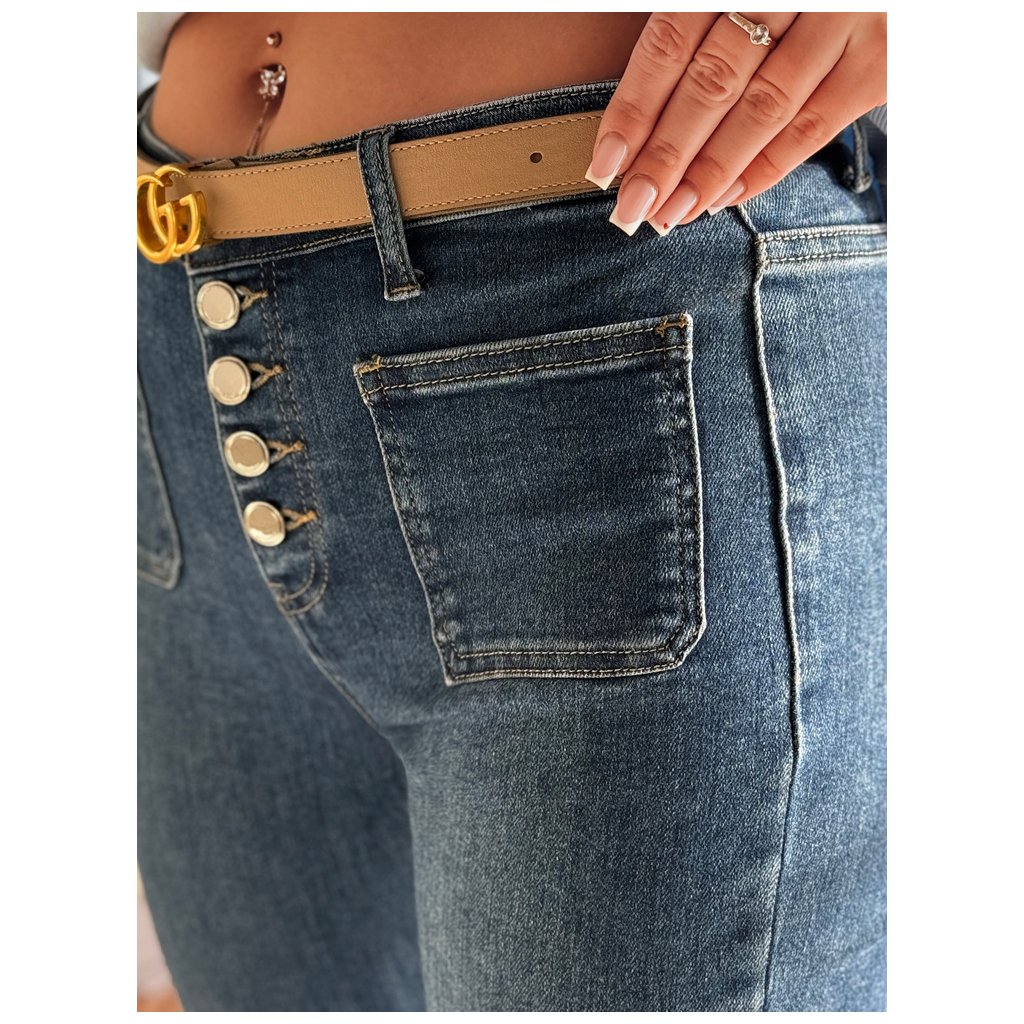 Tyto rozšířené džíny s ozdobnými kapsami a středně vysokým pasem jsou klasikou s moderním nádechem. Výrazné zapínání na více knoflíků dodává modelu jedinečný nádech. Přiléhavý střih lichotí postavě, zatímco mírně rozšířené nohavice nohy opticky prodlužují. Perfektní volba pro každodenní nošení i pro zvláštní příležitosti. Skvěle se hodí ke kotníkovým botám a teniskám.