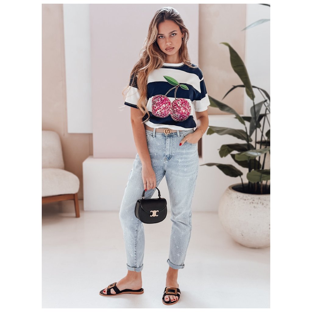 Džínové džíny s efektem hvězdné oblohy – zdobené drobnými perličkami a potiskem hvězd. Měkký, světlý denim a klasický střih s ohrnutými lemy jsou ideální pro teplejší dny. Jarním a letním outfitům dodají nádech originality a ženského kouzla.