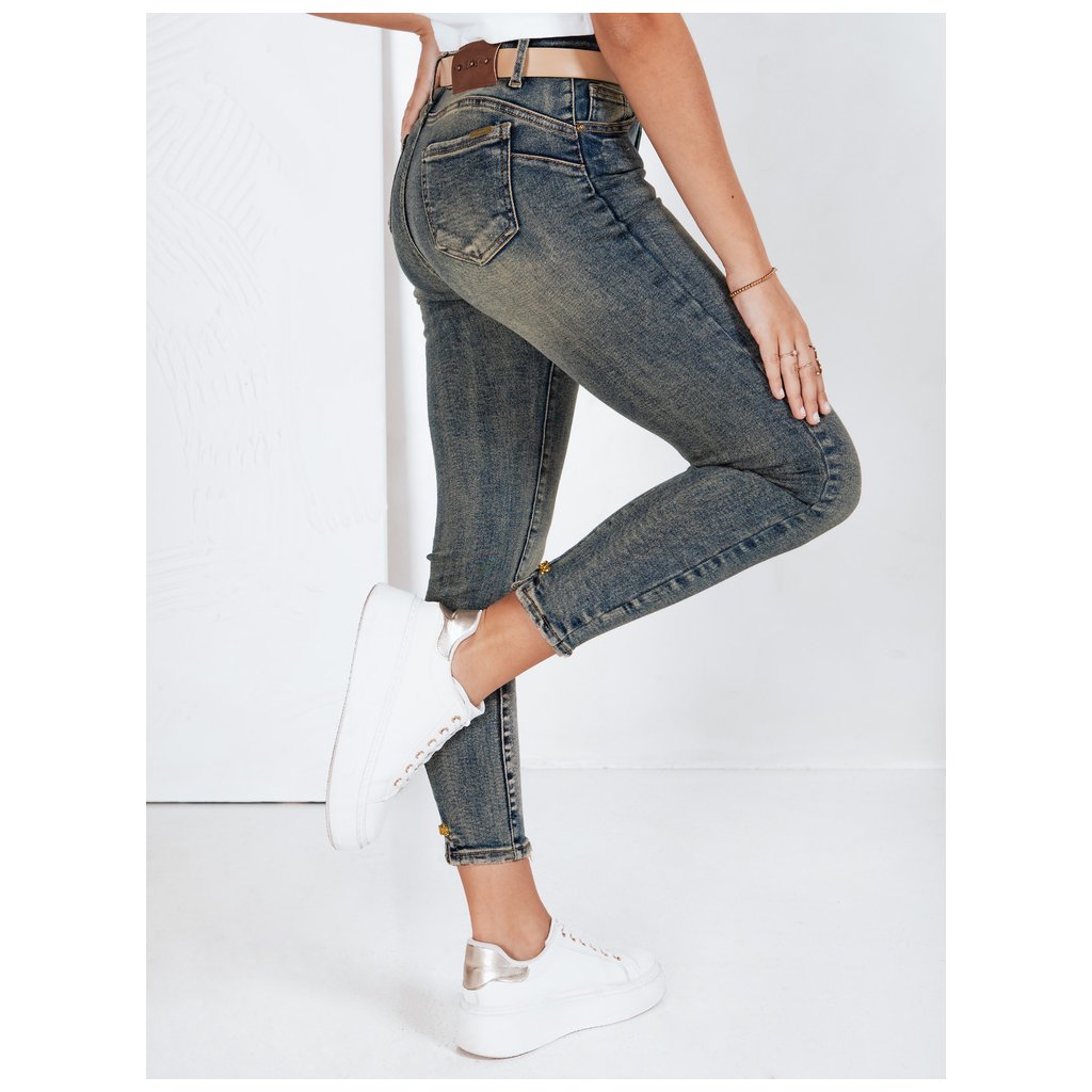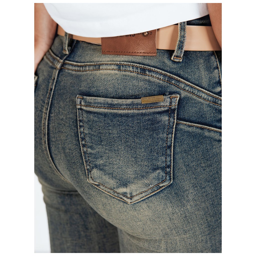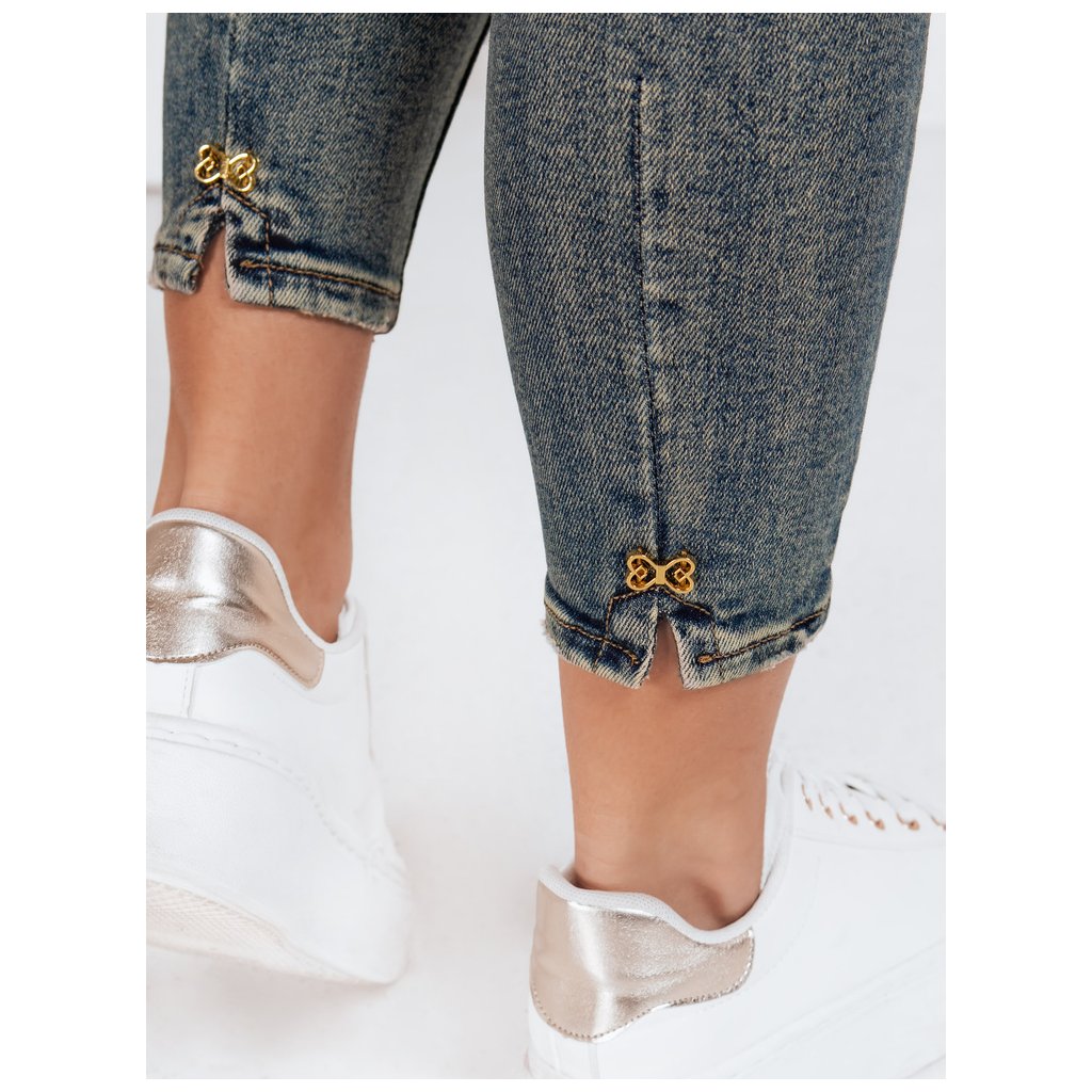 Tyto džíny jsou vyrobeny ze směsi bavlny a elastanu, což zajišťuje správné padnutí a odolnost i po mnoha praních. Vysoký pas zdůrazňuje pas a zúžené nohavice dodávají moderní a ženský vzhled. Zlaté detaily na koncích nohavic odlišují tyto kalhoty od klasických stylů.