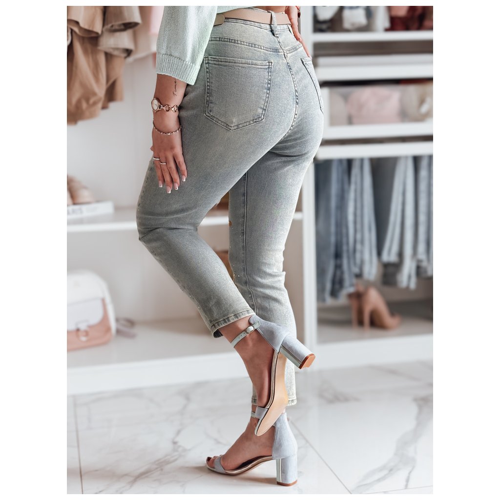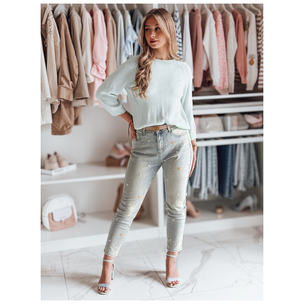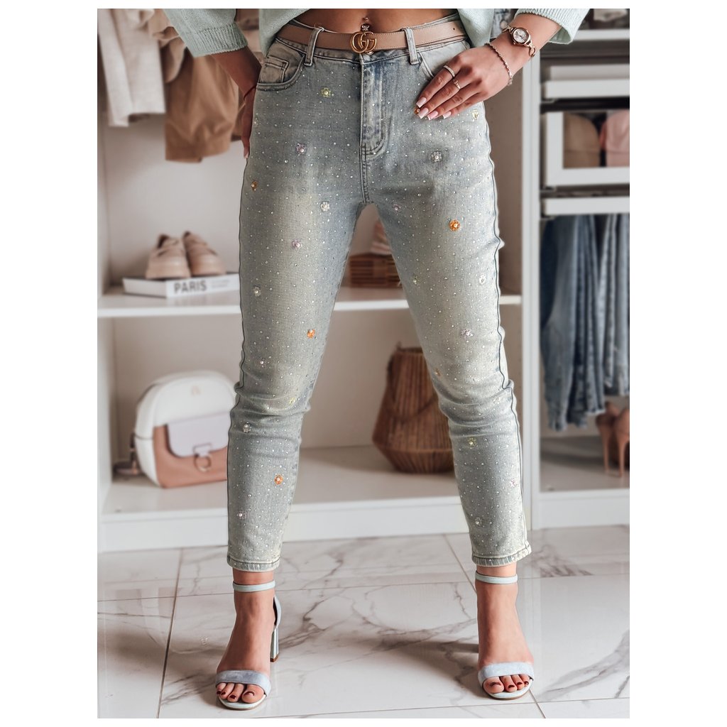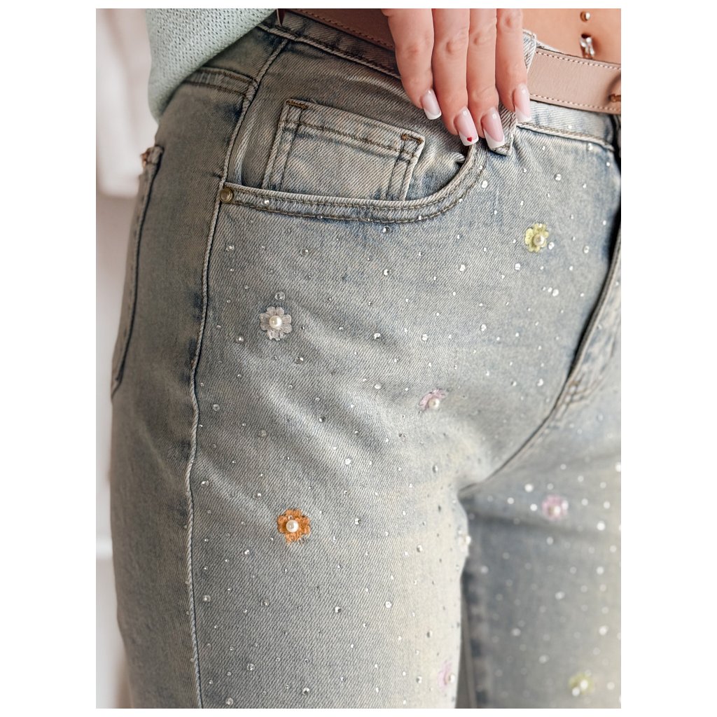 Dámské úzké džíny ženského střihu, zdobené decentními perlami a květinami. Vysoký pas, ozdobné kapsy a praktické zapínání na knoflík a zip. Poutavé ozdoby dodávají džínám jedinečný nádech, díky čemuž jsou skvělou volbou pro zvláštní příležitosti.