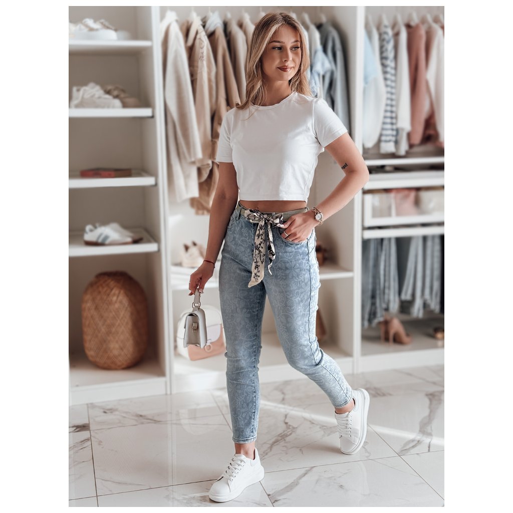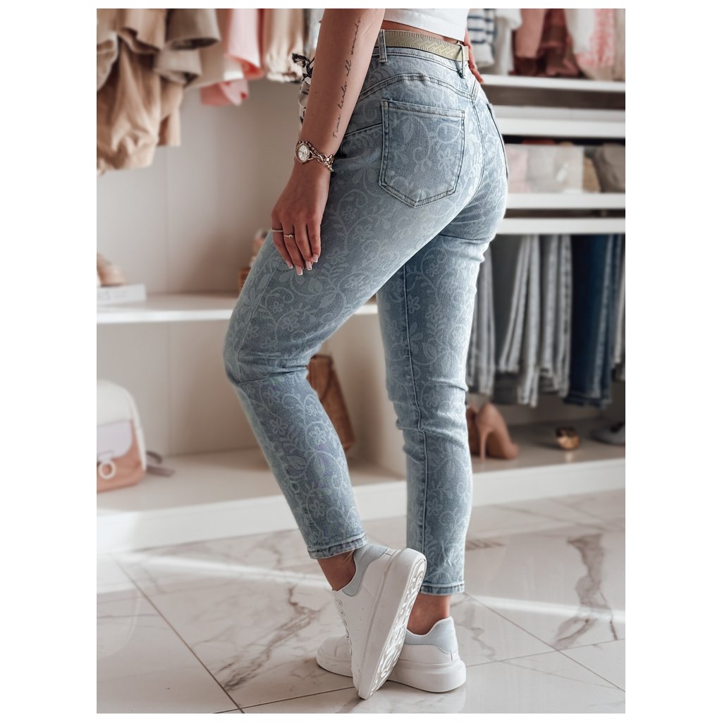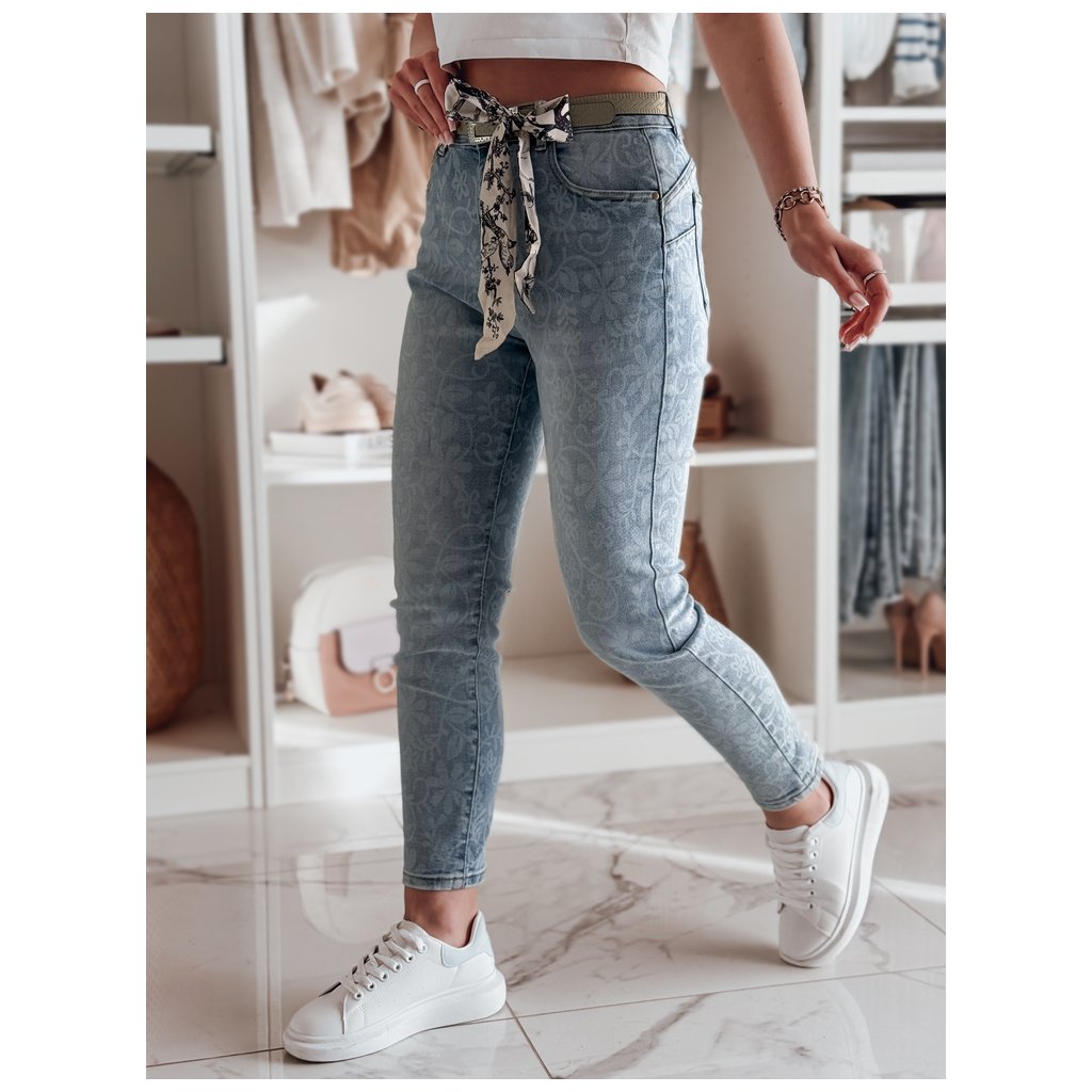 Tyto úzké džíny s vysokým pasem a decentním květinovým vzorem kombinují pohodlí a ženský styl. Přiléhavý střih zdůrazňuje postavu a opticky zeštíhluje nohy, zatímco ozdobný pásek dodává jedinečný nádech. Ideální pro každodenní nošení a v kombinaci s klasickým tričkem nebo elegantní halenkou vytvářejí módní vzhled.