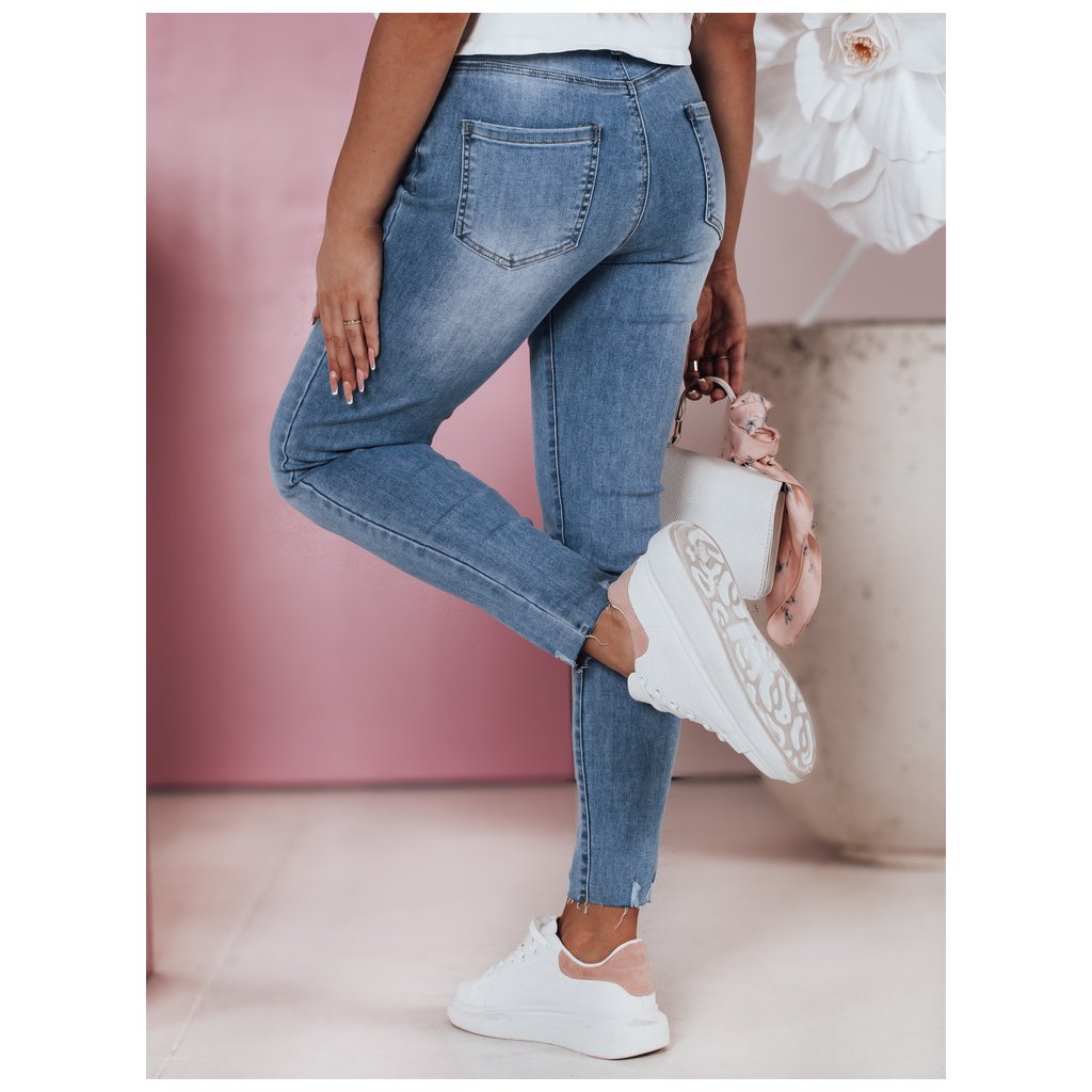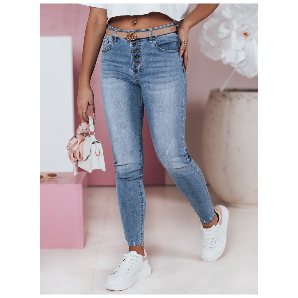 Úzké džíny s délkou nohavic 7/8. Vysoký pas lichotí postavě, zatímco úzké nohavice nohy prodlužují a zeštíhlují. Model má roztřepené lemy a několik knoflíků. Ideální na jarní procházky, nakupování nebo setkání s přáteli.