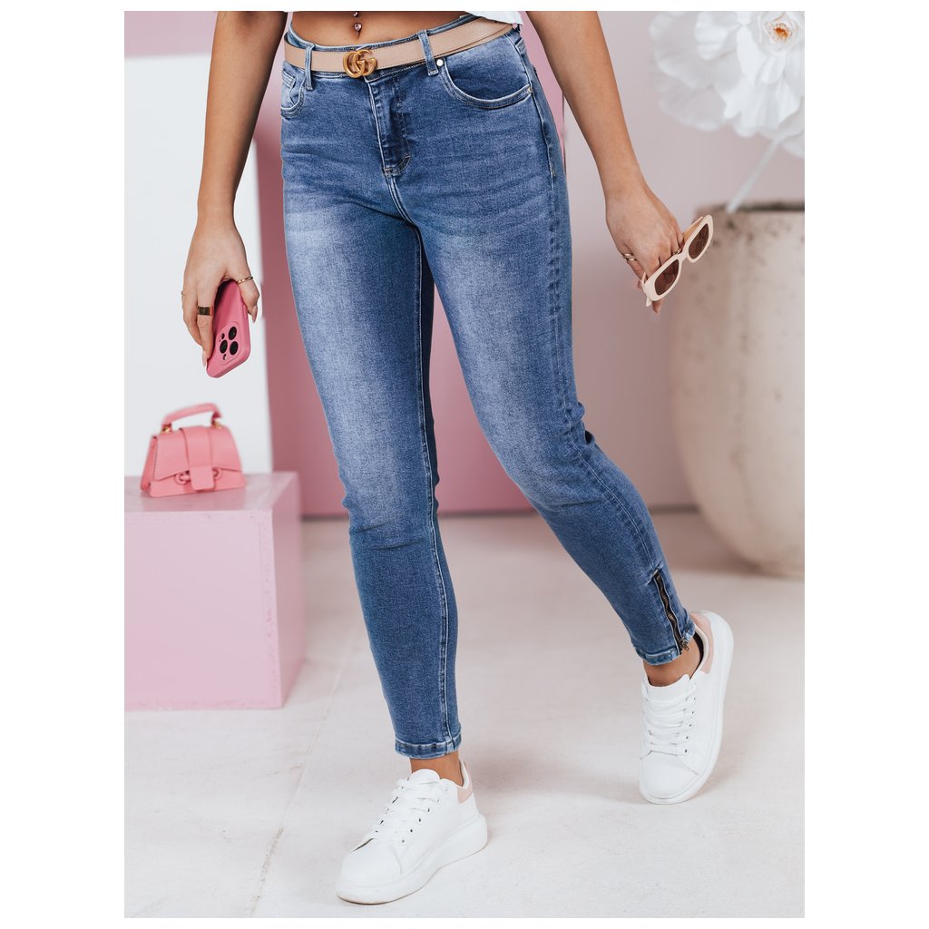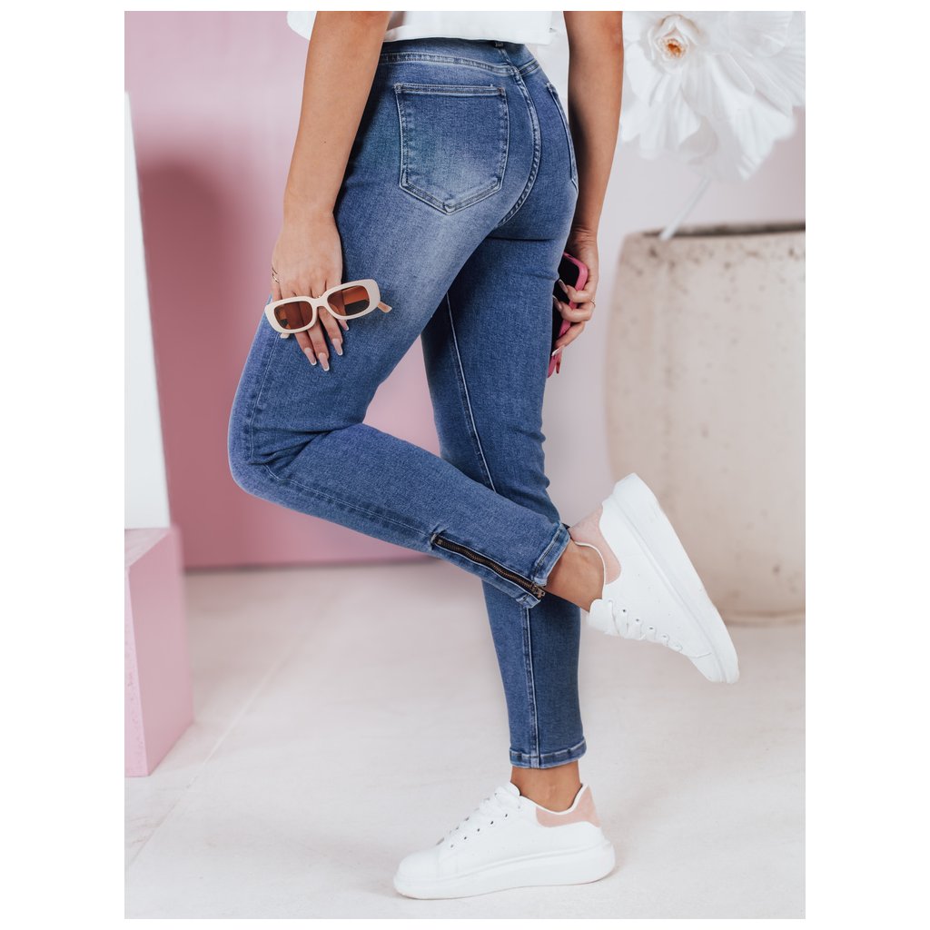 Dámské úzké džíny s středně vysokým pasem a několika kapsami. Mají ozdobné patentky po stranách obou nohavic. Úzké nohavice opticky zvýrazňují postavu a zeštíhlují nohy. Ideální pro každodenní nošení, umožňují vám vytvořit ležérní i elegantnější vzhled.