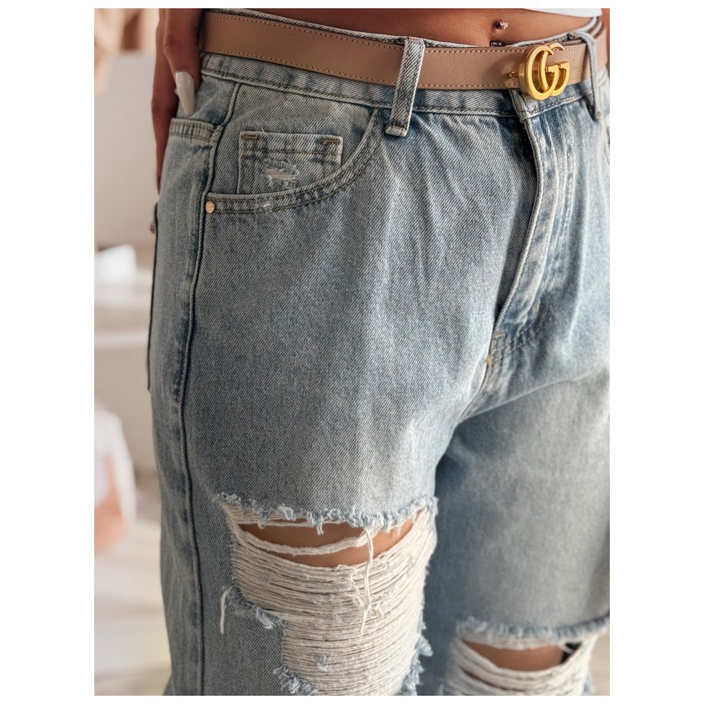 Tyto džínové kalhoty s širokými nohavicemi kombinují módní styl s pohodlím. Vysoký pas zdůrazňuje pas a opticky prodlužuje nohy, zatímco volný střih zajišťuje pohodlí. Poutavé roztrhané nohavice a střih dodávají kalhotám charakter a městský, ležérní vzhled. Dekorativní kapsy a zapínání na knoflíky a zip jsou praktické detaily. Ideální pro každodenní procházky nebo víkendové výlety.