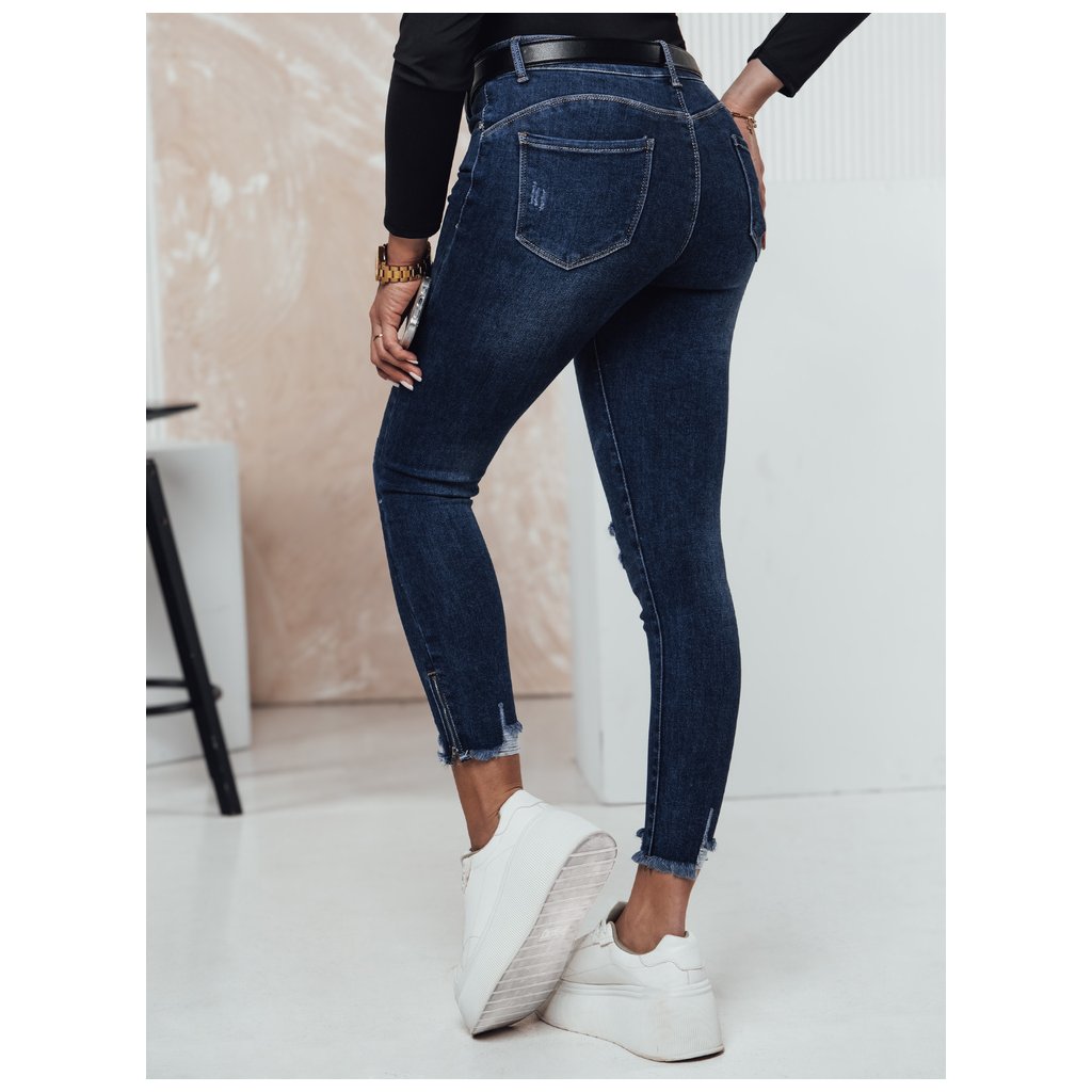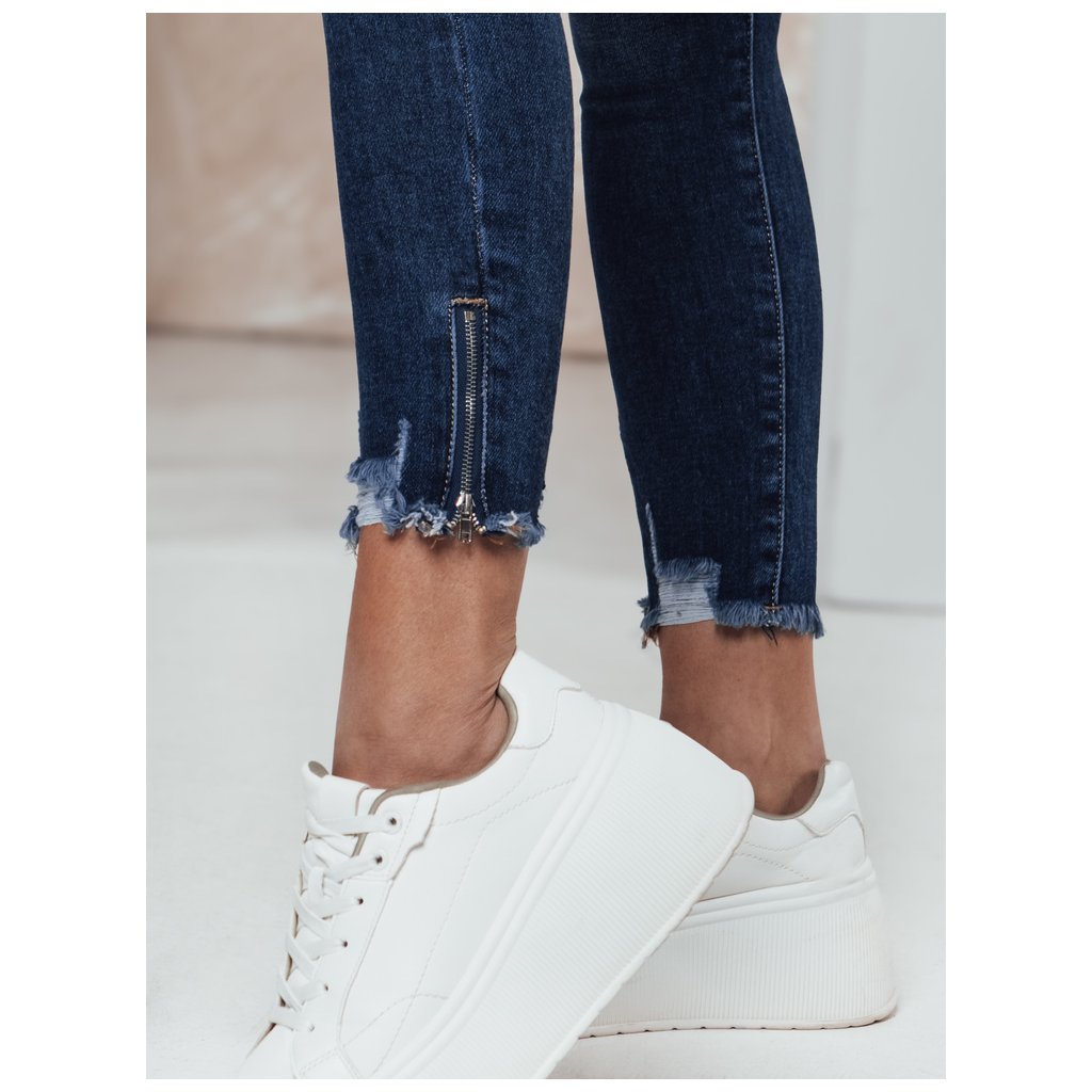 Dámské džínové džíny. Zapínání na zip a knoflík. Pět kapes. S efektem push-up. Dekorativní opotřebení a roztřepené lemy. Zipy na lemech. Barva: Tmavě modrá. Složení: 93% bavlna, 5% polyester, 2% elastan.