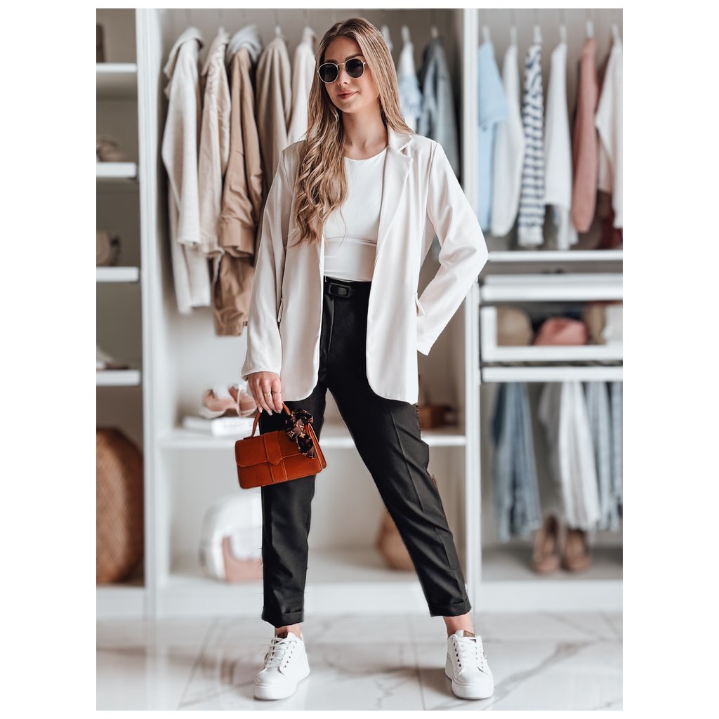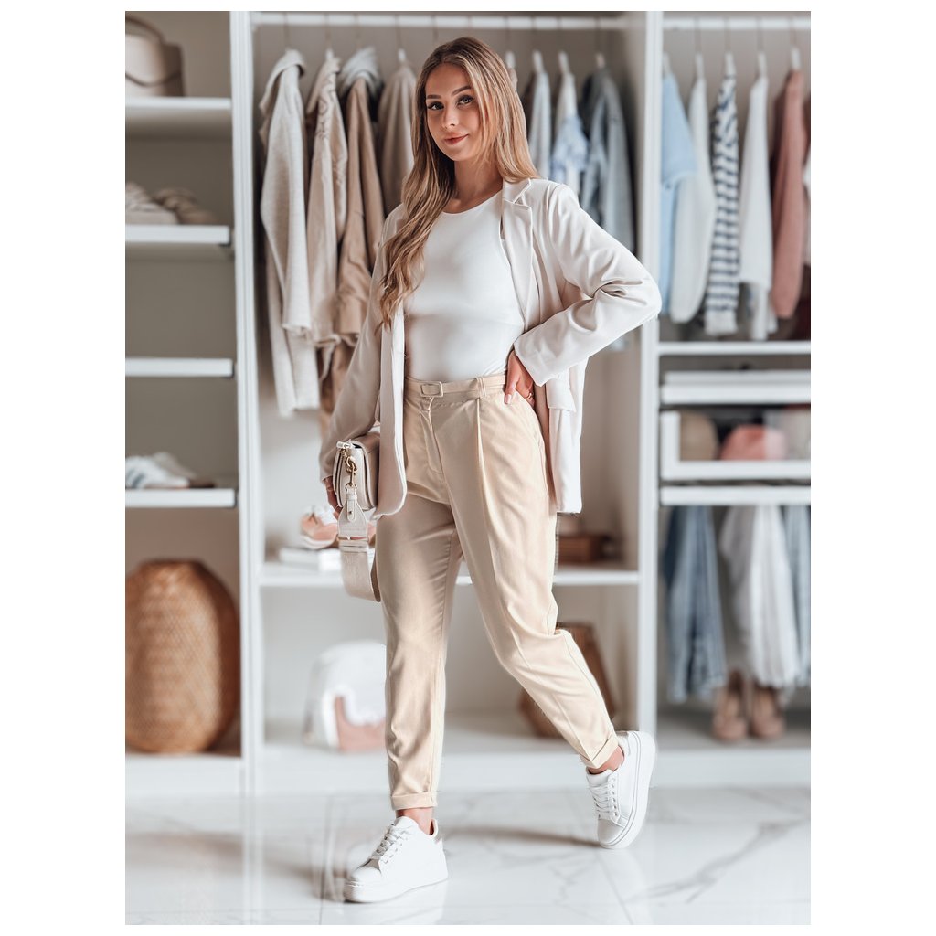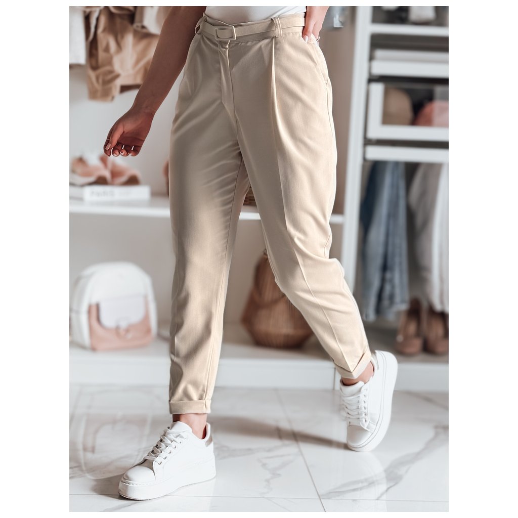 Klasické dámské kalhoty s elegantním nádechem. Vysoký pas a plisování opticky zeštíhlují postavu a součástí je pásek, který dotváří celkový vzhled. Zapínají se na knoflík a zip a mají kapsy pro větší pohodlí. Ideální do práce i na společenské akce.