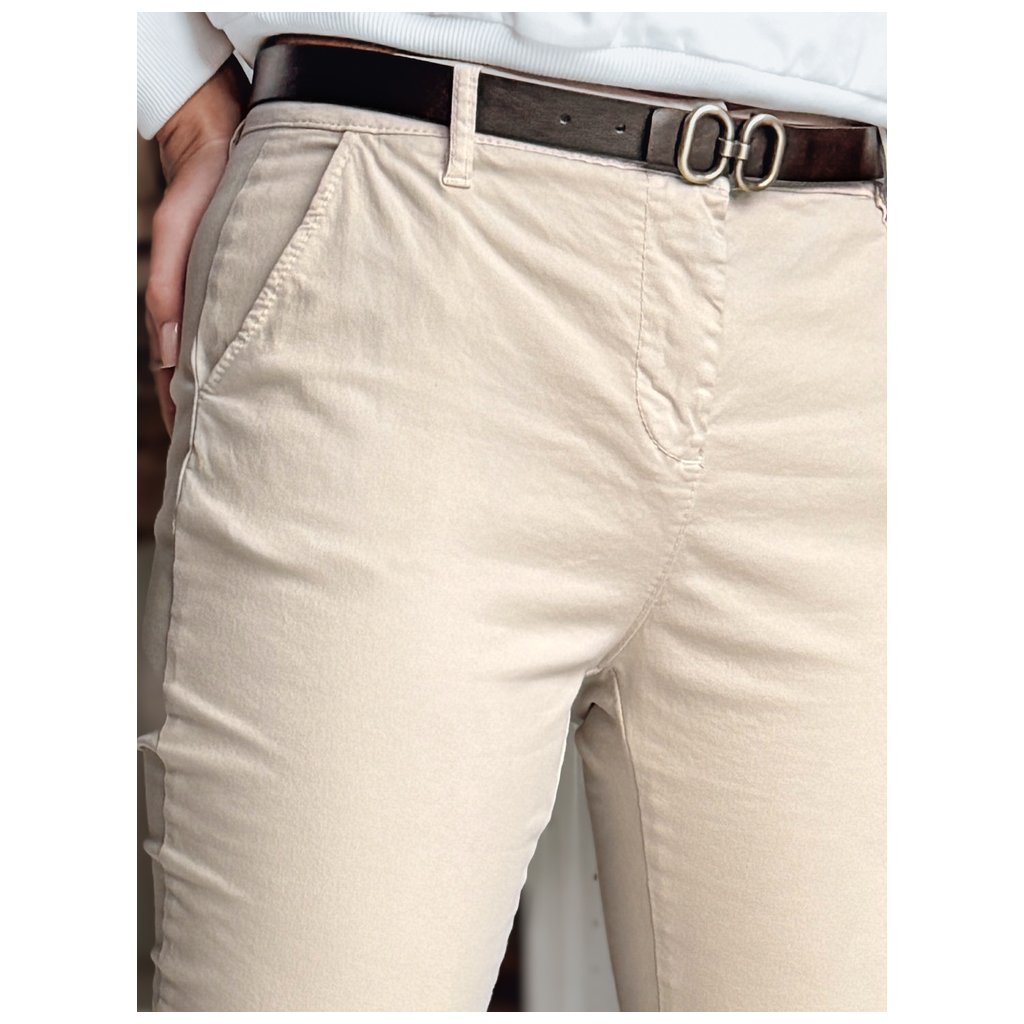Tyto dámské kalhoty slim fit dokonale zdůrazňují postavu a opticky zeštíhlují nohy. Mají zapínání na knoflík a zip, dvě přední kapsy a ozdobné zadní kapsy. Středně vysoký pas zajišťuje pohodlí, zatímco připevněný pásek dodává stylový nádech. Ideální pro každodenní nošení i elegantní outfity.