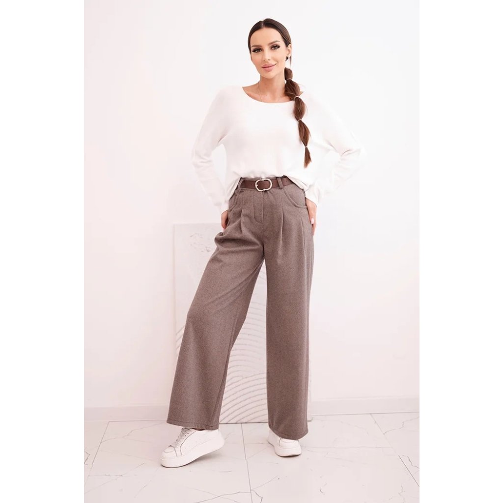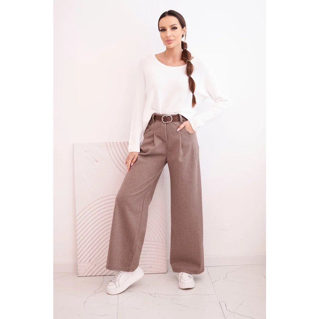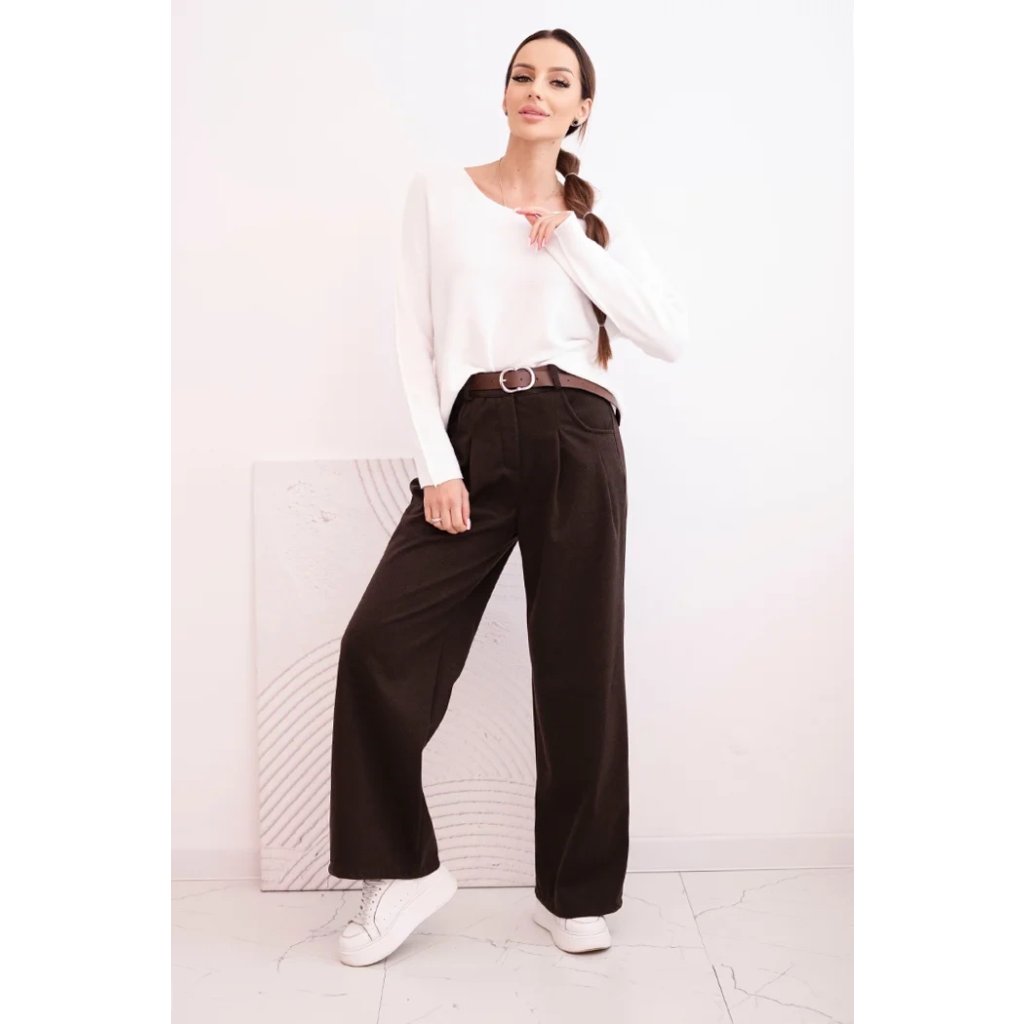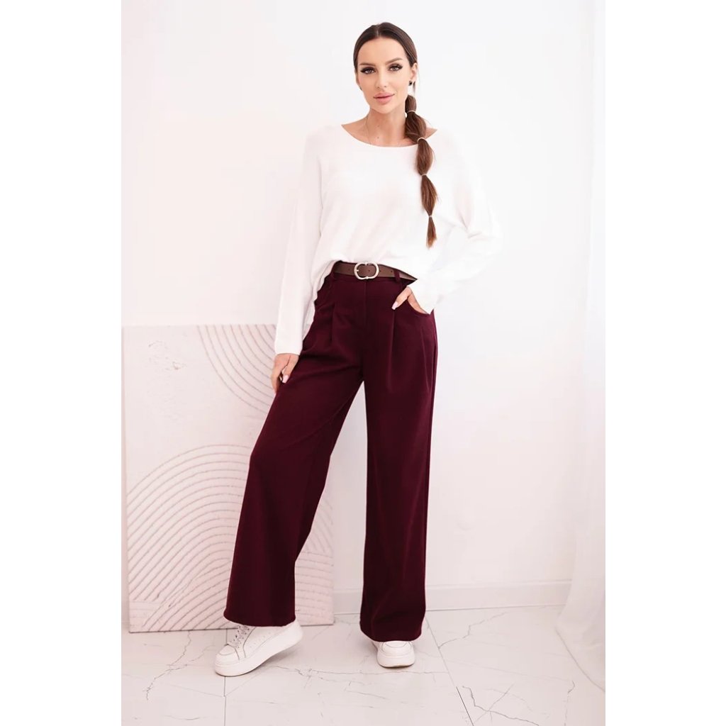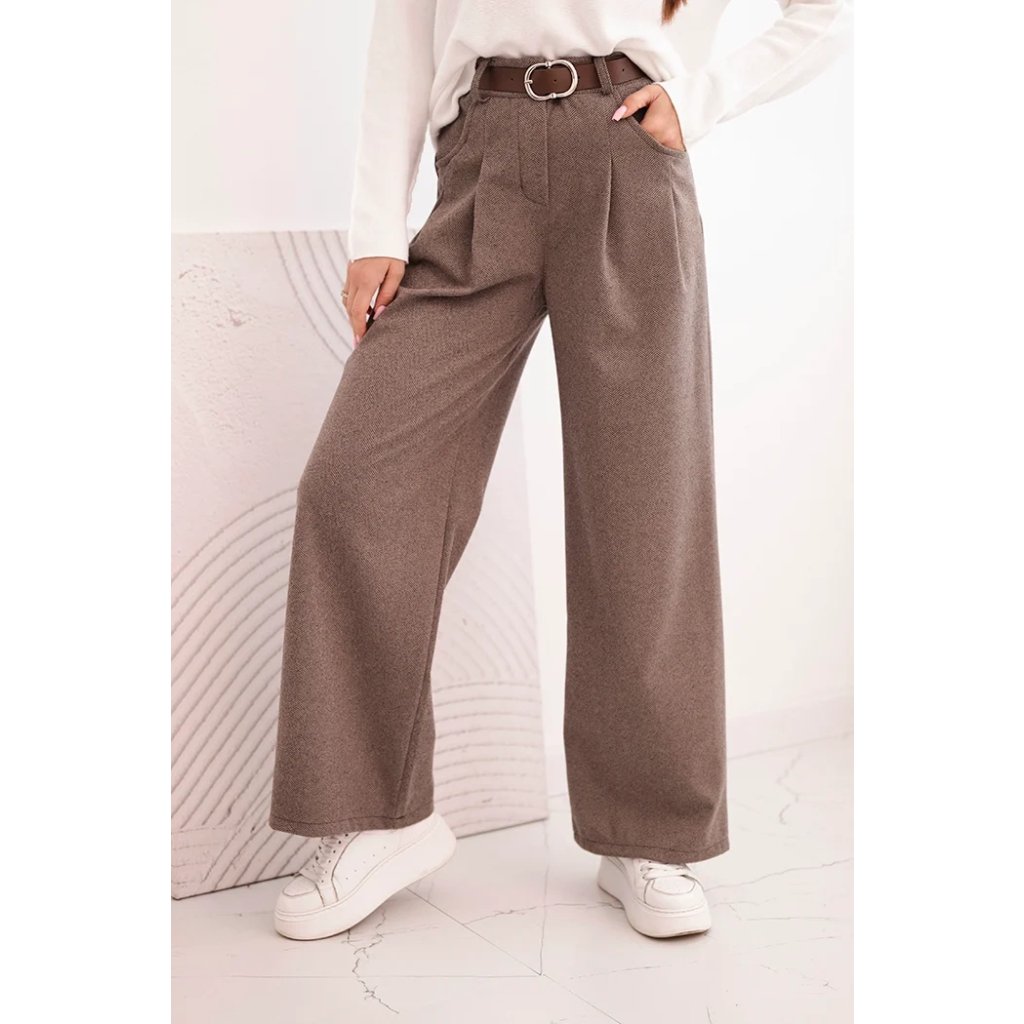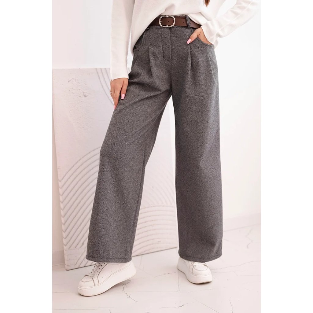 Elegantní dámské kalhoty s širokou nohavicí a páskem jsou nezbytností v podzimně-zimním šatníku každé ženy. Vyrobeny z vysoce kvalitního materiálu, zajišťují pohodlí při nošení a stylový vzhled. Volný střih a vysoký pas opticky zeštíhlují postavu, a přidaný pásek krásně zvýrazňuje pas.