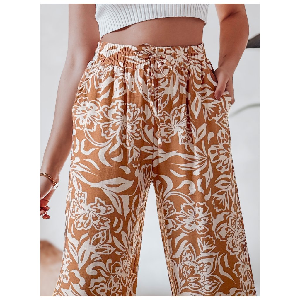 Tyto lehké široké kalhoty s elastickým pasem a zavazováním zaujmou nejen svým pohodlím, ale i módním květinovým potiskem. Prodyšná tkanina je ideální pro letní procházky, výlety a každodenní outfity. Vysoký pas opticky prodlužuje postavu, zatímco kapsy dodávají ležérní a okouzlující nádech. Ideální na jaro a léto.