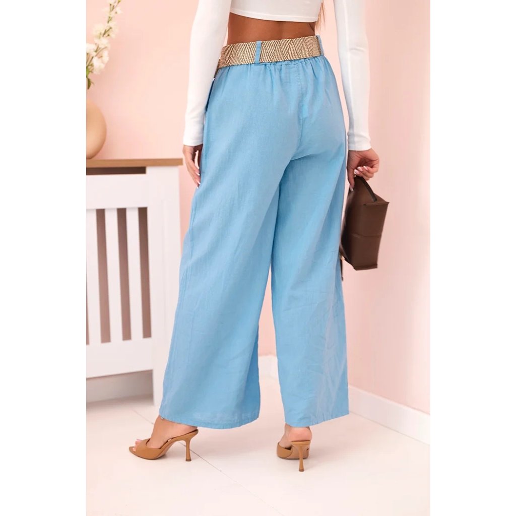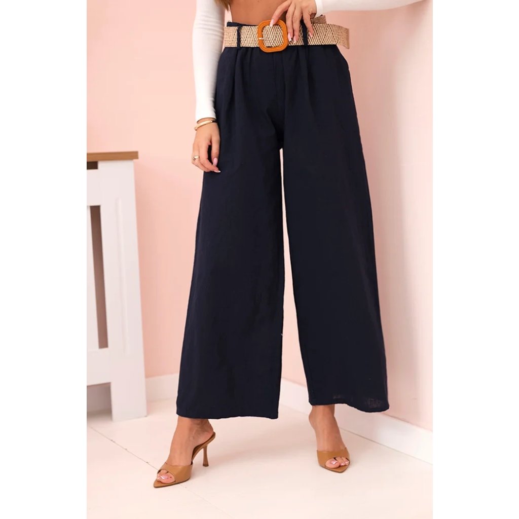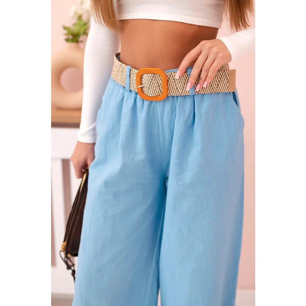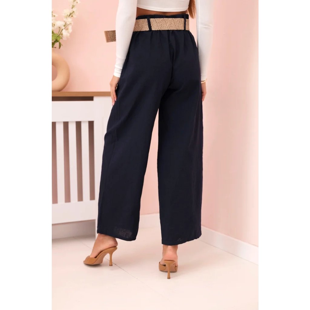 Tyto stylové dámské kalhoty se širokými nohavicemi a ozdobným páskem jsou ideální volbou pro ženy, které si cení pohodlí a módního vzhledu. Vyrobené z přírodního materiálu budou skvělou volbou pro teplejší dny, nabízejí prodyšnost a pohodlí po celý den. Jejich volný, elegantní střih s vysokým pasem krásně tvaruje postavu a stylový pletený pásek zdůrazňuje pas a dodává celku výjimečný charakter. Jedná se o univerzální model, který se perfektně hodí jak pro každodenní stylizace, tak i na elegantnější příležitosti. Skvěle ladí s lehkými halenkami, topy nebo saky. Italská výroba zaručuje vysokou kvalitu zpracování a módní design. Velikost je univerzální a bude vyhovovat ženám velikostí S, M nebo L.