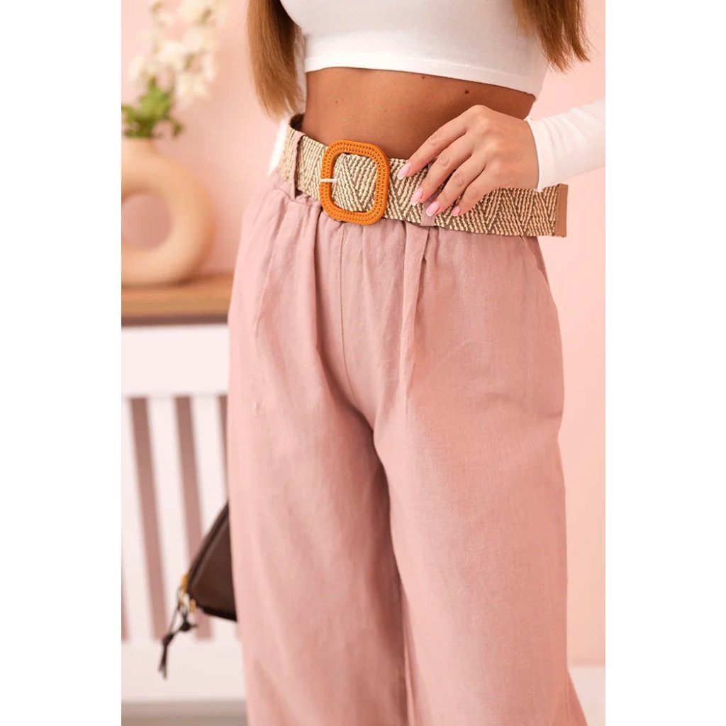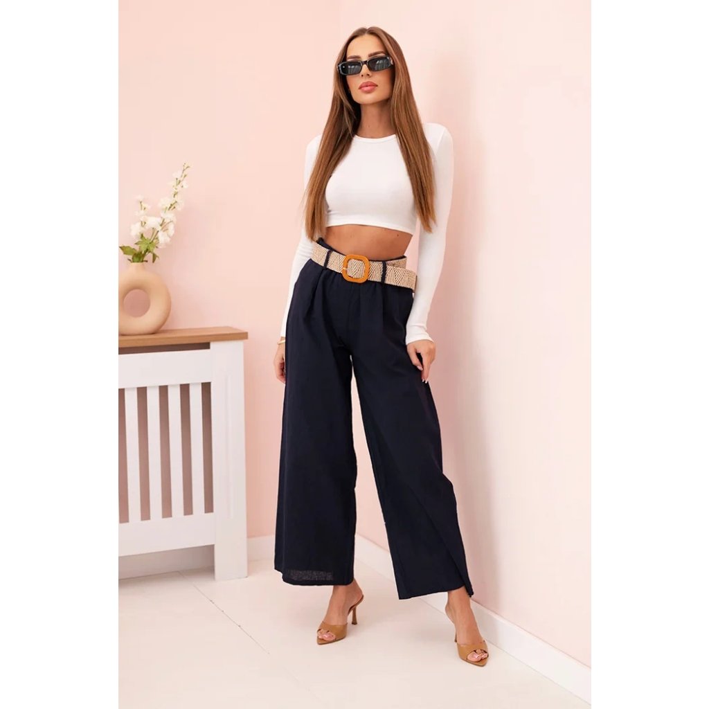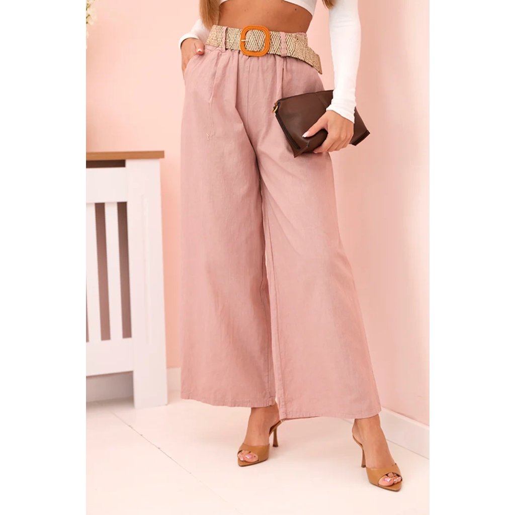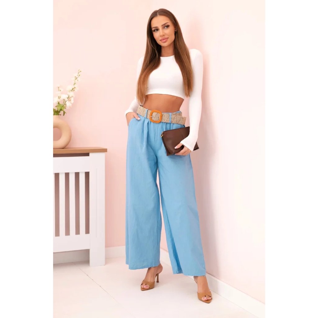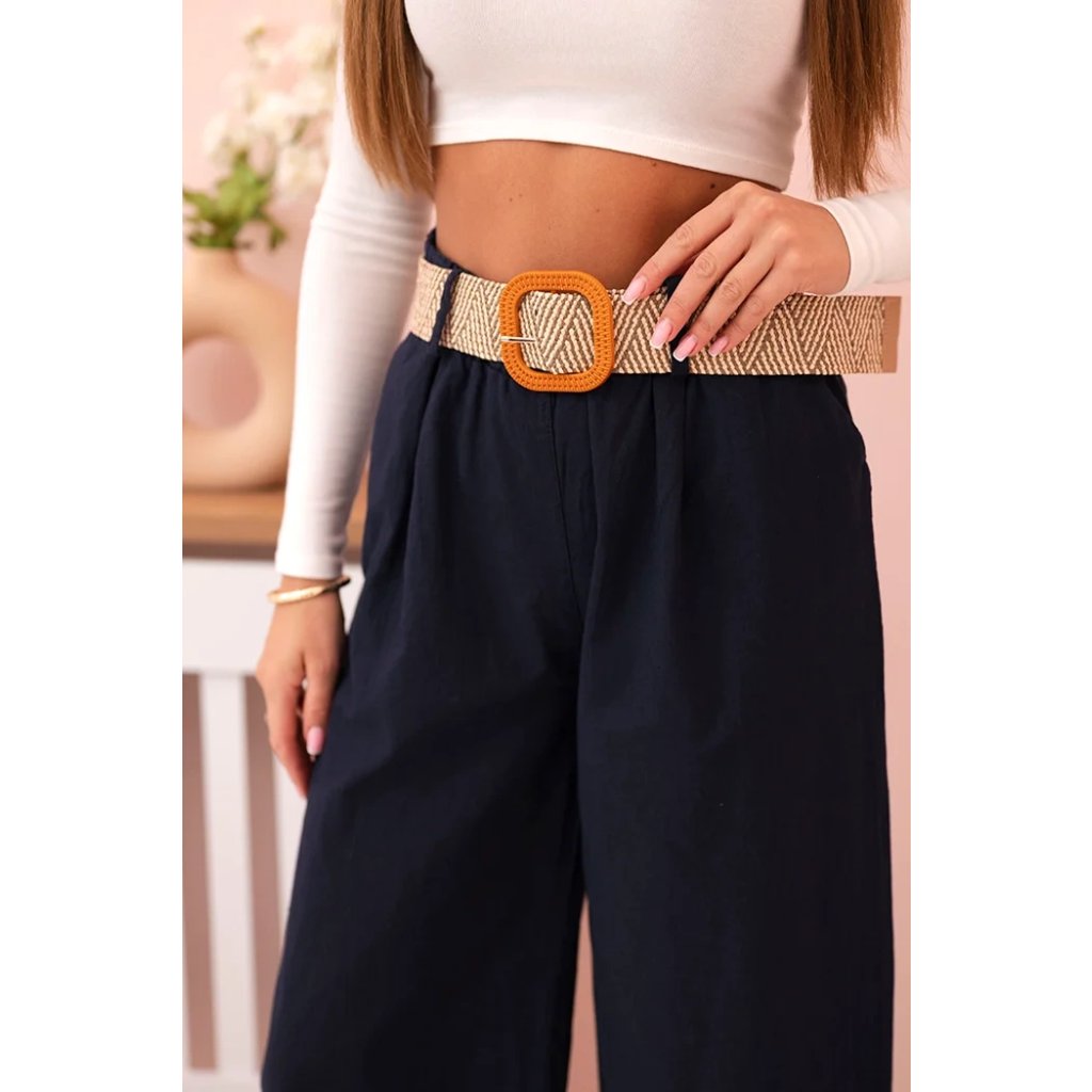 Tyto stylové dámské kalhoty se širokými nohavicemi a ozdobným páskem jsou ideální volbou pro ženy, které si cení pohodlí a módního vzhledu. Vyrobené z přírodního materiálu budou skvělou volbou pro teplejší dny, nabízejí prodyšnost a pohodlí po celý den. Jejich volný, elegantní střih s vysokým pasem krásně tvaruje postavu a stylový pletený pásek zdůrazňuje pas a dodává celku výjimečný charakter. Jedná se o univerzální model, který se perfektně hodí jak pro každodenní stylizace, tak i na elegantnější příležitosti. Skvěle ladí s lehkými halenkami, topy nebo saky. Italská výroba zaručuje vysokou kvalitu zpracování a módní design. Velikost je univerzální a bude vyhovovat ženám velikostí S, M nebo L.