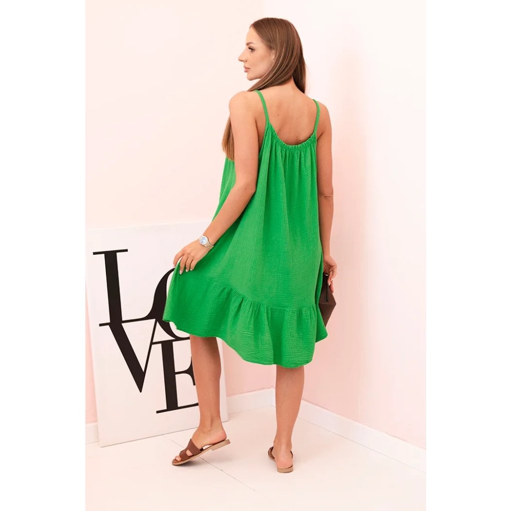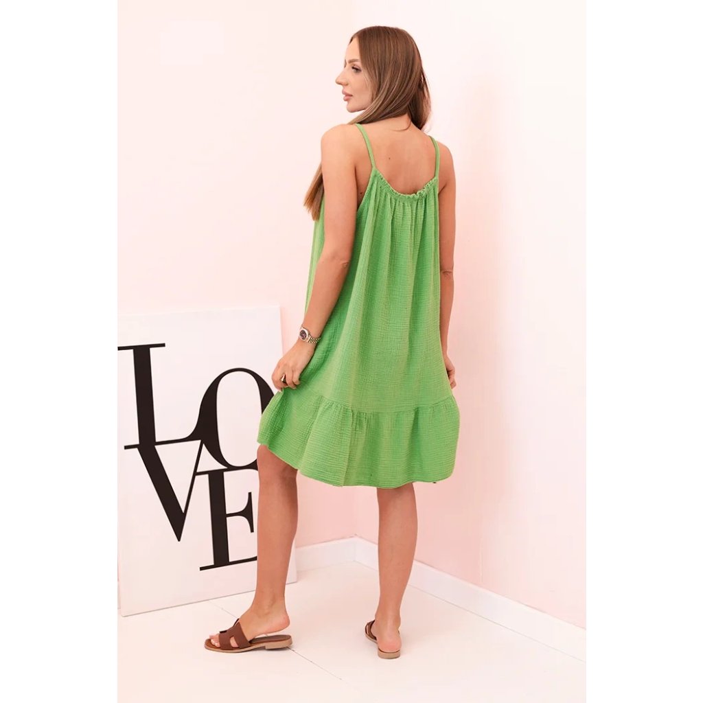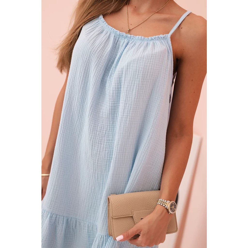 Lehké a vzdušné dámské mušelínové šaty na ramínka s volánem jsou ideální volbou na teplé letní dny. Vyrobené ze 100% přírodní bavlny, potěší svou měkkostí a jemností na dotek, poskytující maximální pohodlí při nošení. Volný střih s rozšířeným spodním lemem zakončeným volánem krásně sedí na postavě, maskuje drobné nedokonalosti a poskytuje úplnou volnost pohybu. Tento model se skvěle hodí jak na procházku po pláži, tak i na letní setkání s přáteli. Guma u výstřihu jemně zvýrazňuje ramena a tenká ramínka dodávají celému outfitu lehkost a ženský šarm. Díky své univerzálnosti ji snadno sladíte se sandály, kloboukem nebo boho kabelkou.