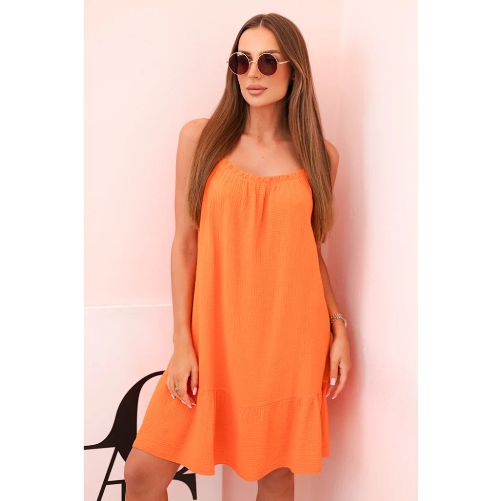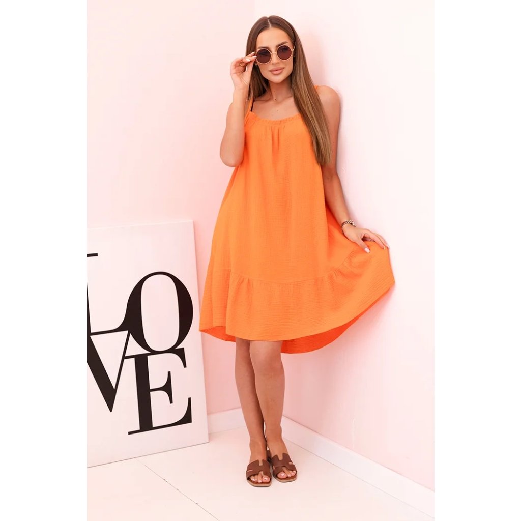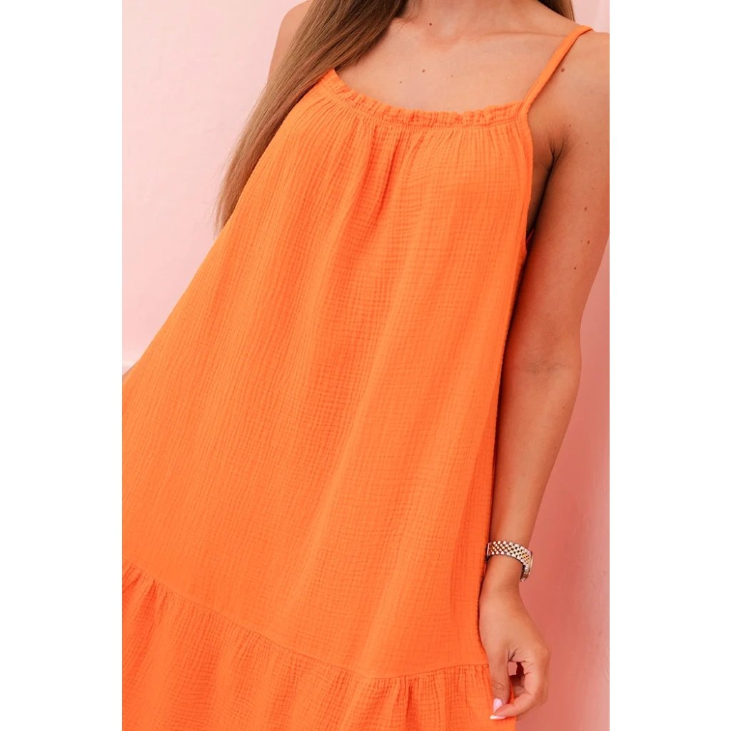 Lehké a vzdušné dámské mušelínové šaty na ramínka s volánem jsou ideální volbou na teplé letní dny. Vyrobené ze 100% přírodní bavlny, potěší svou měkkostí a jemností na dotek, poskytující maximální pohodlí při nošení. Volný střih s rozšířeným spodním lemem zakončeným volánem krásně sedí na postavě, maskuje drobné nedokonalosti a poskytuje úplnou volnost pohybu. Tento model se skvěle hodí jak na procházku po pláži, tak i na letní setkání s přáteli. Guma u výstřihu jemně zvýrazňuje ramena a tenká ramínka dodávají celému outfitu lehkost a ženský šarm. Díky své univerzálnosti ji snadno sladíte se sandály, kloboukem nebo boho kabelkou.