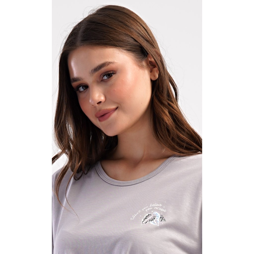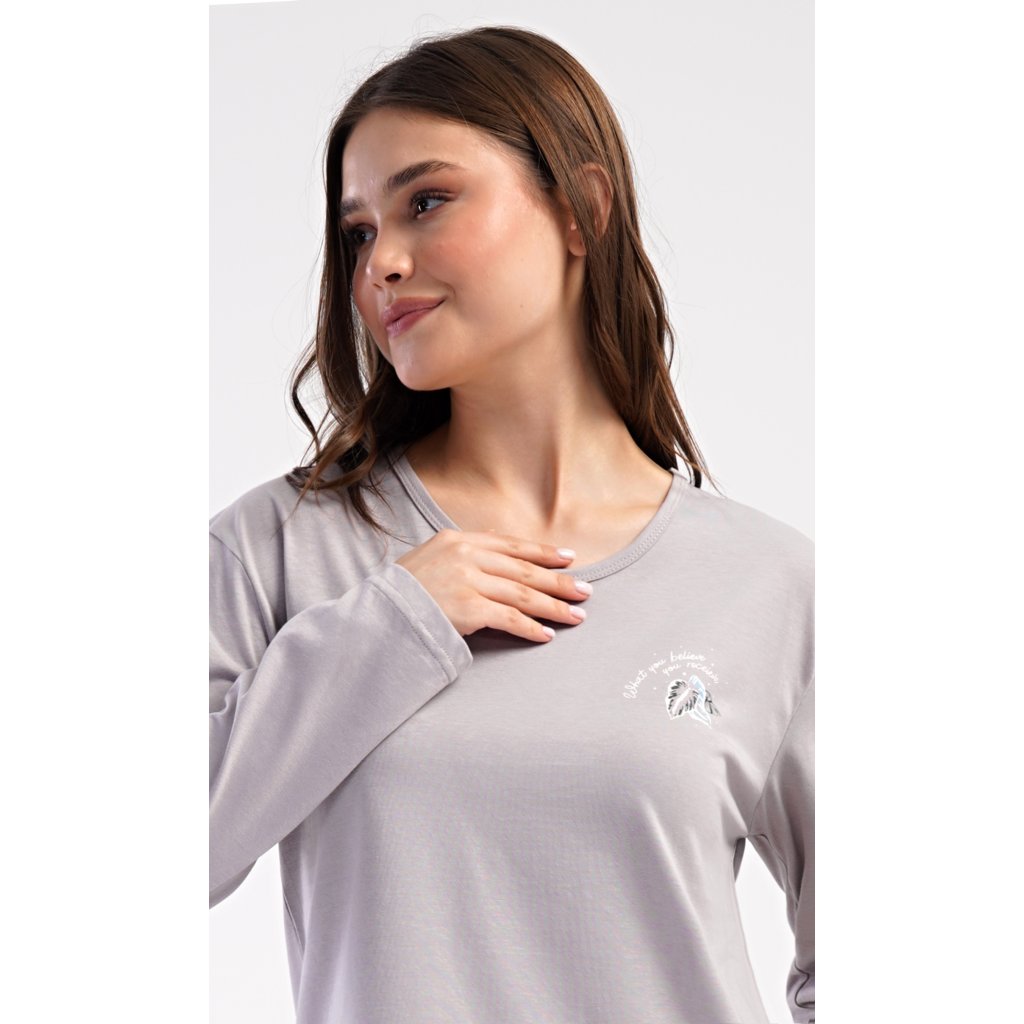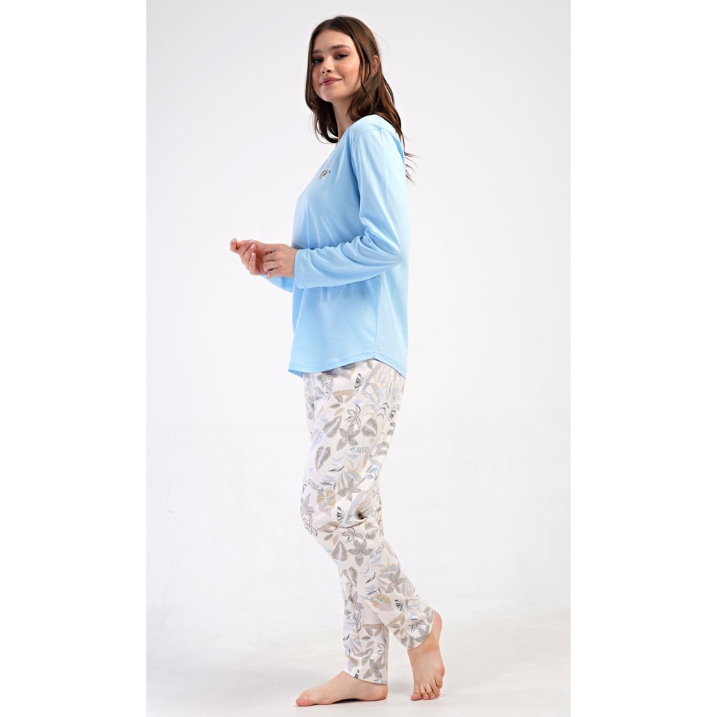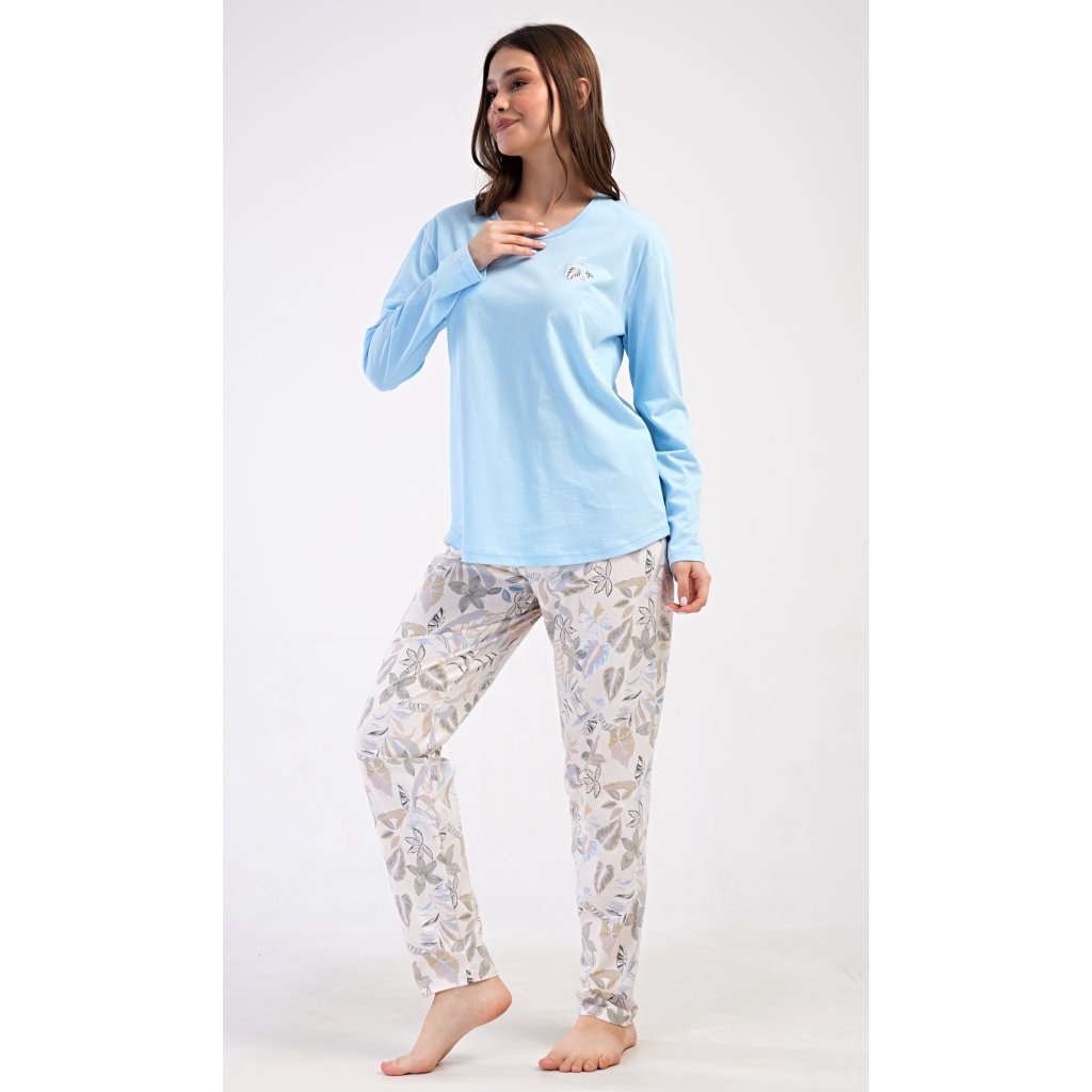 Dámské bavlněné dlouhé pyžamo Alex. Dámské pyžamo se skládá z trika s dlouhým rukávem a dlouhých kalhot. Triko je jednobarevné, zdobené na hrudi drobným obrázkem listu. Motiv listů se opakuje i na kalhotách, které mají v pase gumu a šňůrku na stažení, nemají kapsy. Použitý bavlněný materiál je poddajný a příjemný na dotek.
