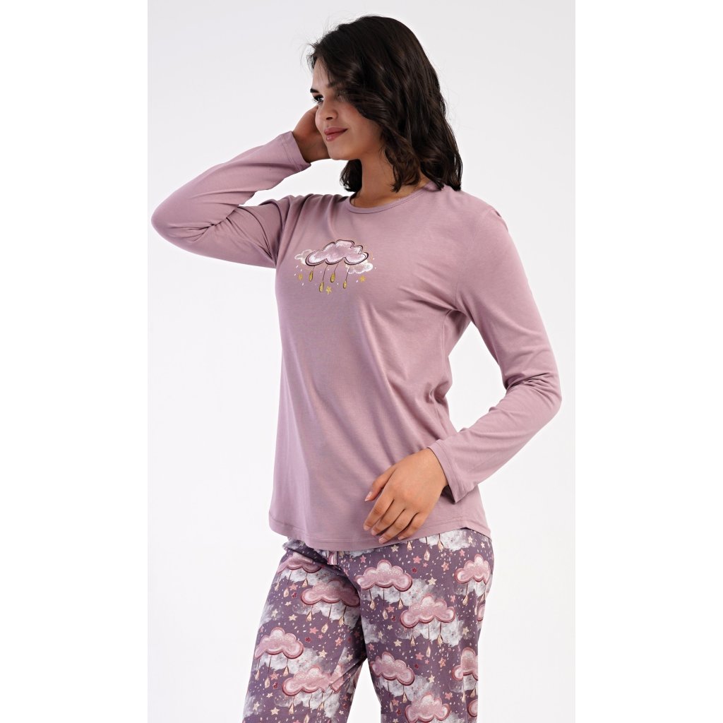 Dámské bavlněné dlouhé pyžamo Amelia. Dámské pyžamo se skládá z trika s dlouhým rukávem a dlouhých kalhot. Jednobarevné triko s kulatým výstřihem zdobí obrázek obláčku. Tento motiv se opakuje i na kalhotách, které mají v pase gumu a šňůrku na stažení, nemají kapsy. Použitý bavlněný materiál je poddajný a příjemný na dotek.