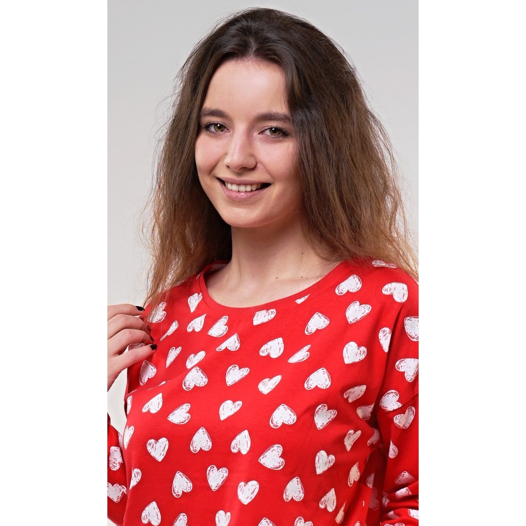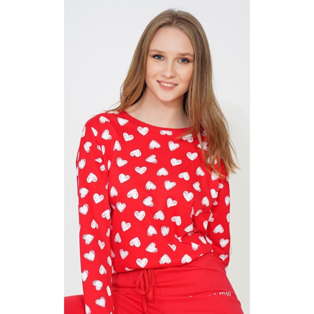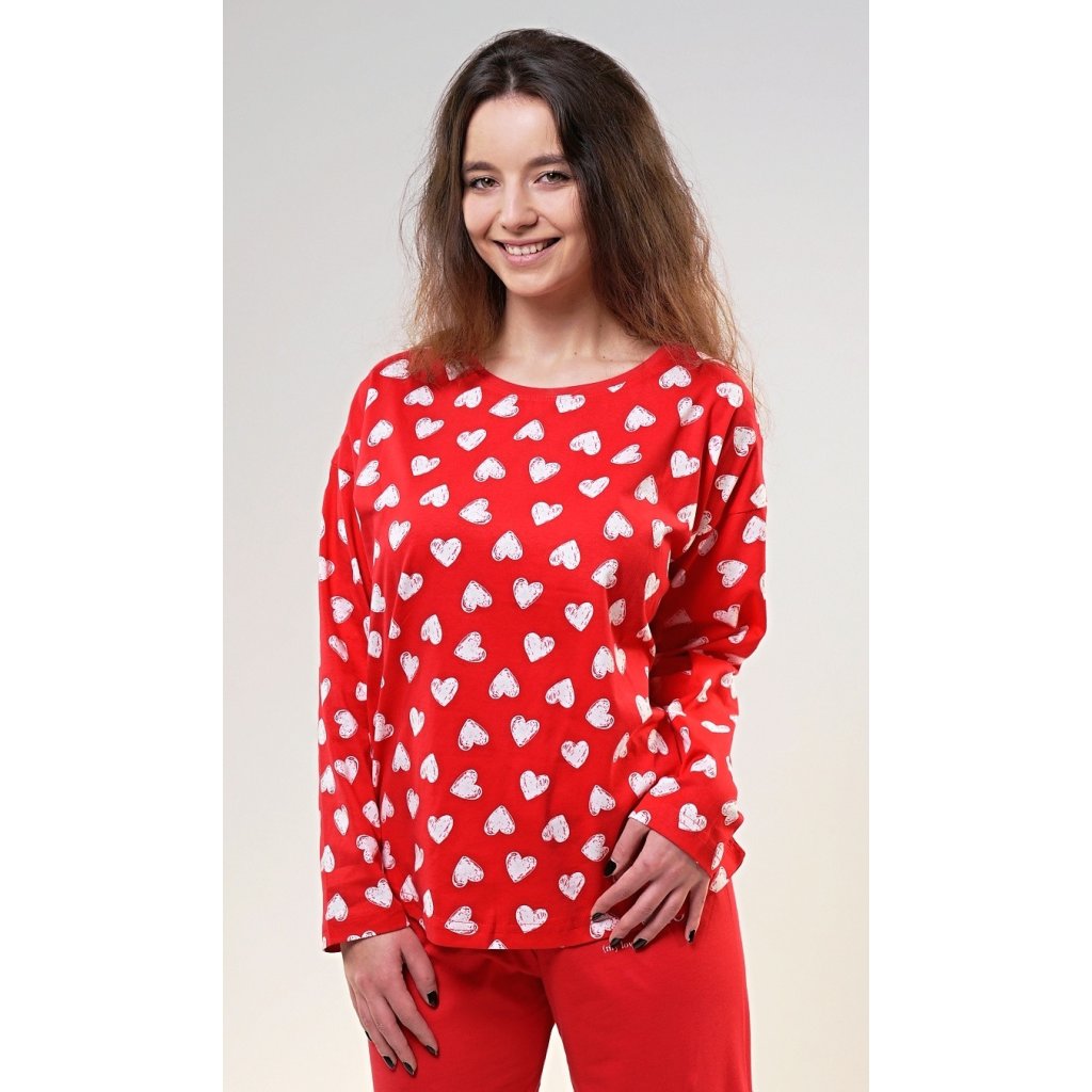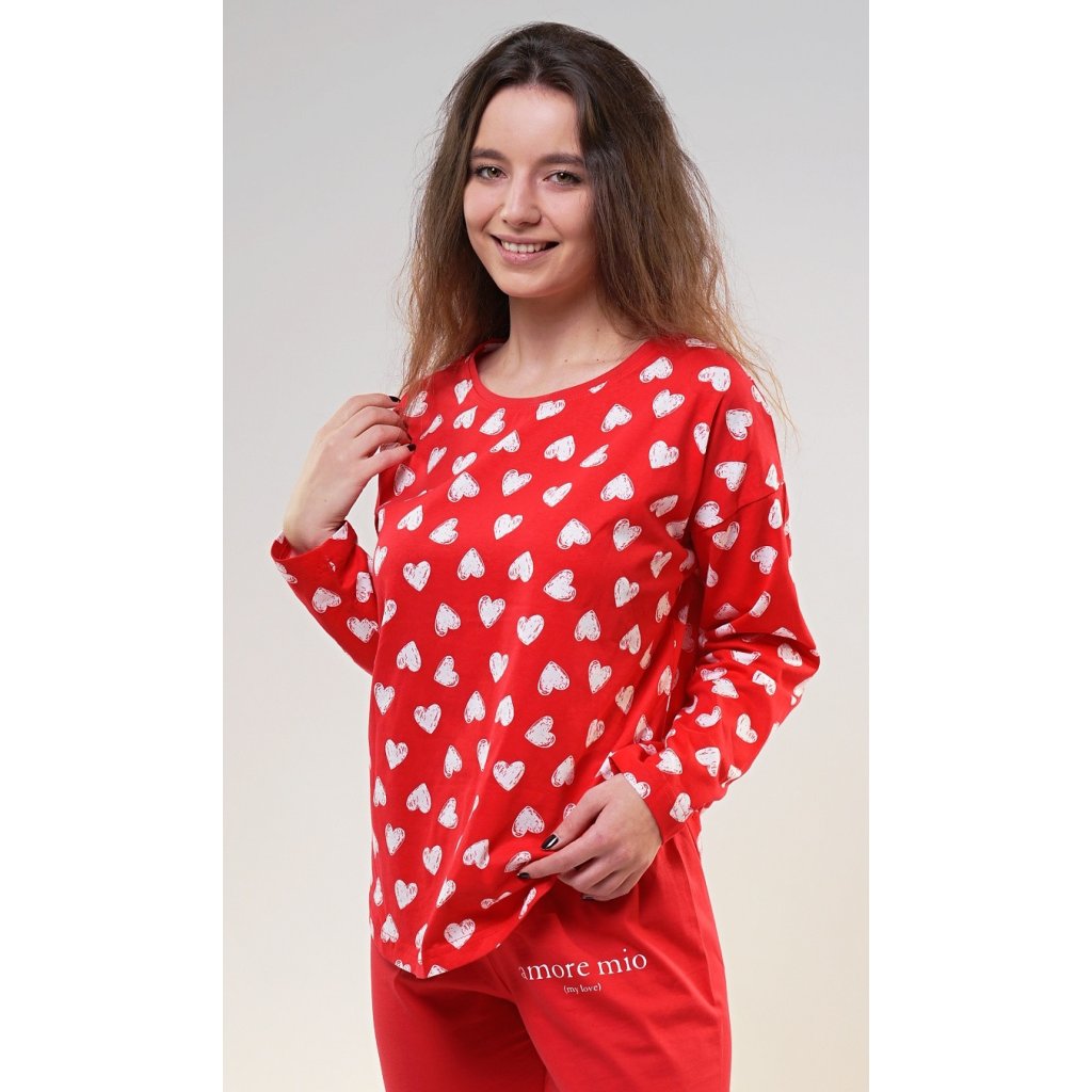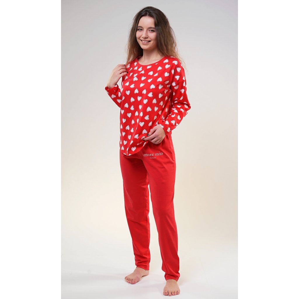Dámské bavlněné pyžamo dlouhé Amore mio. Dámské pyžamo se skládá z trika s dlouhým rukávem a dlouhých kalhot. Triko je jednobarevné - červené s potiskem bílých srdíček. Jednobarevné kalhoty mají gumu a šňůrkou na stažení v pase, nemají kapsy. Zdobí je nápis amore mio (my love). Použitý bavlněný materiál je poddajný a příjemný na dotek.