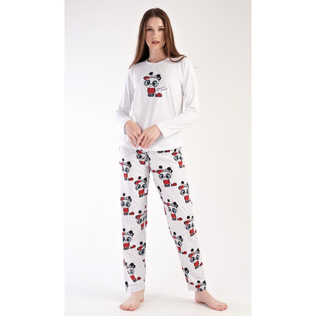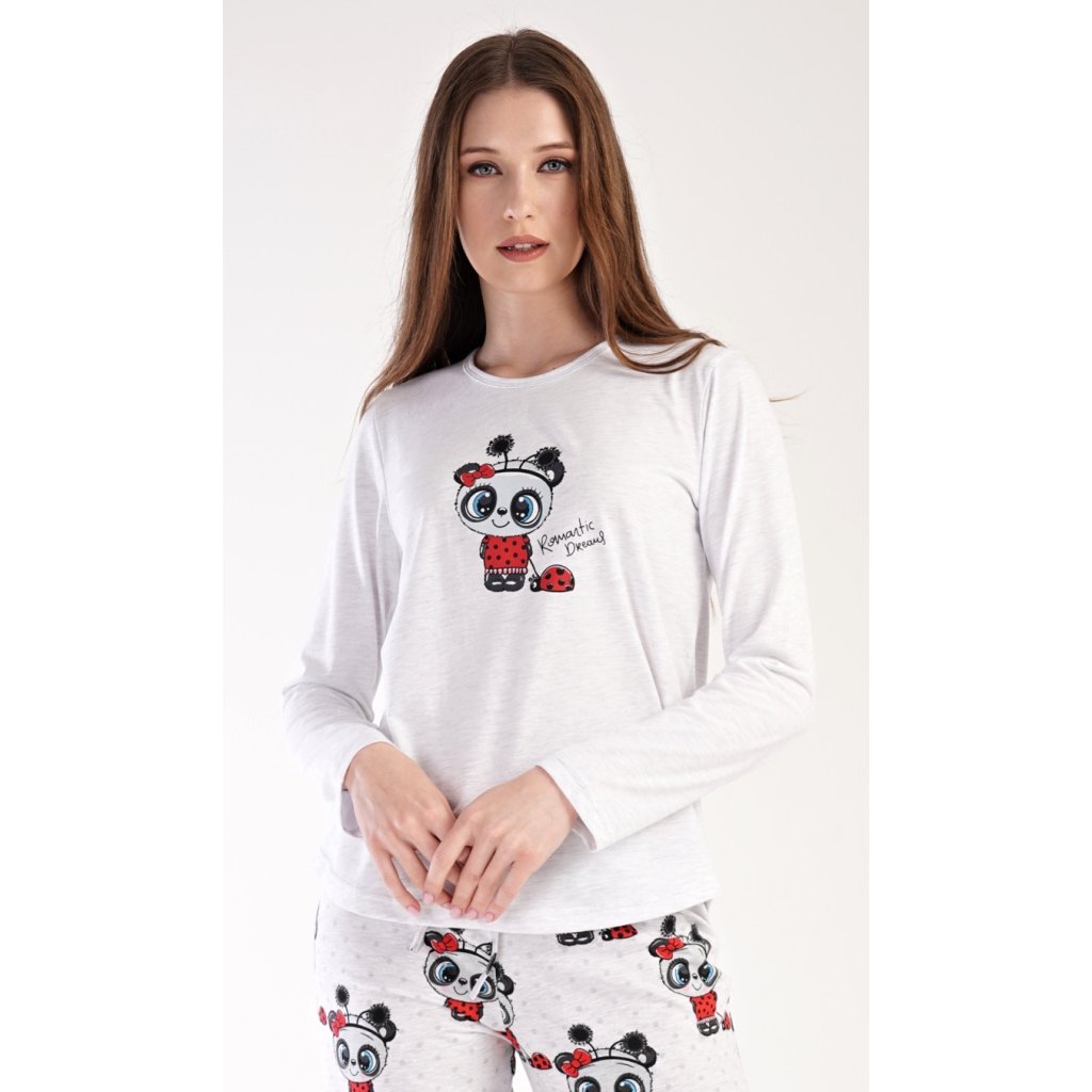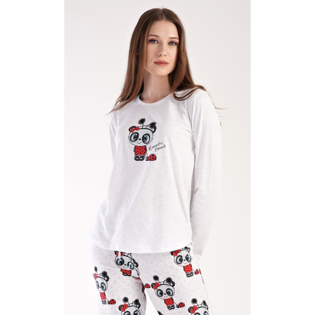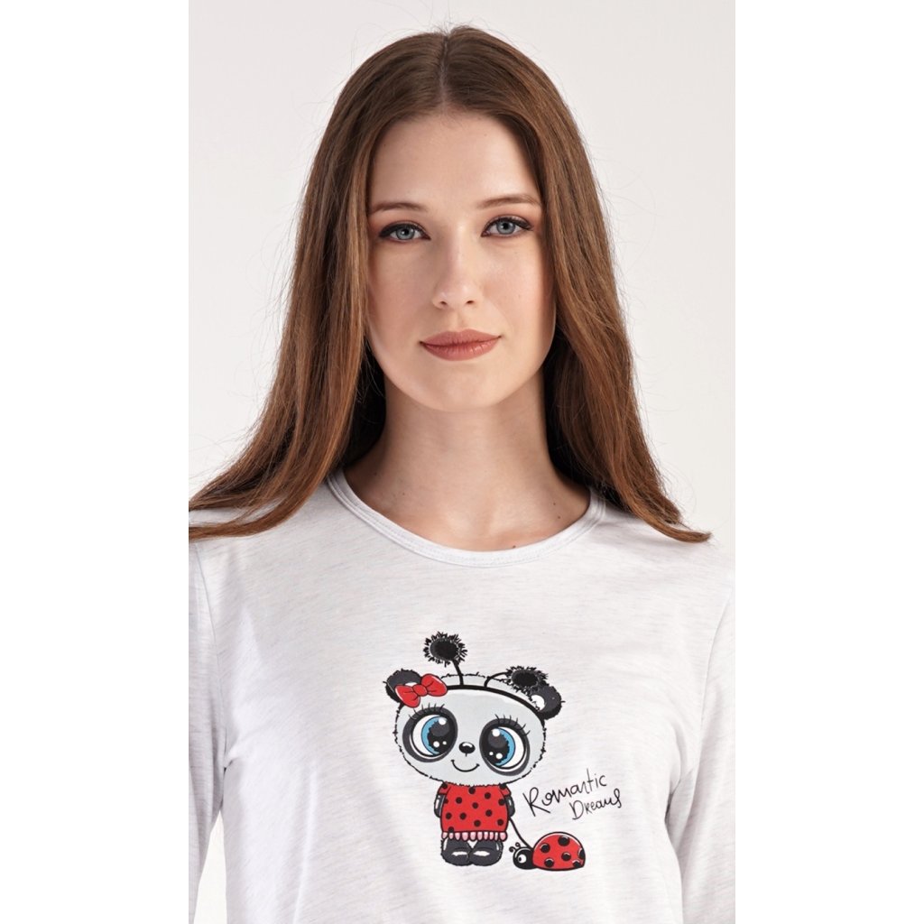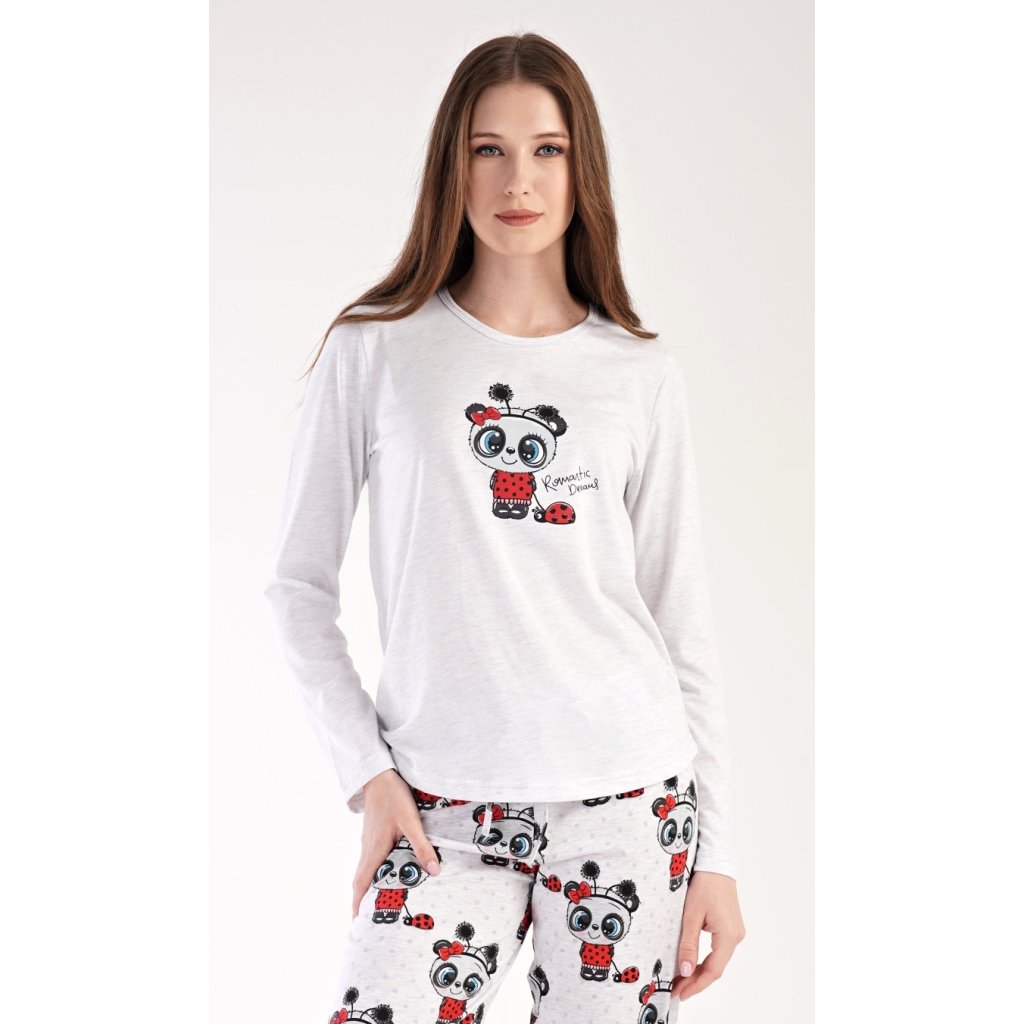Dámské pyžamo dlouhé Anežka. Dámské pyžamo se skládá z trika s dlouhým rukávem a dlouhých kalhot. Triko je jednobarevné, zdobené nápisem ROMANTIC DREAMS a obrázkem roztomilé pandy. Kalhoty jsou světle šedé, potištěné stejným motivem. Kalhoty mají v pase gumu a šňůrku na stažení. Použitý materiál je poddajný a jemný na dotek.