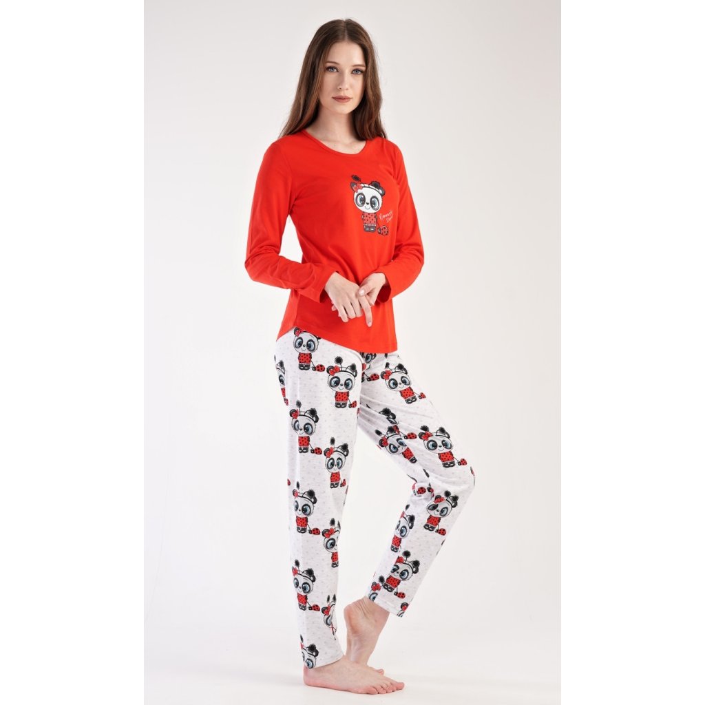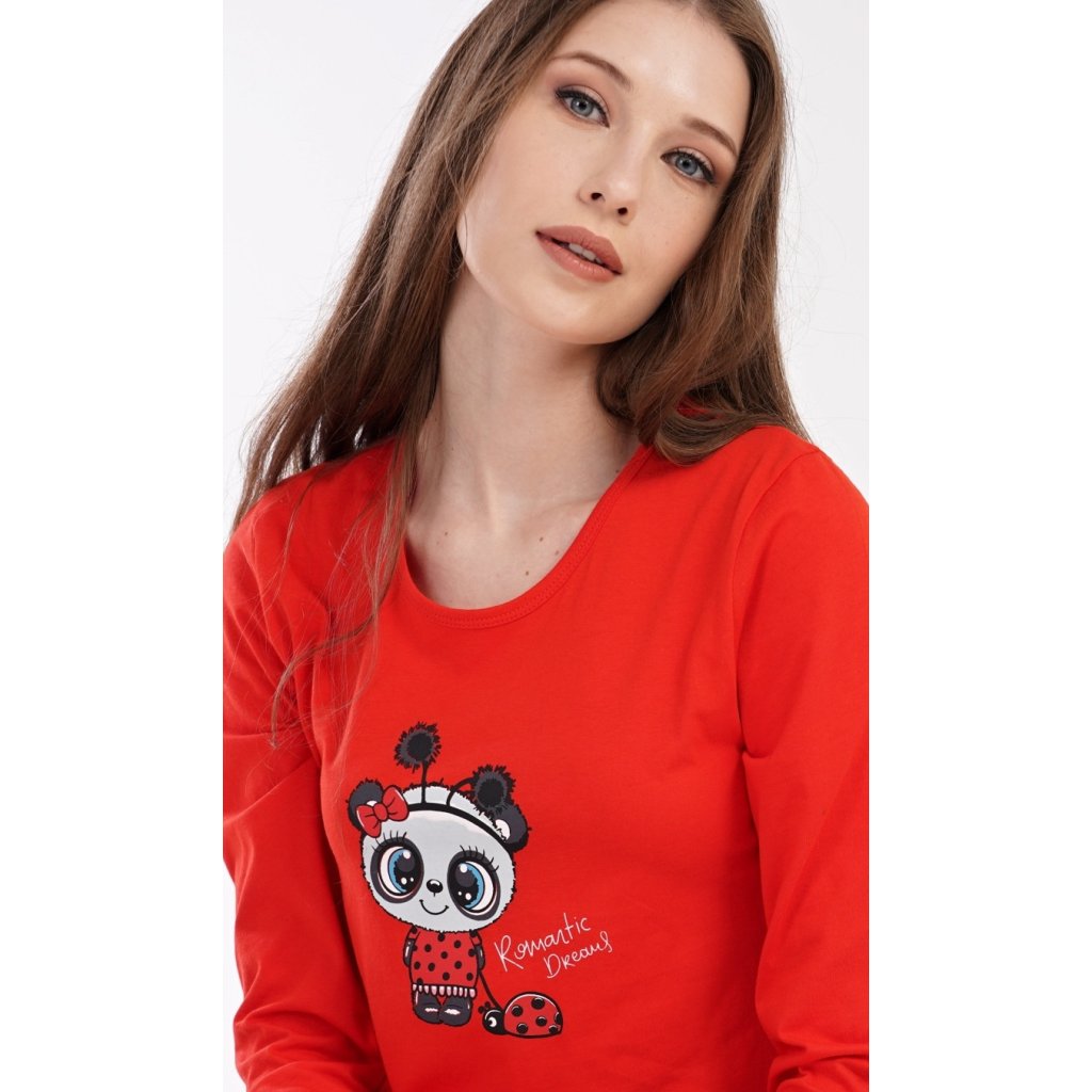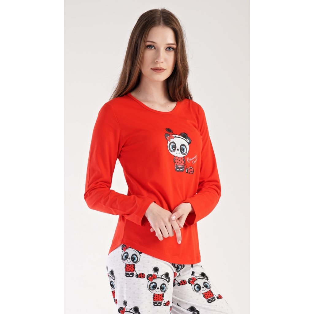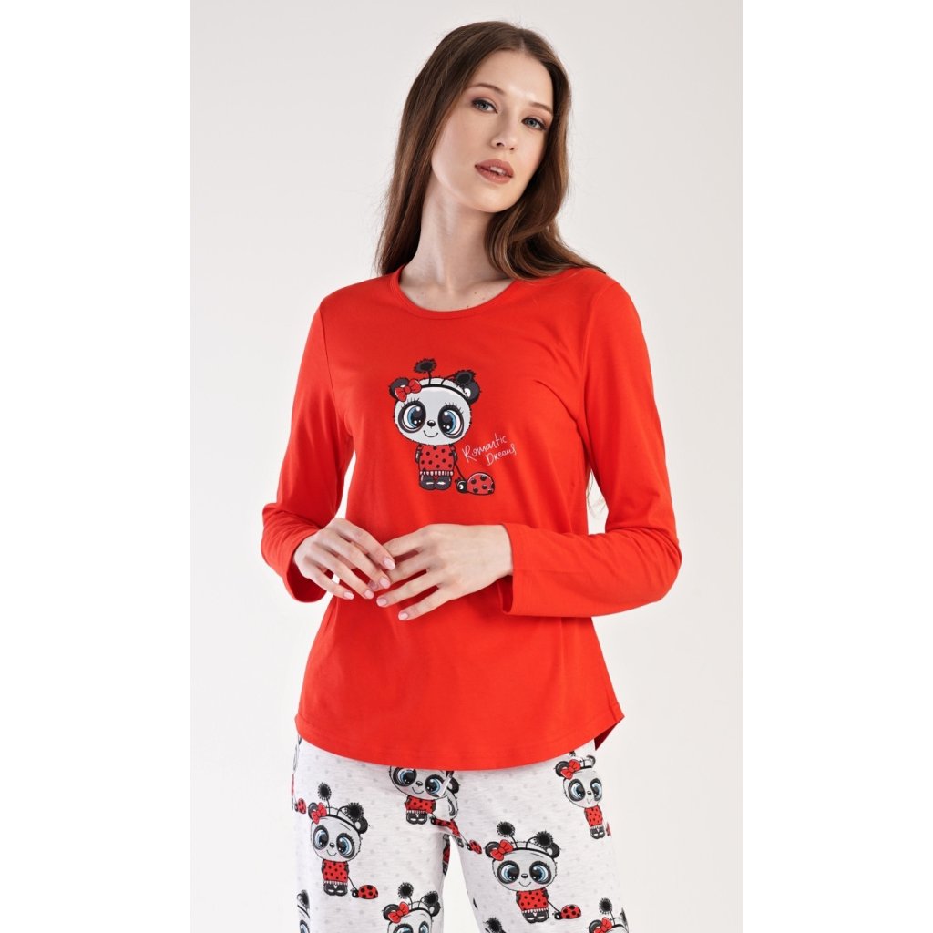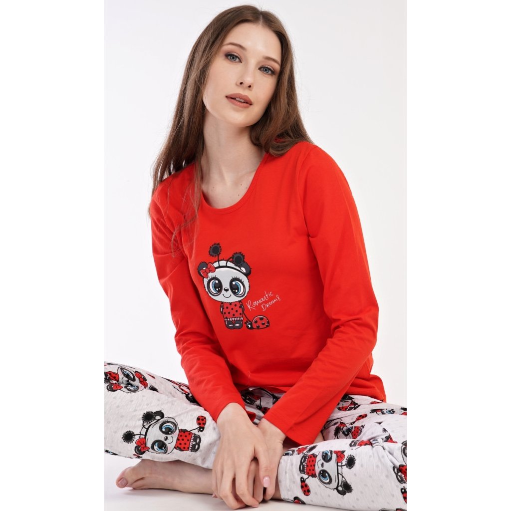 Dámské pyžamo dlouhé Anežka. Dámské pyžamo se skládá z trika s dlouhým rukávem a dlouhých kalhot. Triko je jednobarevné, zdobené nápisem ROMANTIC DREAMS a obrázkem roztomilé pandy. Kalhoty jsou světle šedé, potištěné stejným motivem. Kalhoty mají v pase gumu a šňůrku na stažení. Použitý materiál je poddajný a jemný na dotek.