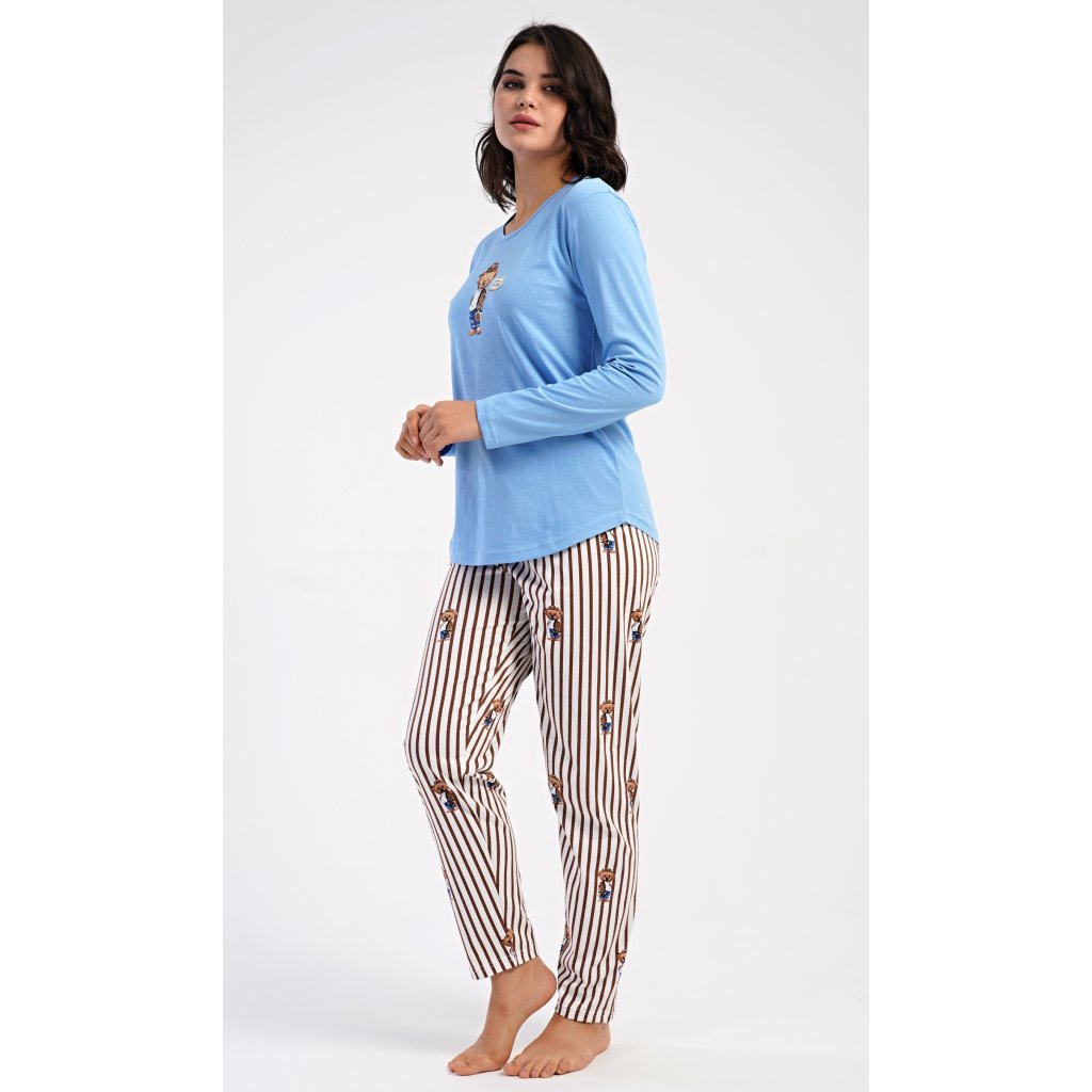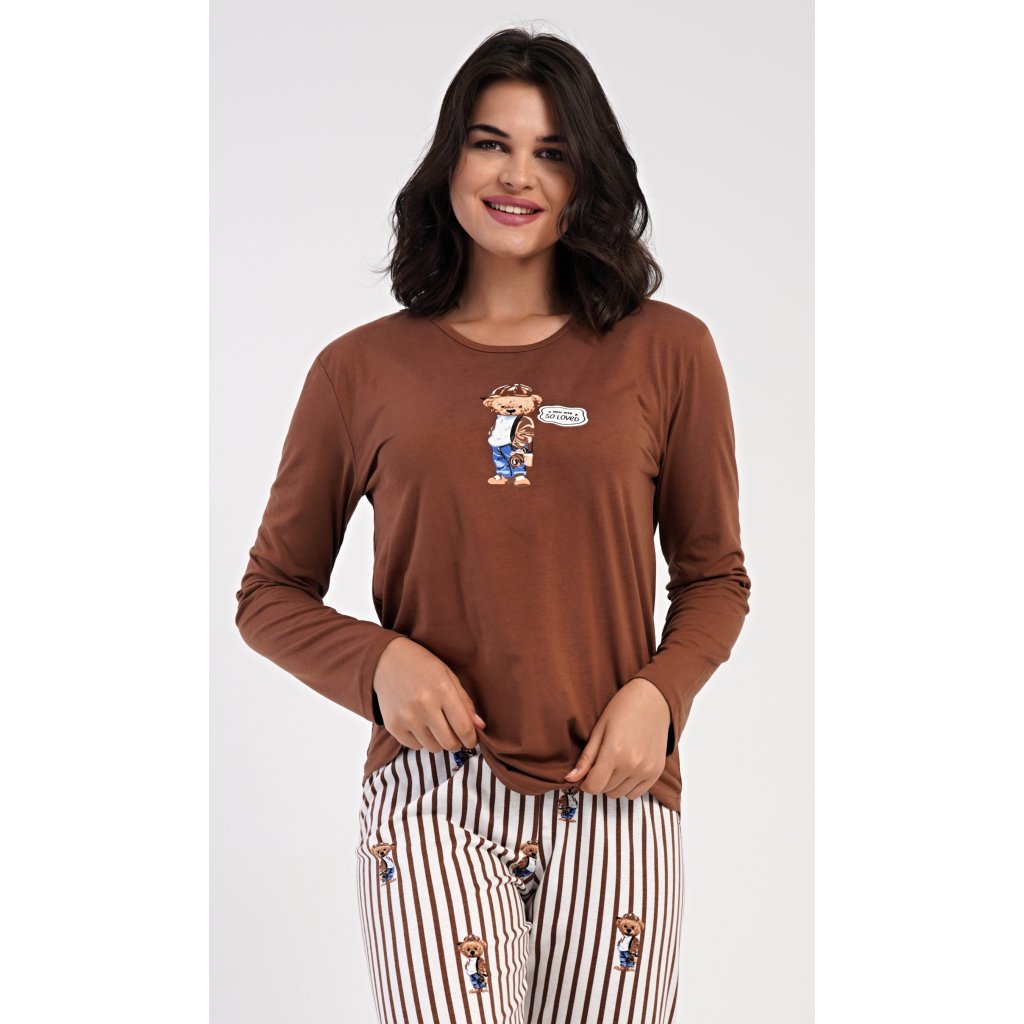 Dámské bavlněné dlouhé pyžamo Bear. Dámské pyžamo se skládá z trika s dlouhým rukávem a dlouhých kalhot. Jednobarevné triko je ozdobeno obrázkem medvěda. Tento motiv se opakuje i na proužkovaných kalhotách, které mají v pase gumu a šňůrku na stažení, nemají kapsy. Použitý bavlněný materiál je poddajný a příjemný na dotek.
