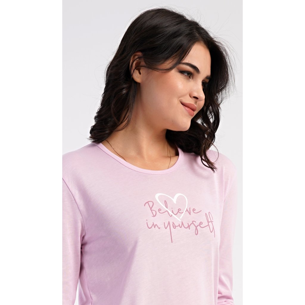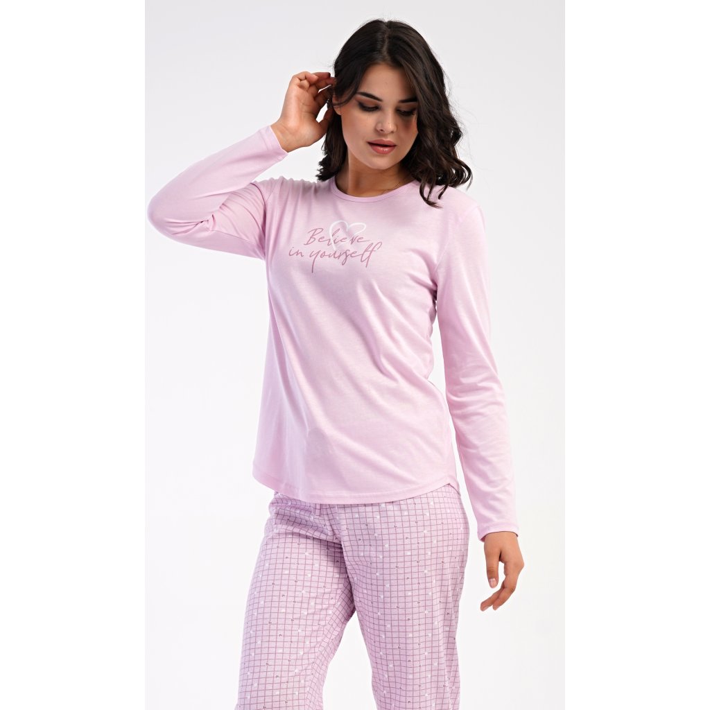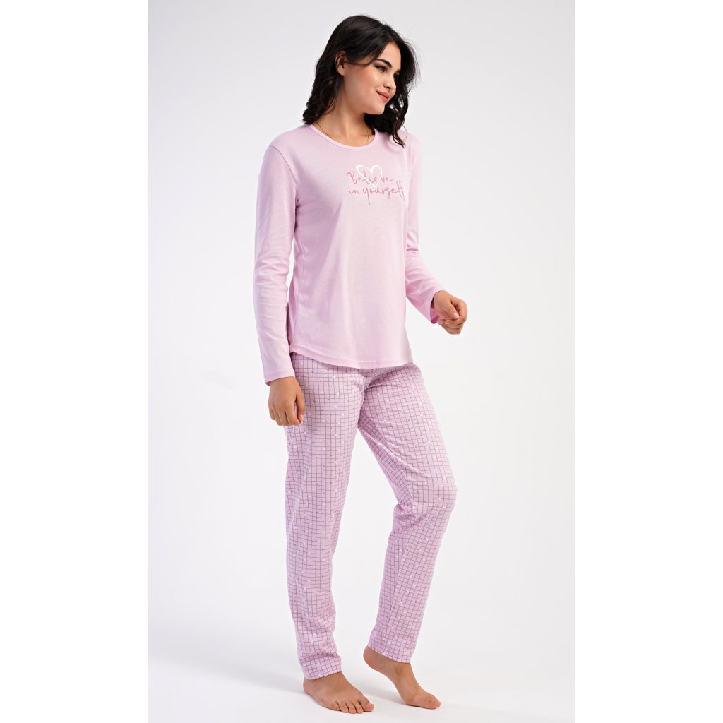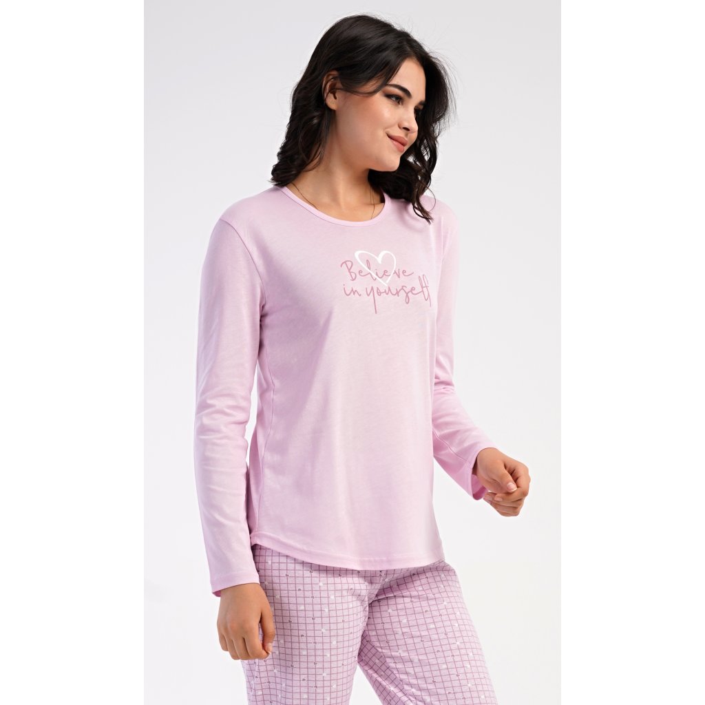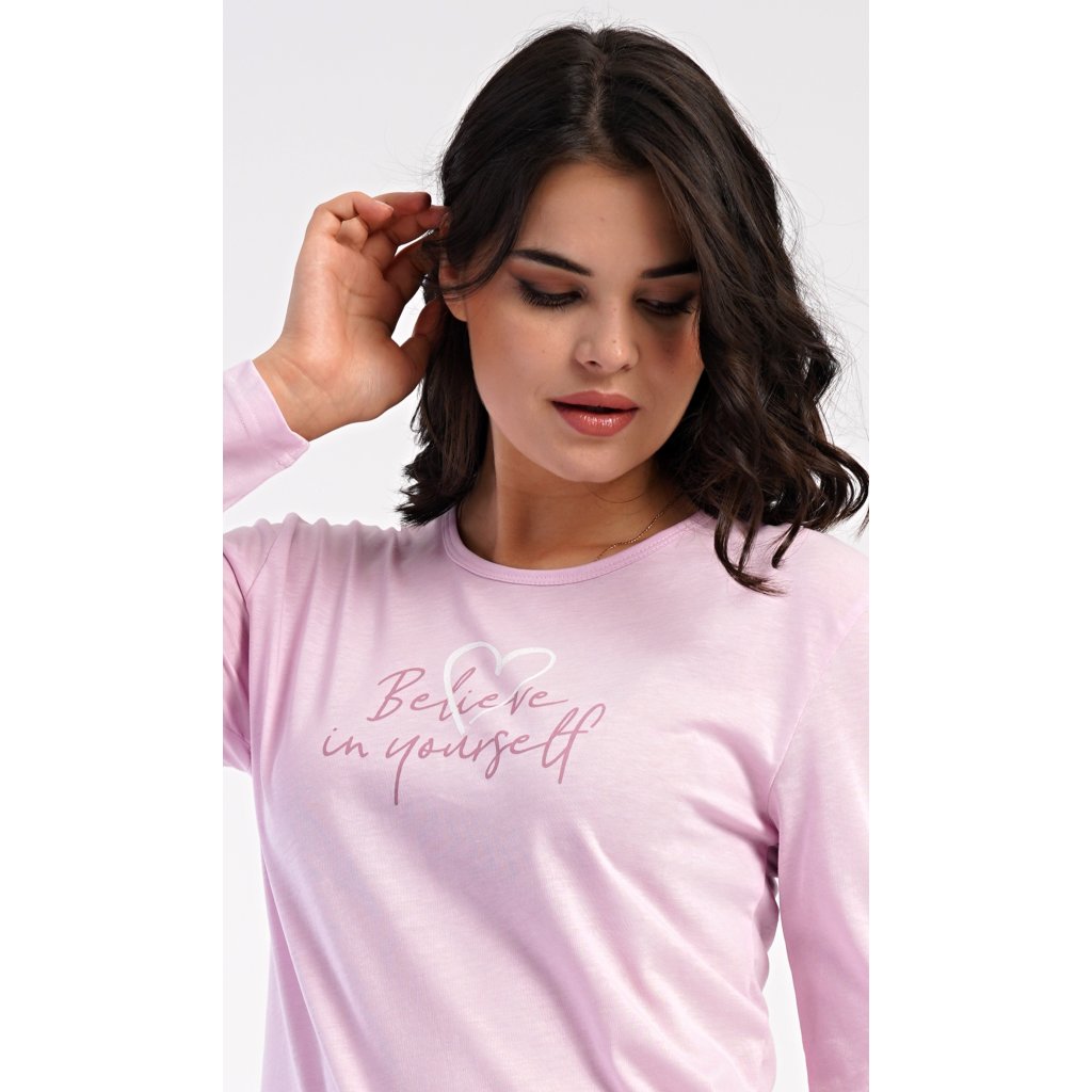 Dámské bavlněné dlouhé pyžamo Believe. Dámské pyžamo se skládá z trika s dlouhým rukávem a dlouhých kalhot. Jednobarevné triko je ozdobeno motivačním nápisem. Kalhoty potištěné srdíčky mají v pase gumu a šňůrku na stažení, nemají kapsy. Použitý bavlněný materiál je poddajný a příjemný na dotek.