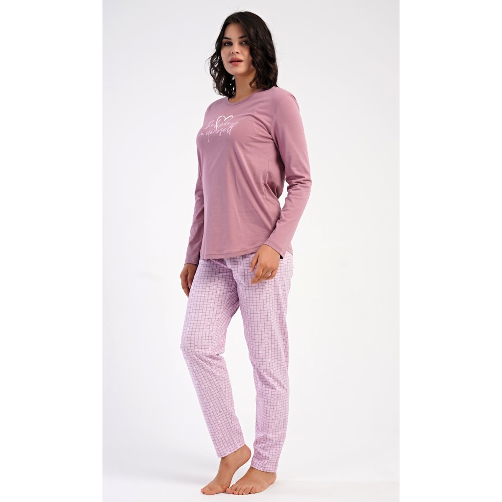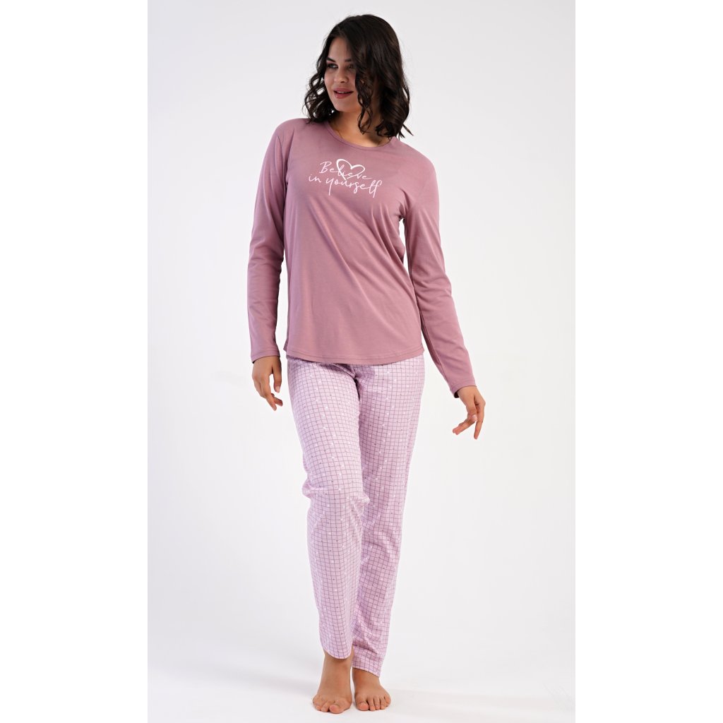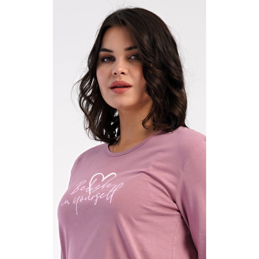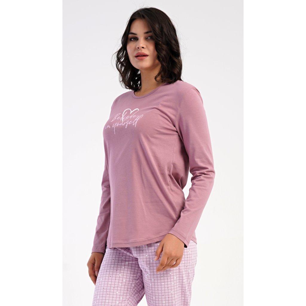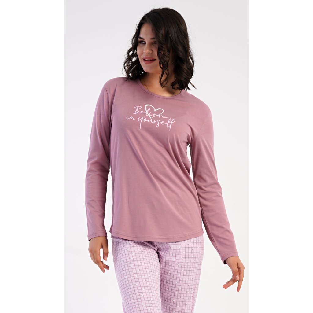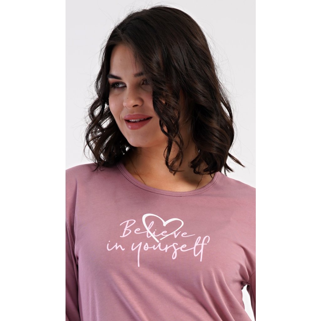 Dámské bavlněné dlouhé pyžamo Believe. Dámské pyžamo se skládá z trika s dlouhým rukávem a dlouhých kalhot. Jednobarevné triko je ozdobeno motivačním nápisem. Kalhoty potištěné srdíčky mají v pase gumu a šňůrku na stažení, nemají kapsy. Použitý bavlněný materiál je poddajný a příjemný na dotek.
