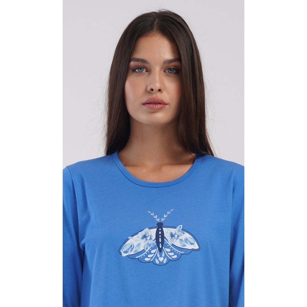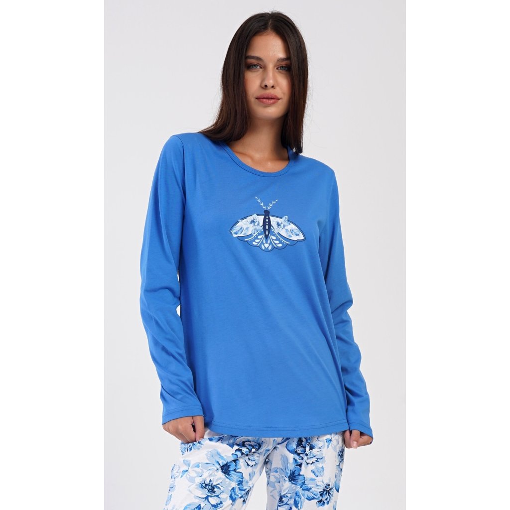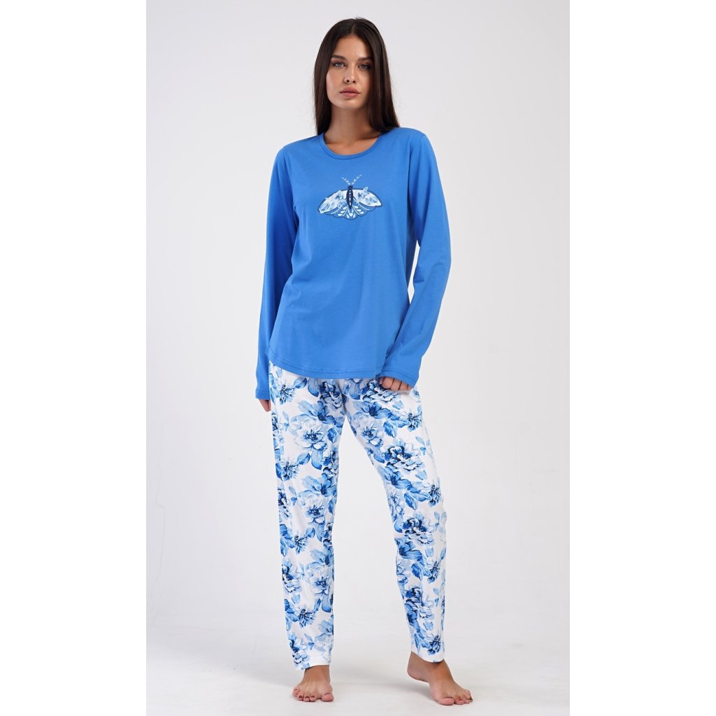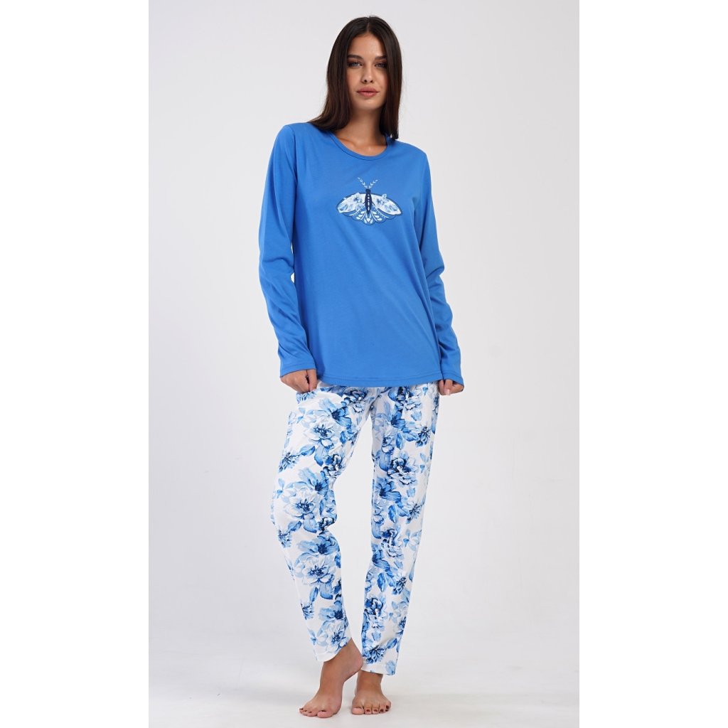 Dámské dlouhé bavlněné pyžamo Dominika. Dámské pyžamo se skládá z trika s dlouhým rukávem a dlouhých kalhot. Triko je jednobarevné, zdobené obrázkem motýla a květů. Květinový potisk se opakuje i na kalhotách, které mají v pase gumu a šňůrku na stažení, nemají kapsy. Použitý bavlněný materiál je poddajný a příjemný na dotek.