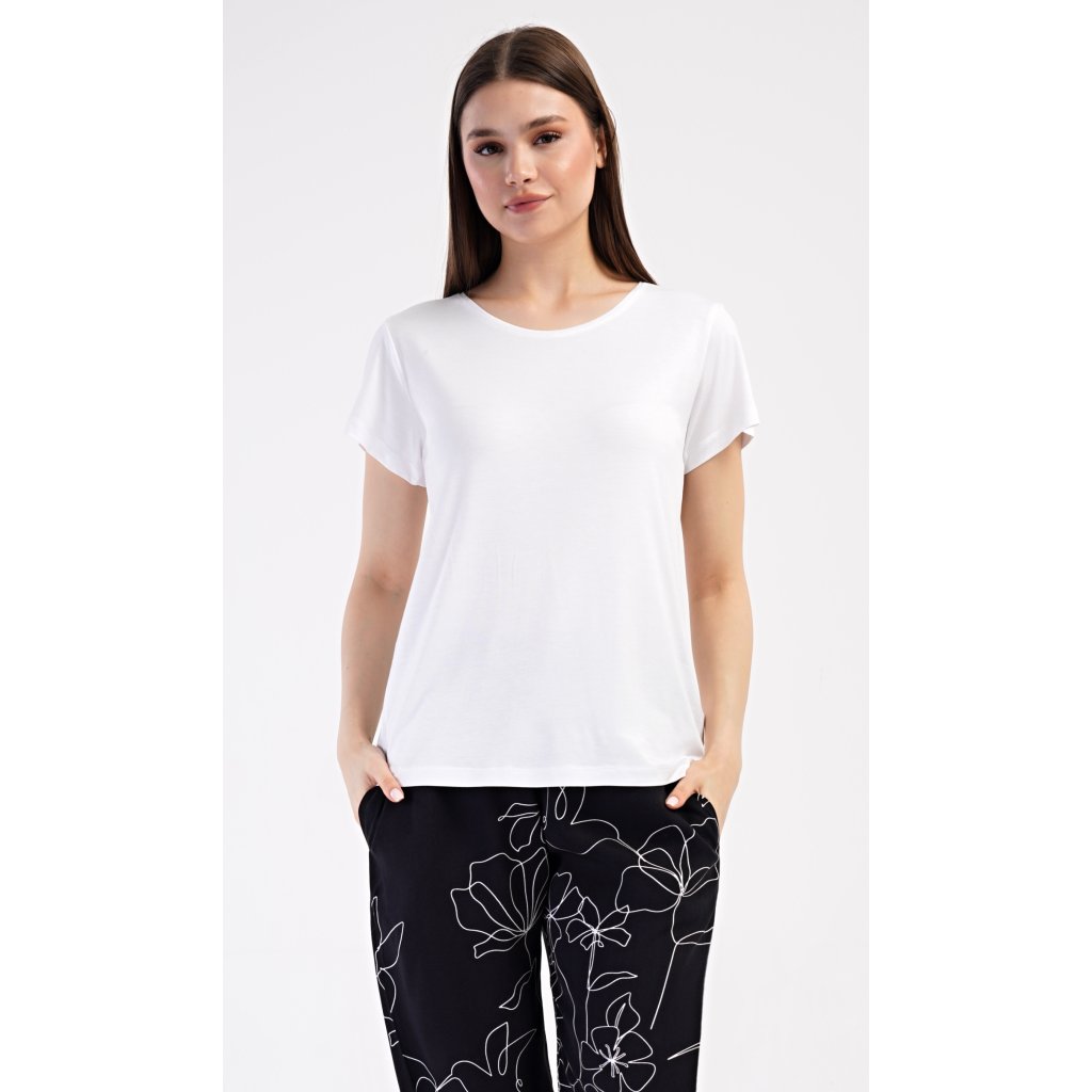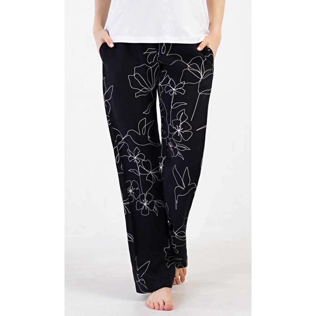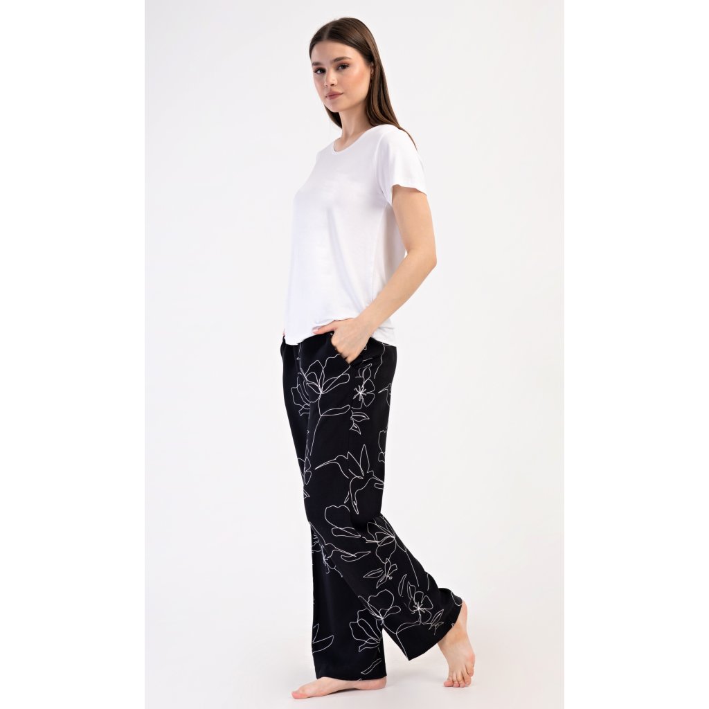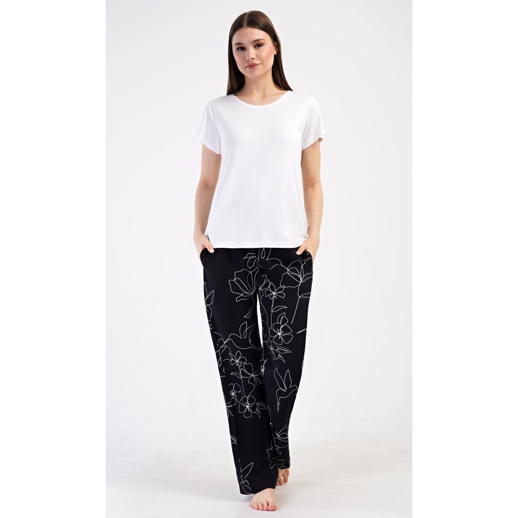 Dámské pyžamo s krátkým rukávem Fiona. Dámské pyžamo se skládá z trika s krátkým rukávem a dlouhých kalhot. Triko je jednobarevné, bez potisku, má kulatý výstřih. Kalhoty potištěné květinovým vzorem mají v pase gumu a šňůrku na stažení, nemají kapsy. Použitý viskózový materiál je poddajný a příjemný na dotek.
