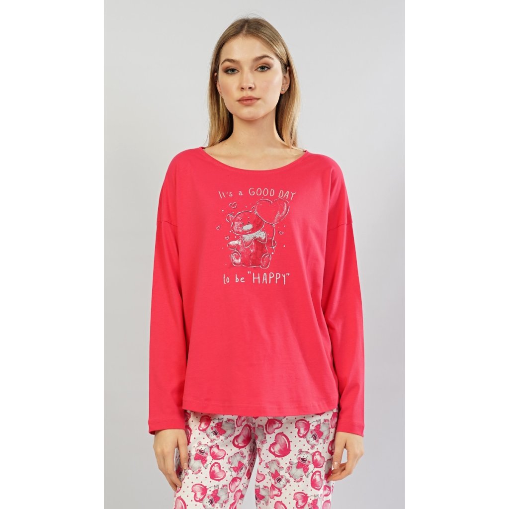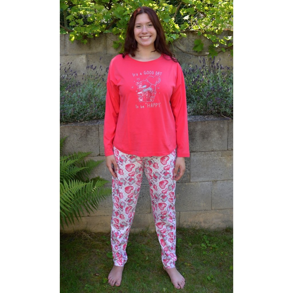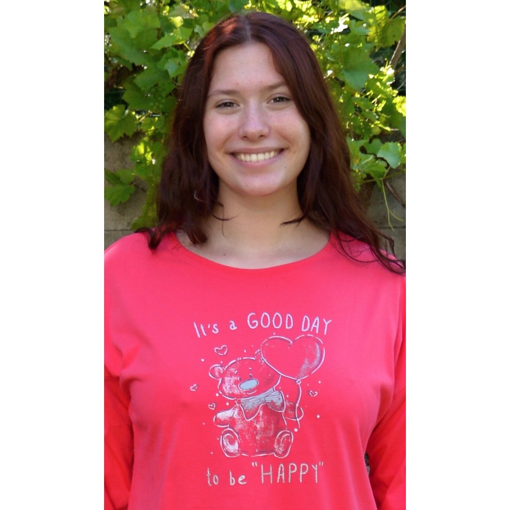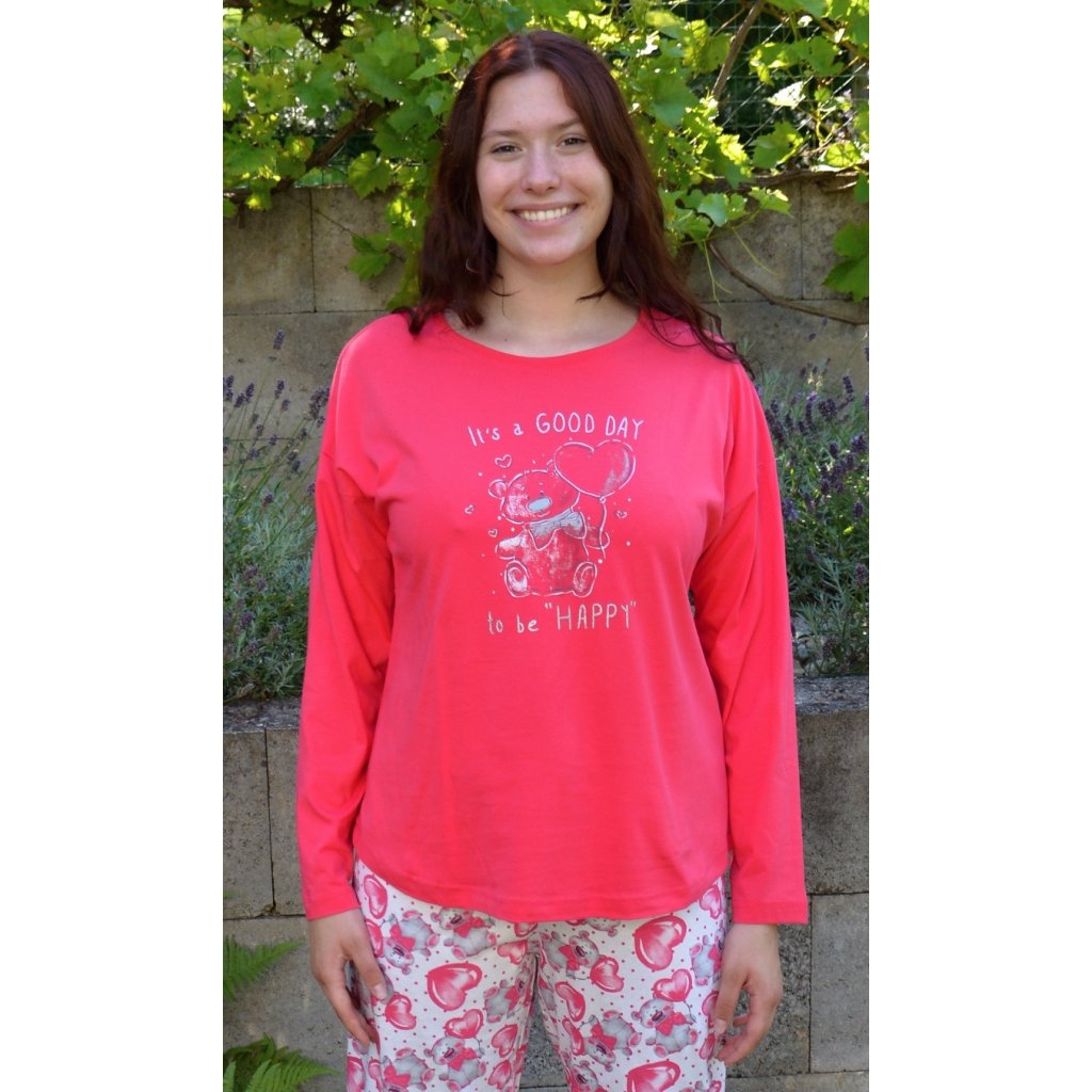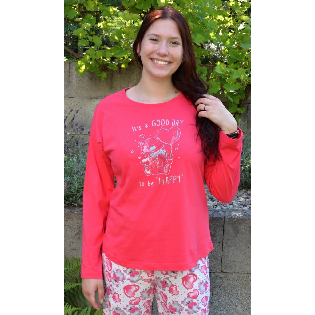 Dámské pyžamo dlouhé Good day. Dámské pyžamo se skládá z trička s dlouhým rukávem a dlouhých kalhot. Triko je jednobarevné, s obrázkem medvídka sedícího mezi srdíčky a stříbrným nápisem 'It´s a GOOD DAY to be HAPPY'. Kalhoty jsou potištěny medvídky se srdíčky. Mají v pase gumu a šňůrku na stažení, nemají kapsy. Použitý materiál je poddajný a příjemný na dotek. Triko je složeno ze 100% bavlnou u jahodové barvy a ze 70% u šedé barvy, kalhoty mají obsah bavlny 100%.
