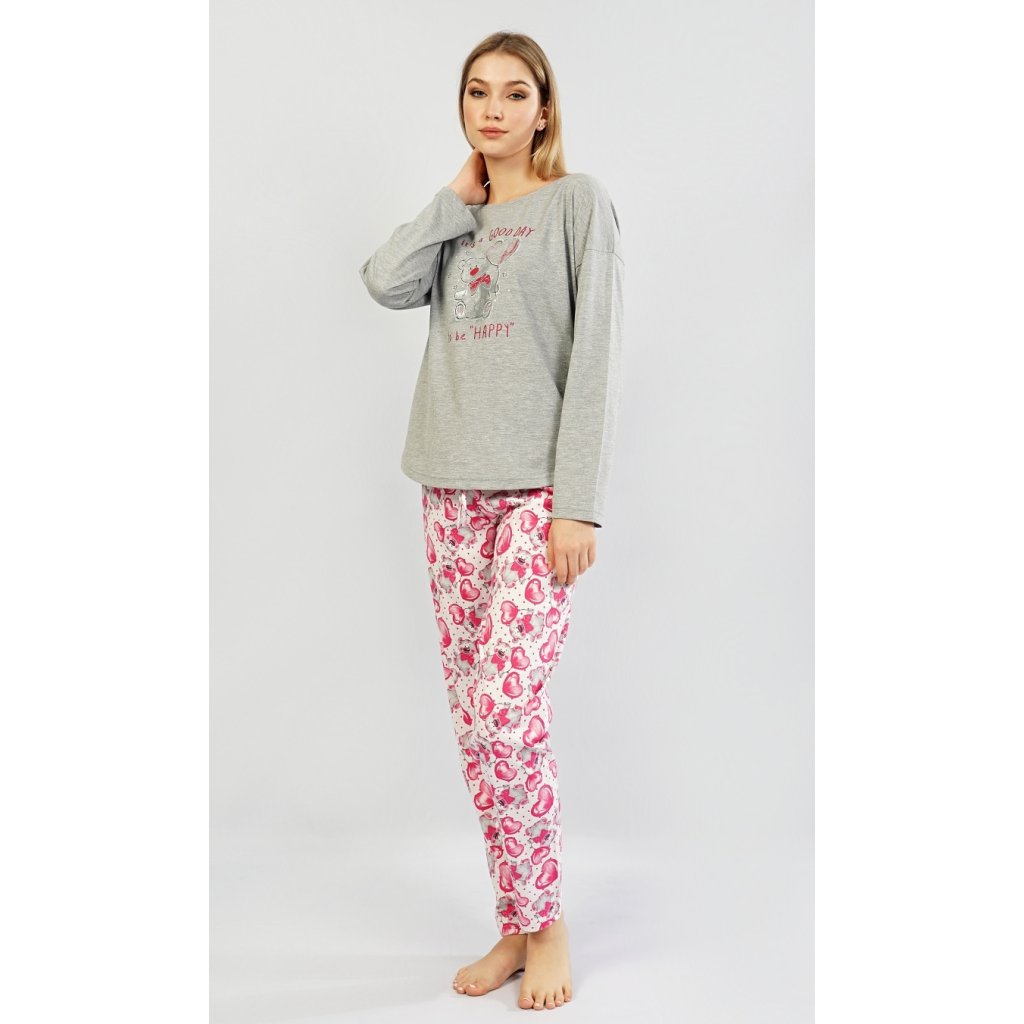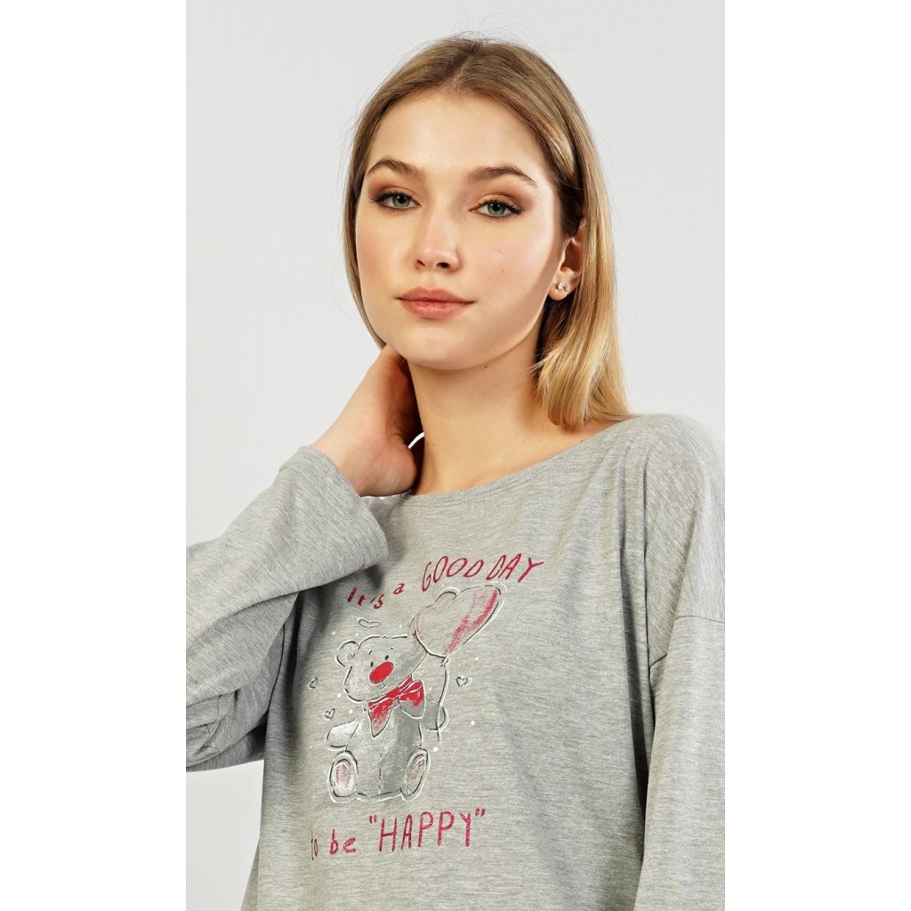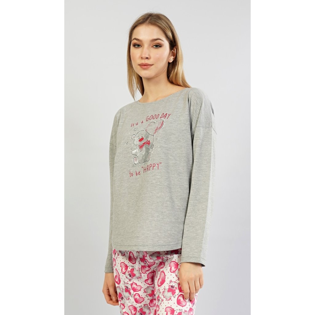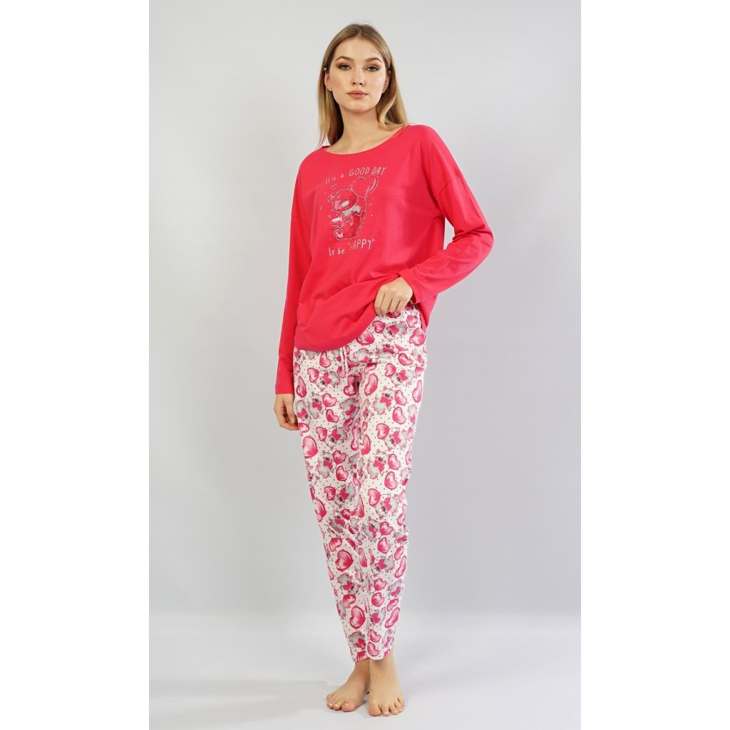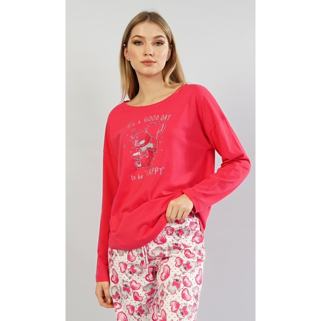 Dámské pyžamo dlouhé Good day. Dámské pyžamo se skládá z trička s dlouhým rukávem a dlouhých kalhot. Triko je jednobarevné, s obrázkem medvídka sedícího mezi srdíčky a stříbrným nápisem 'It´s a GOOD DAY to be HAPPY'. Kalhoty jsou potištěny medvídky se srdíčky. Mají v pase gumu a šňůrku na stažení, nemají kapsy. Použitý materiál je poddajný a příjemný na dotek. Triko je složeno ze 100% bavlnou u jahodové barvy a ze 70% u šedé barvy, kalhoty mají obsah bavlny 100%.