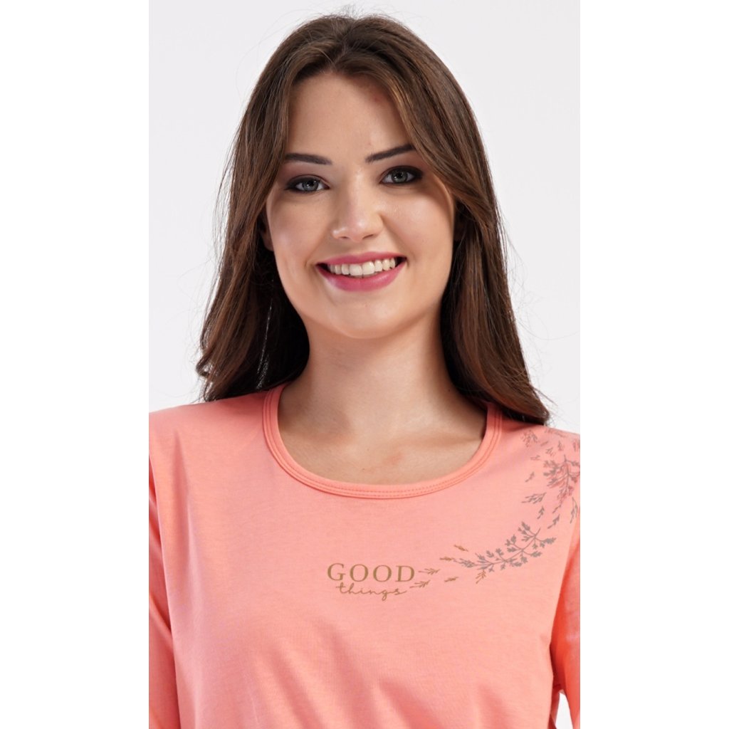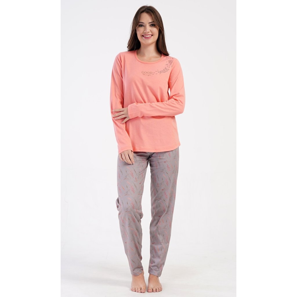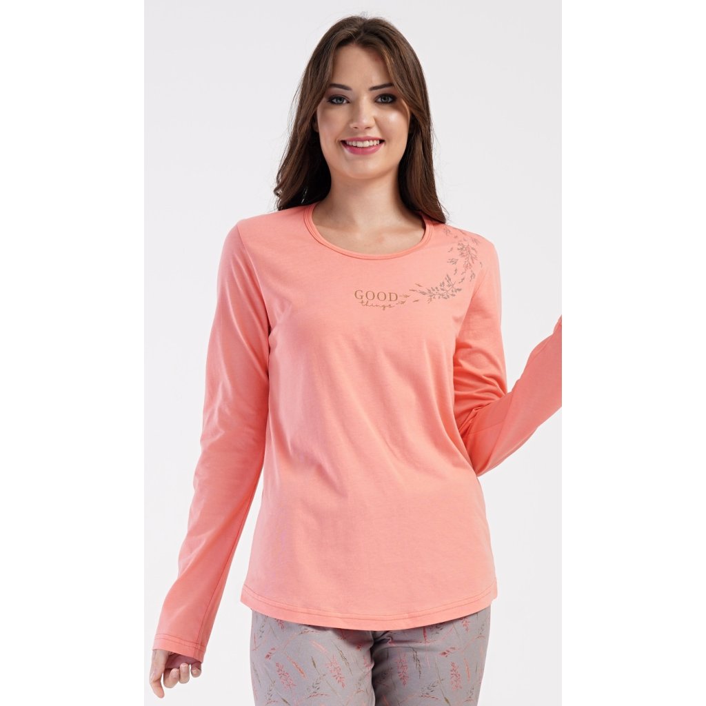 Dámské bavlněné dlouhé pyžamo Good things. Dámské pyžamo se skládá z trika s dlouhým rukávem a dlouhých kalhot. Triko je jednobarevné, zdobené menším obrázkem a nápisem 'Good things'. Kalhoty mají v pase gumu a šňůrku na stažení, nemají kapsy. Použitý bavlněný materiál je poddajný a příjemný na dotek.