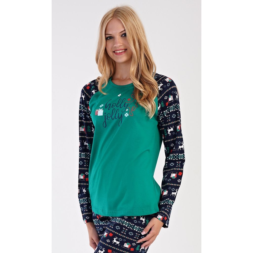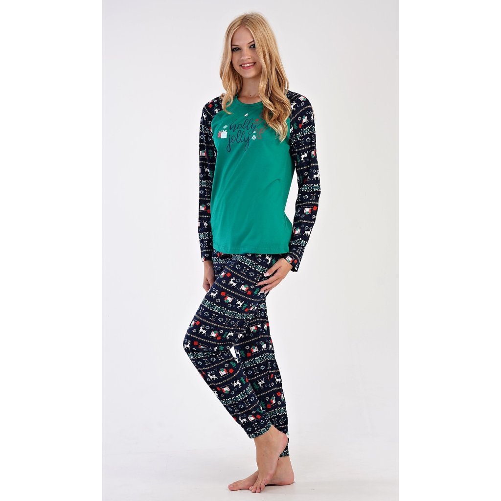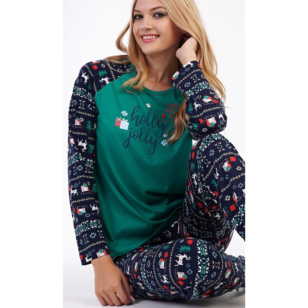 Dámské bavlněné pyžamo dlouhé Holly Jolly. Dámské pyžamo se skládá z trika s dlouhým rukávem a dlouhých kalhot. Triko je ozdobené nápisem HOLLY JOLLY a obrázky vánočních dárků. Kalhoty i rukávy jsou potištěné vánočními motivy. Kalhoty mají v pase gumu, šňůrku na stažení a jsou zakončené lemy. Použitý materiál je poddajný a jemný na dotek. Kalhoty i triko je složeno ze 100% bavlnou.