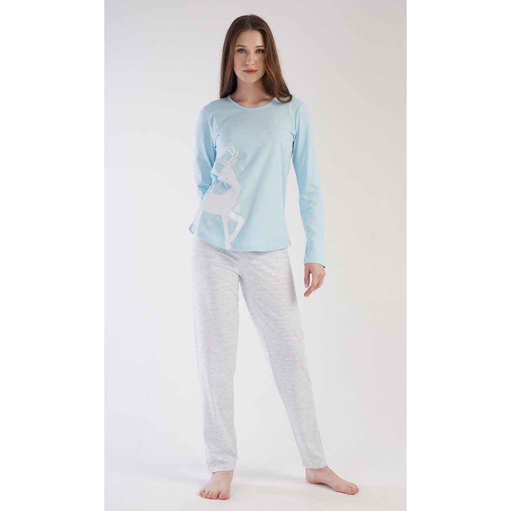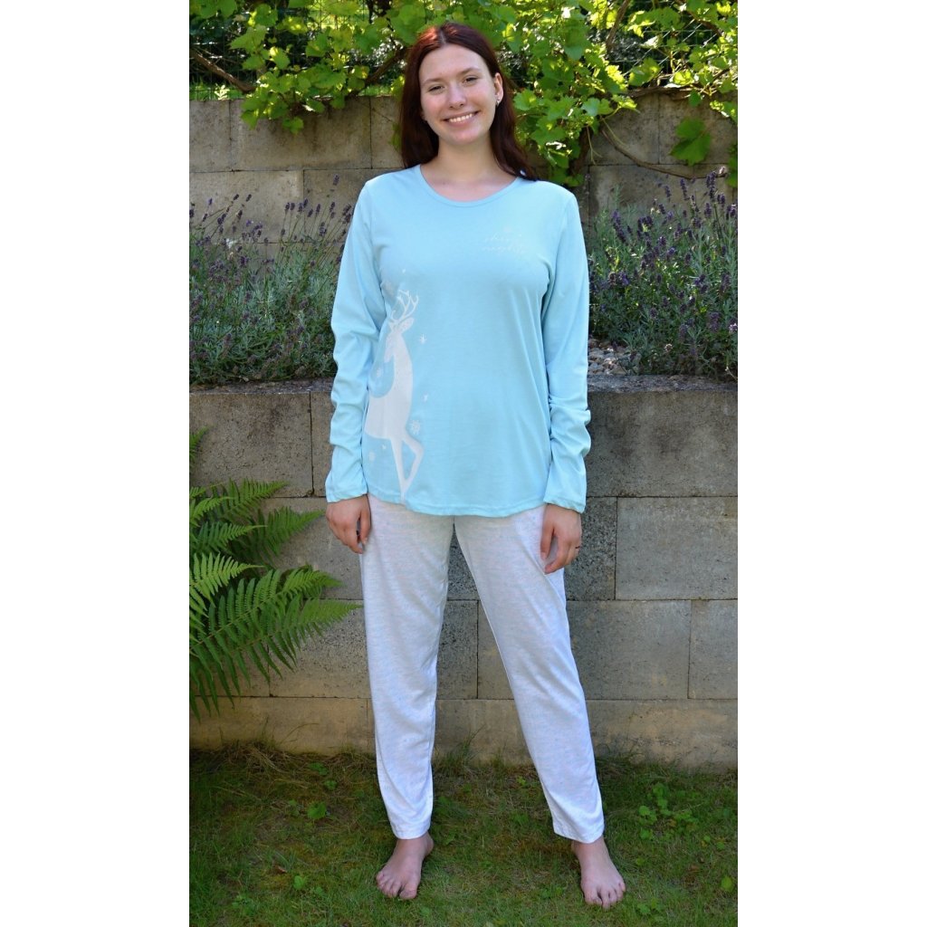 Dámské pyžamo dlouhé Jelen. Dámské pyžamo se skládá z trika s dlouhým rukávem a dlouhých kalhot. Triko je jednobarevné, zdobené obrázkem bílého jelena a jemným nápisem SHINE NIGHTS. Kalhoty jsou světle šedé, potištěné modrými nápisy. Kalhoty mají v pase gumu a šňůrku na stažení. Použitý materiál je poddajný a příjemný na dotek. Triko je složeno ze 100% bavlnou, kalhoty mají obsah bavlny 70%.