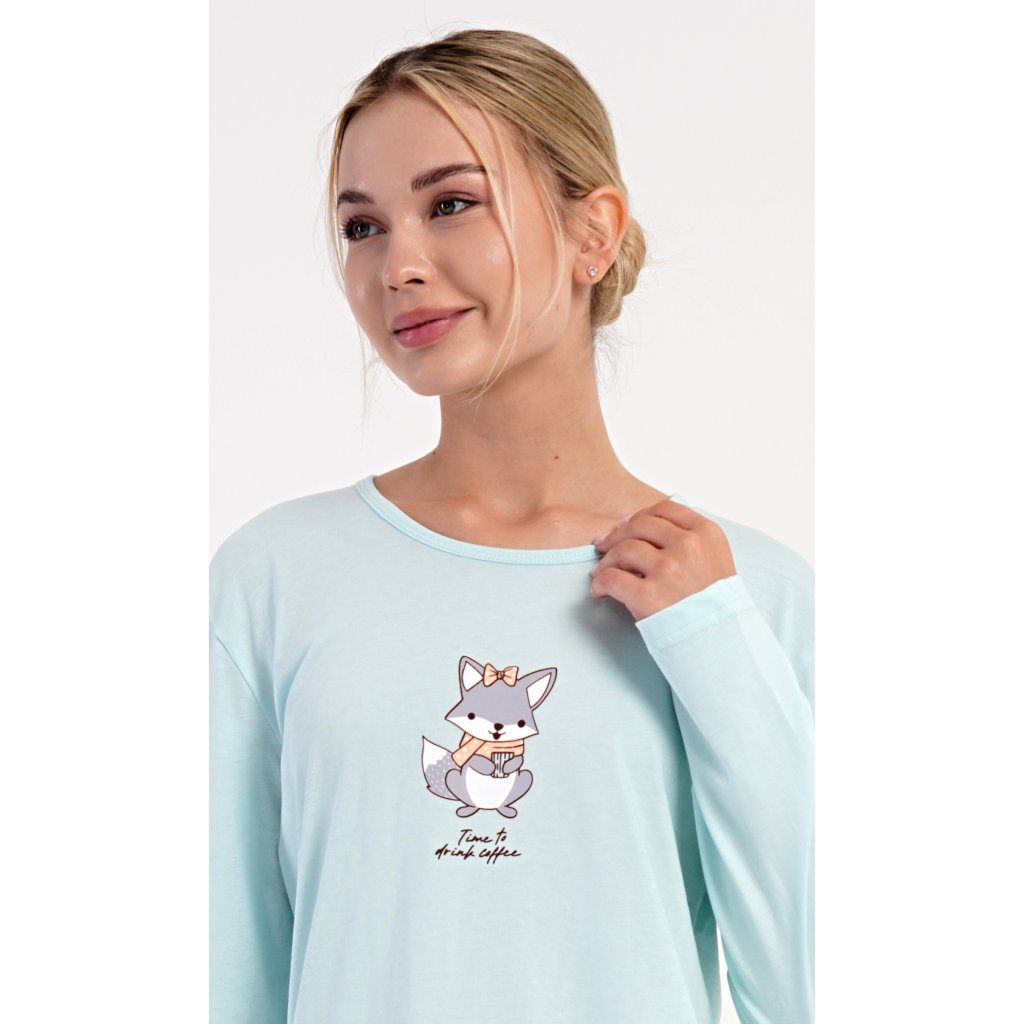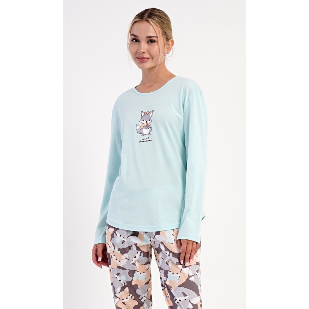 Dámské bavlněné dlouhé pyžamo Jezevec. Dámské pyžamo se skládá z trika s dlouhým rukávem a dlouhých kalhot. Triko s kulatým výstřihem je na hrudi zdobeno obrázkem malého jezevce. Tento motiv se opakuje i na kalhotách, které mají v pase gumu a šňůrku na stažení, nemají kapsy. Použitý bavlněný materiál je poddajný a příjemný na dotek.