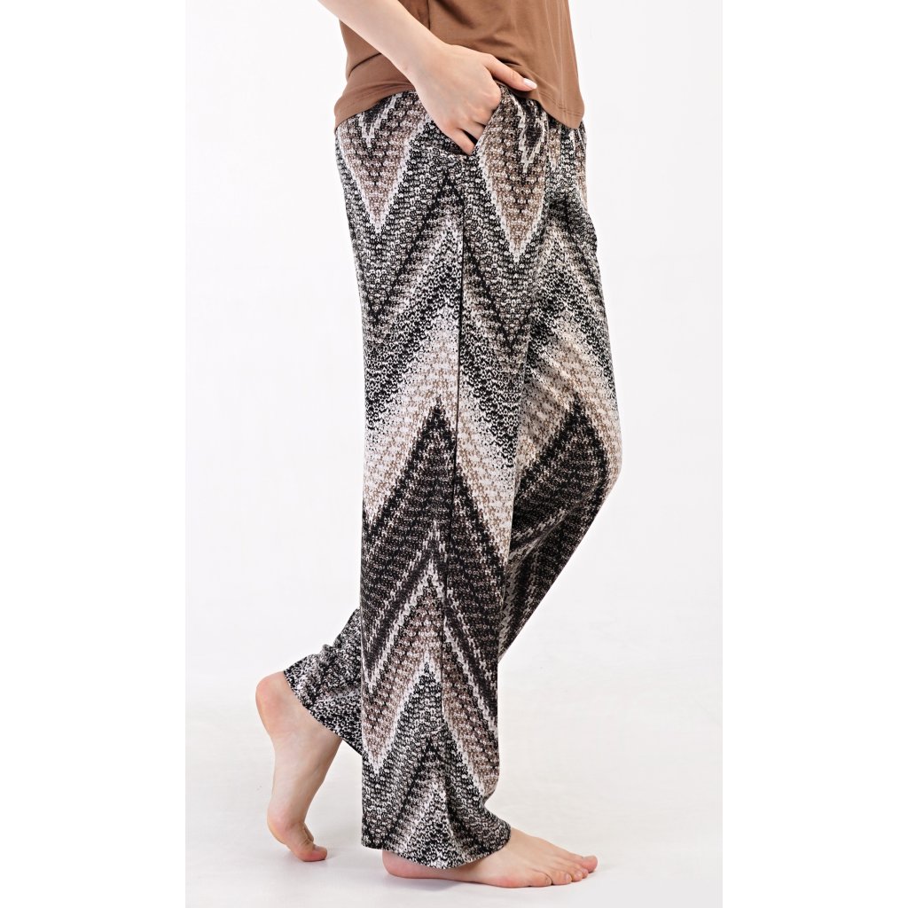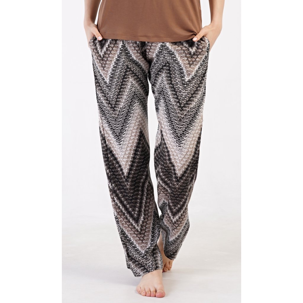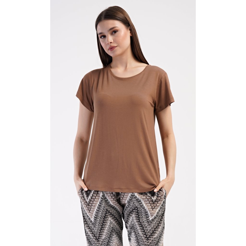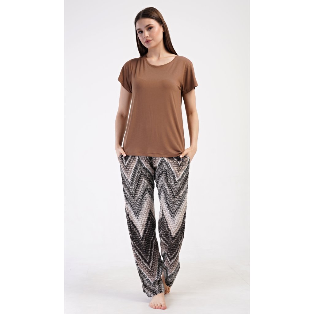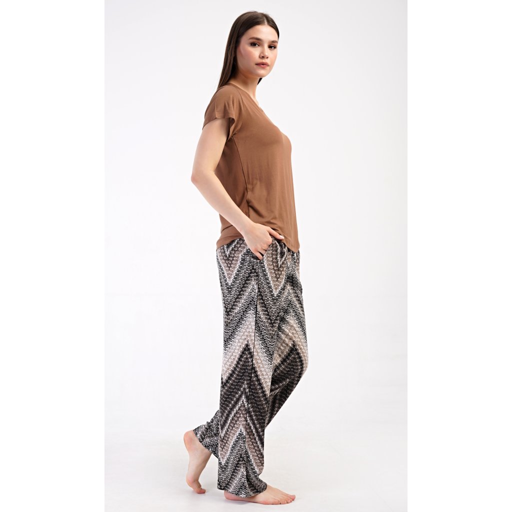 Dámské pyžamo s krátkým rukávem Julie. Dámské pyžamo se skládá z trika s krátkým rukávem a dlouhých kalhot. Triko je jednobarevné, bez potisku, má kulatý výstřih. Kalhoty potištěné geometrickým vzorem mají v pase gumu a šňůrku na stažení, nemají kapsy. Použitý viskózový materiál je poddajný a příjemný na dotek.