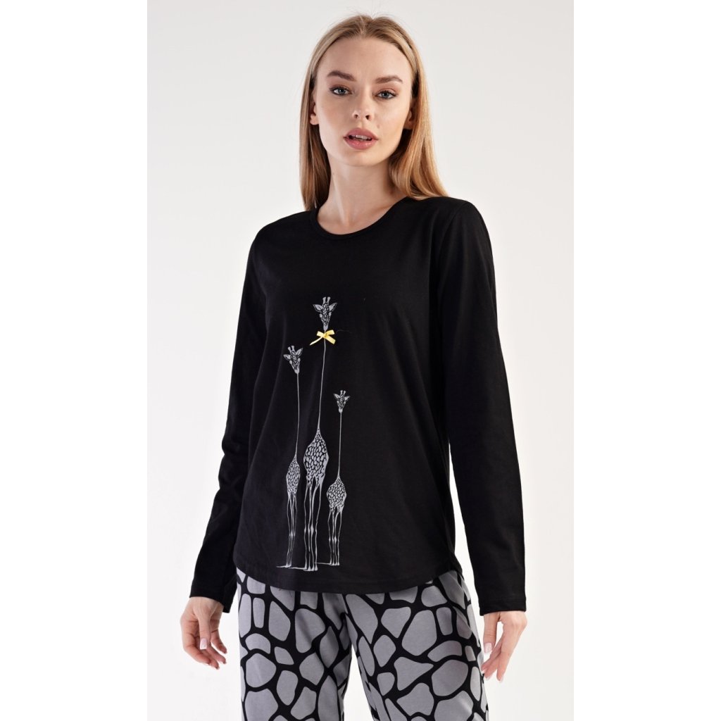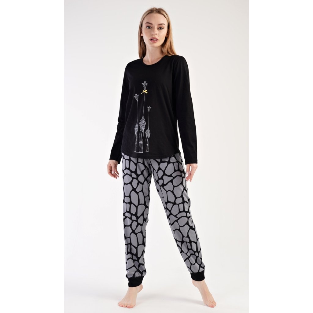 Dámské bavlněné pyžamo dlouhé Matylda. Dámské pyžamo se skládá z trika s dlouhým rukávem a dlouhých kalhot, které jsou zakončené patenty. Triko je jednobarevné, zdobené obrázkem tří žiraf. Kalhoty jsou šedé, s žirafím vzorem, mají v pase gumu a šňůrku na stažení. Použitý materiál je poddajný a příjemný na dotek. Kalhoty i triko je složeno ze 100% bavlnou.