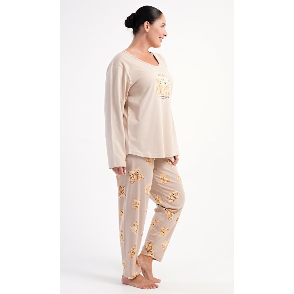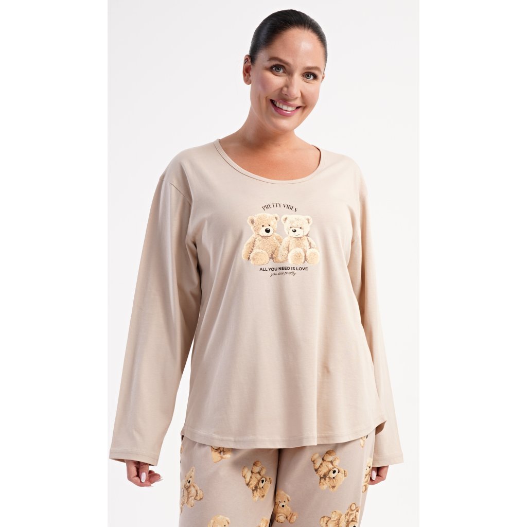 Dámské bavlněné dlouhé pyžamo Méďové. Dámské pyžamo se skládá z trika s dlouhým rukávem a dlouhých kalhot. Triko s kulatým výstřihem je na hrudi zdobeno obrázkem plyšových medvědů. Tento motiv se opakuje i na kalhotách, které mají v pase gumu a šňůrku na stažení, nemají kapsy. Použitý bavlněný materiál je poddajný a příjemný na dotek.