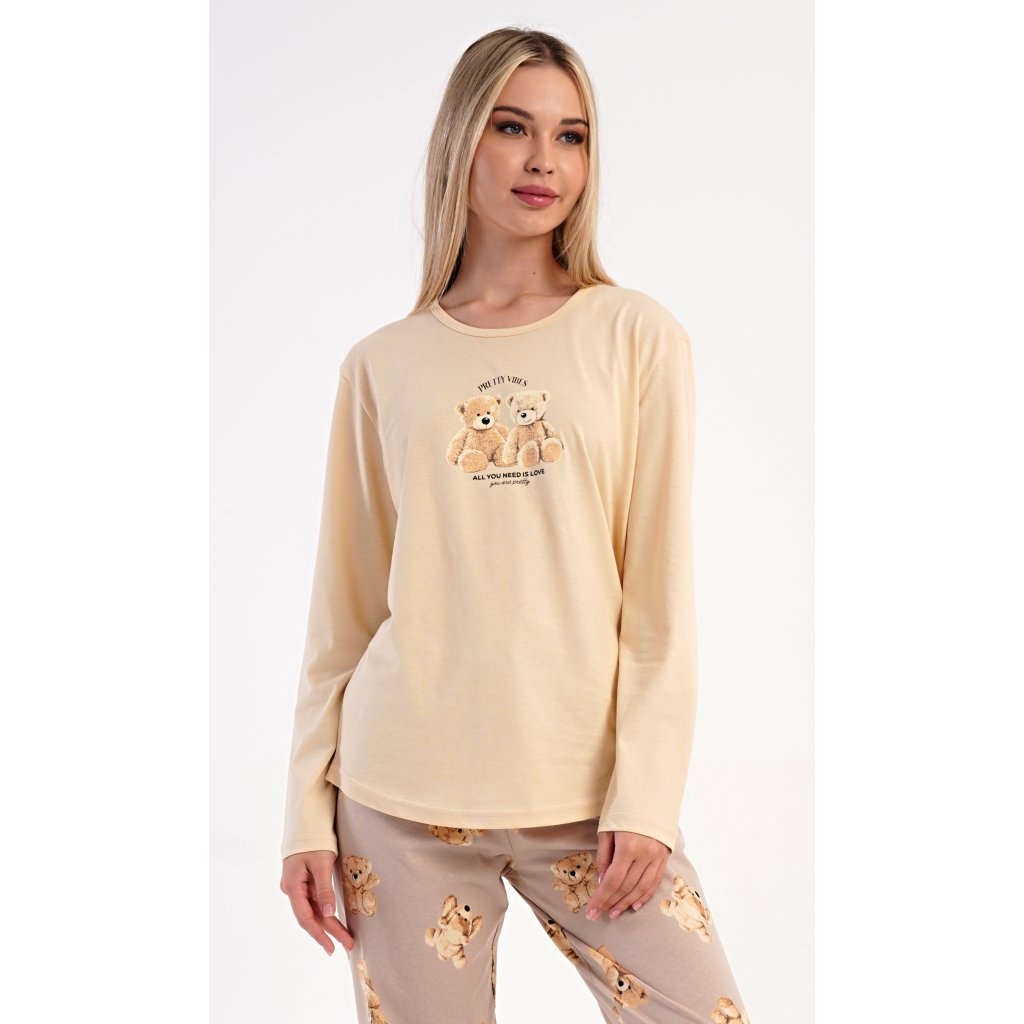 Dámské bavlněné dlouhé pyžamo Monika. Dámské pyžamo se skládá z trika s dlouhým rukávem a dlouhých kalhot. Triko s kulatým výstřihem je na hrudi zdobeno obrázkem plyšových medvědů. Tento motiv se opakuje i na kalhotách, které mají v pase gumu a šňůrku na stažení, nemají kapsy. Použitý bavlněný materiál je poddajný a příjemný na dotek.